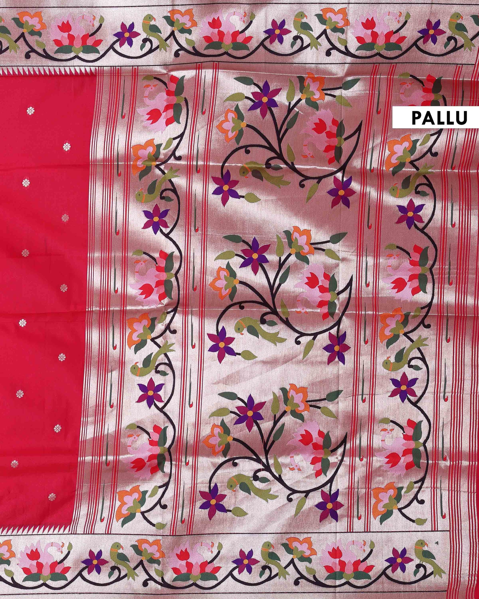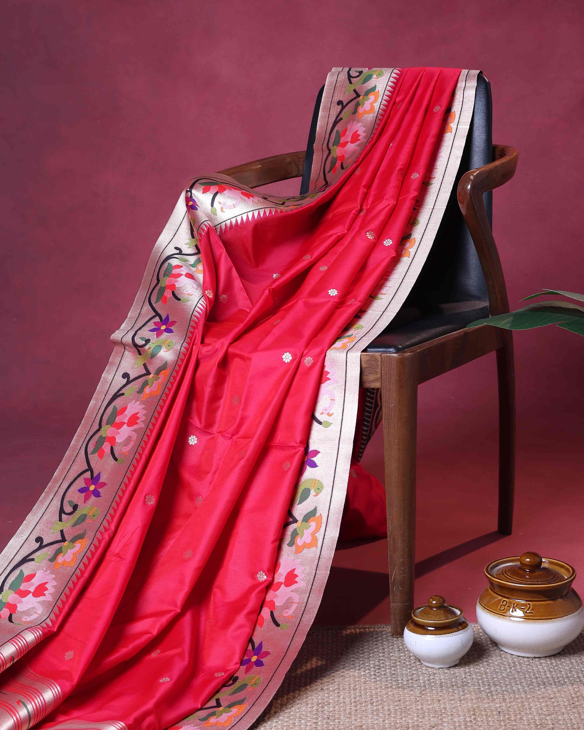 Elegant Paithani Silk Saree with Intricate Floral Motif Border and Delicate Butti Weave - Pink