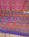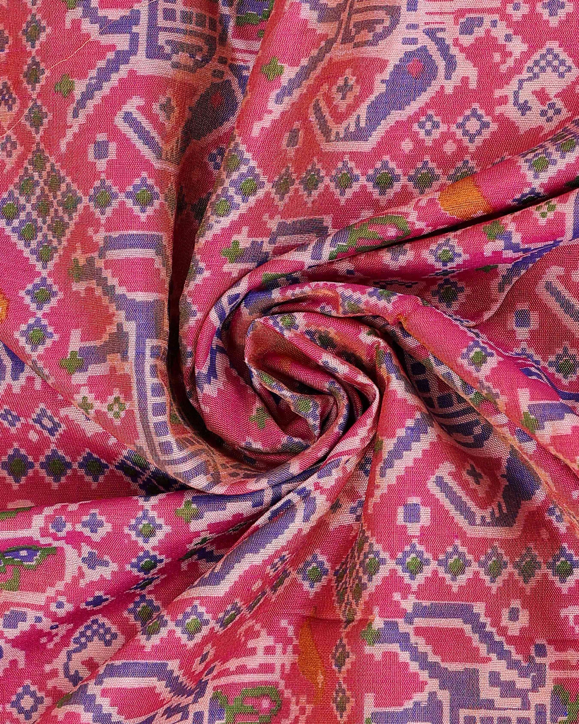 - Elevate your style with this exquisite Patola Silk Saree, a vibrant pink body adorned with traditional geometric motifs and a rich purple border with intricate patterns