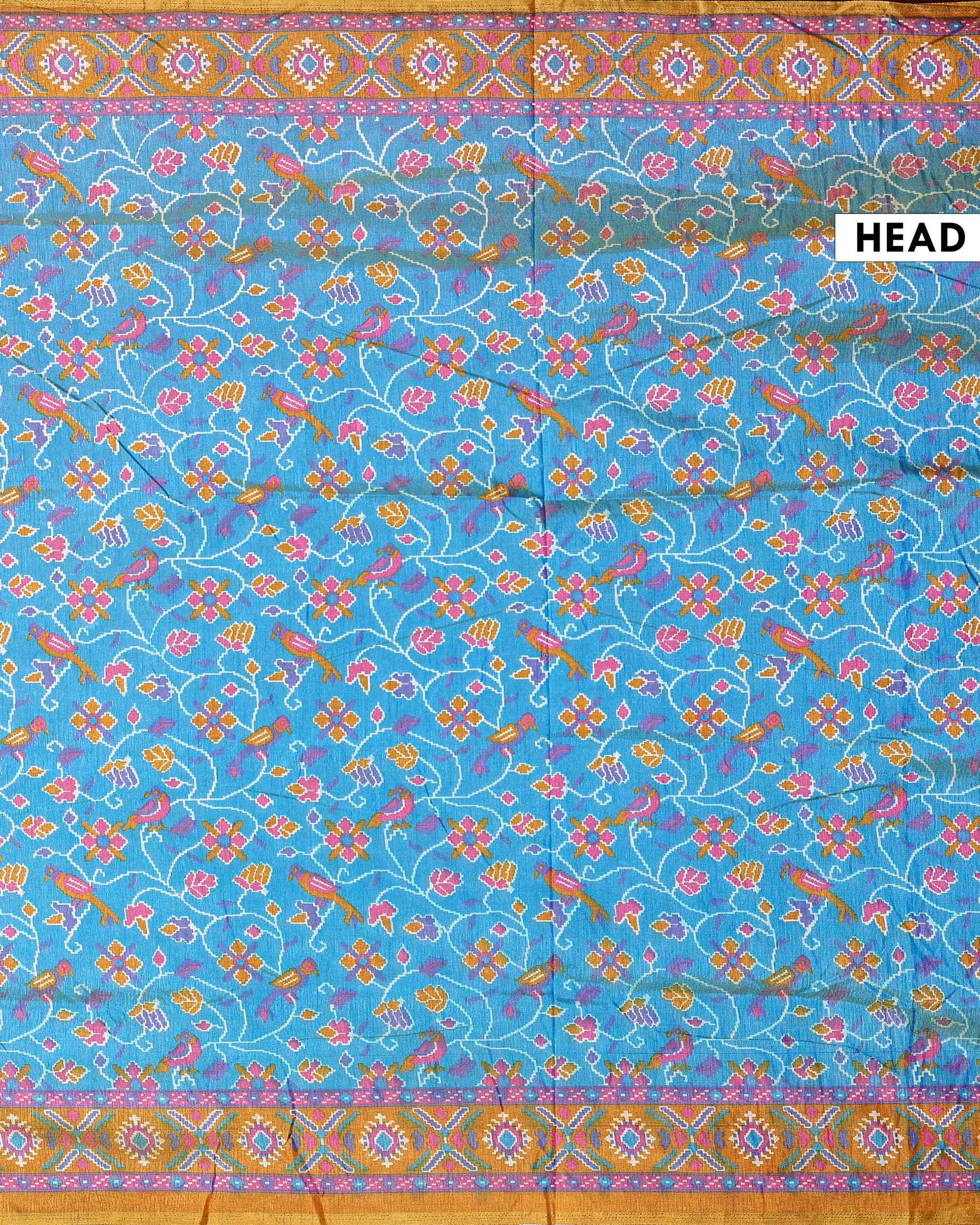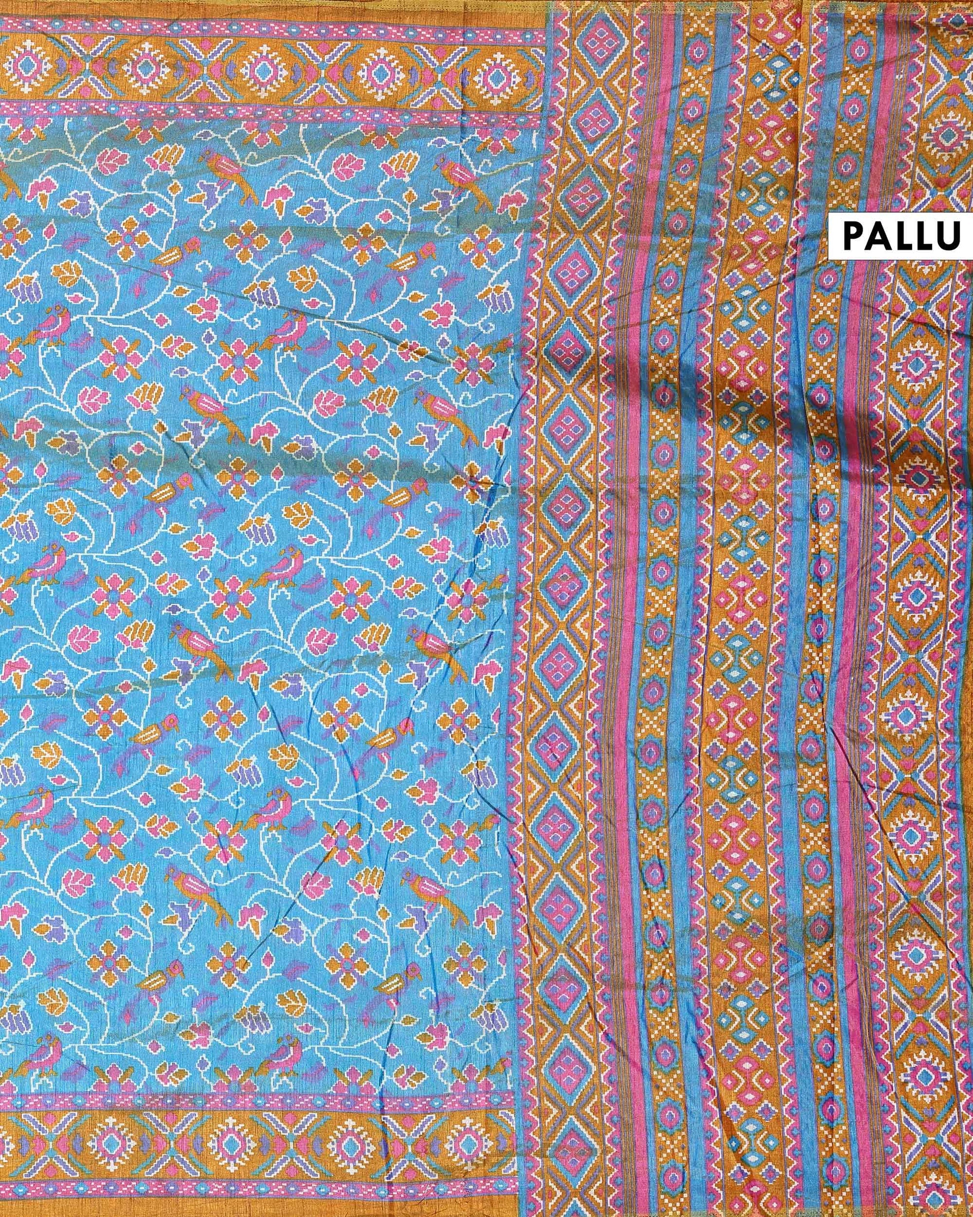 - This stunning Patola silk saree features a vibrant Blue body with traditional patterns. a perfect blend of heritage and style.