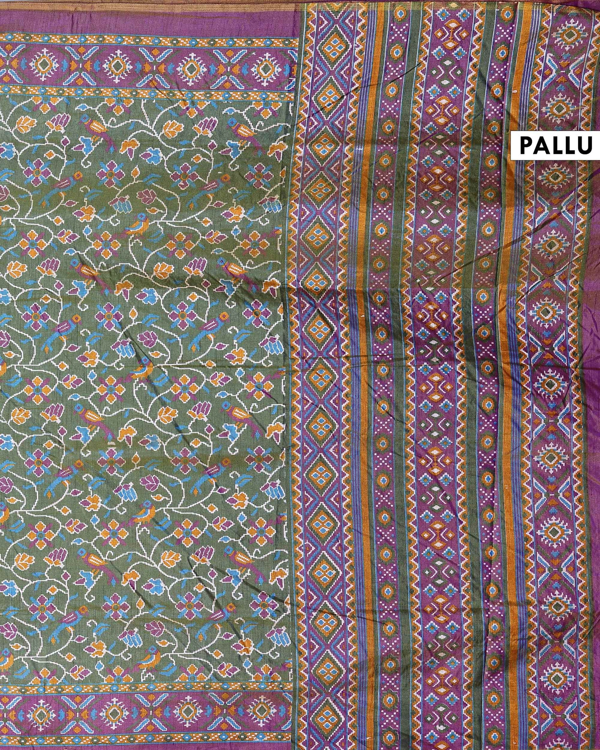 - This stunning Patola silk saree features a vibrant Green body with traditional patterns. a perfect blend of heritage and style.
