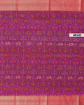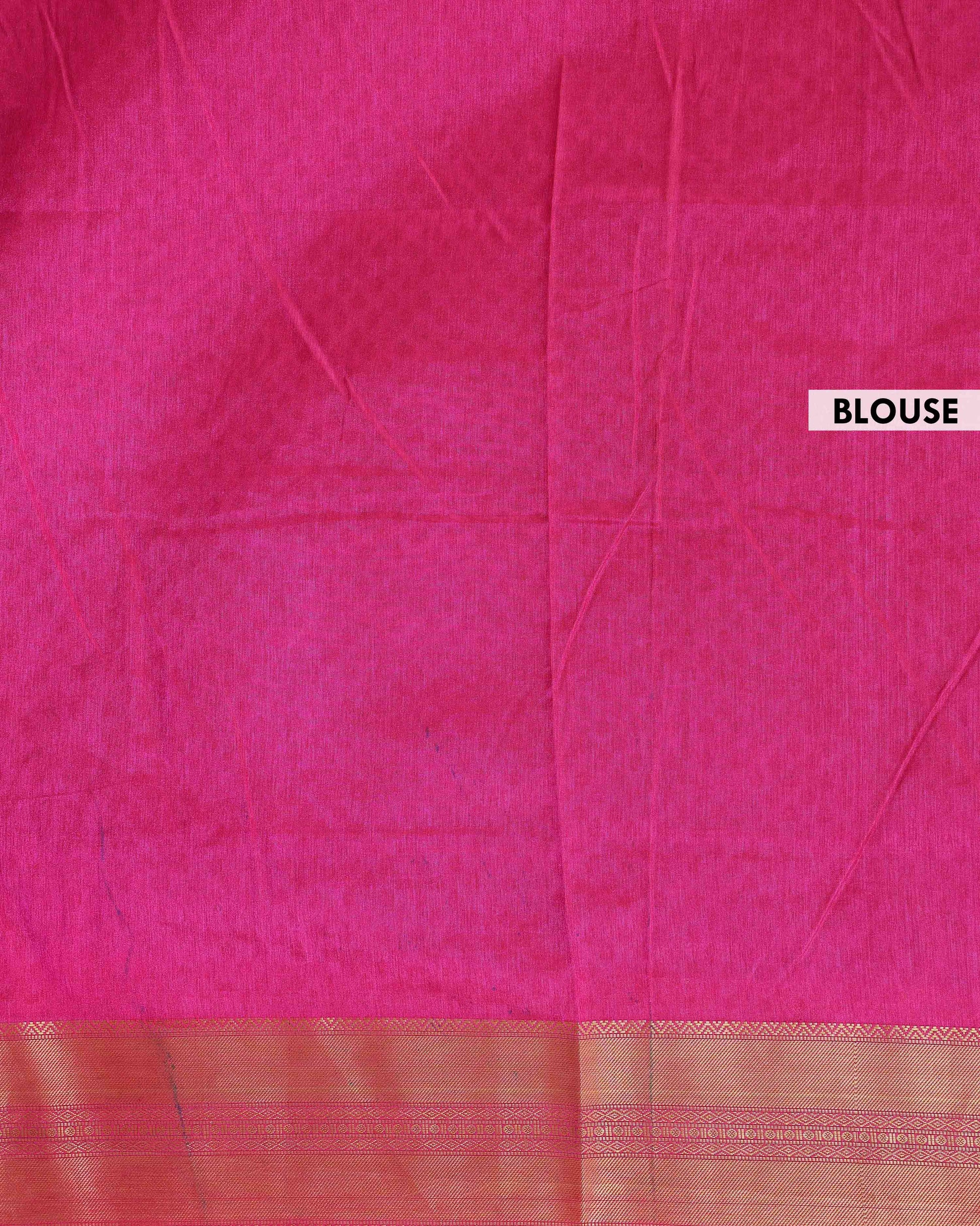 The saree is complemented by a striking pink and gold zari border