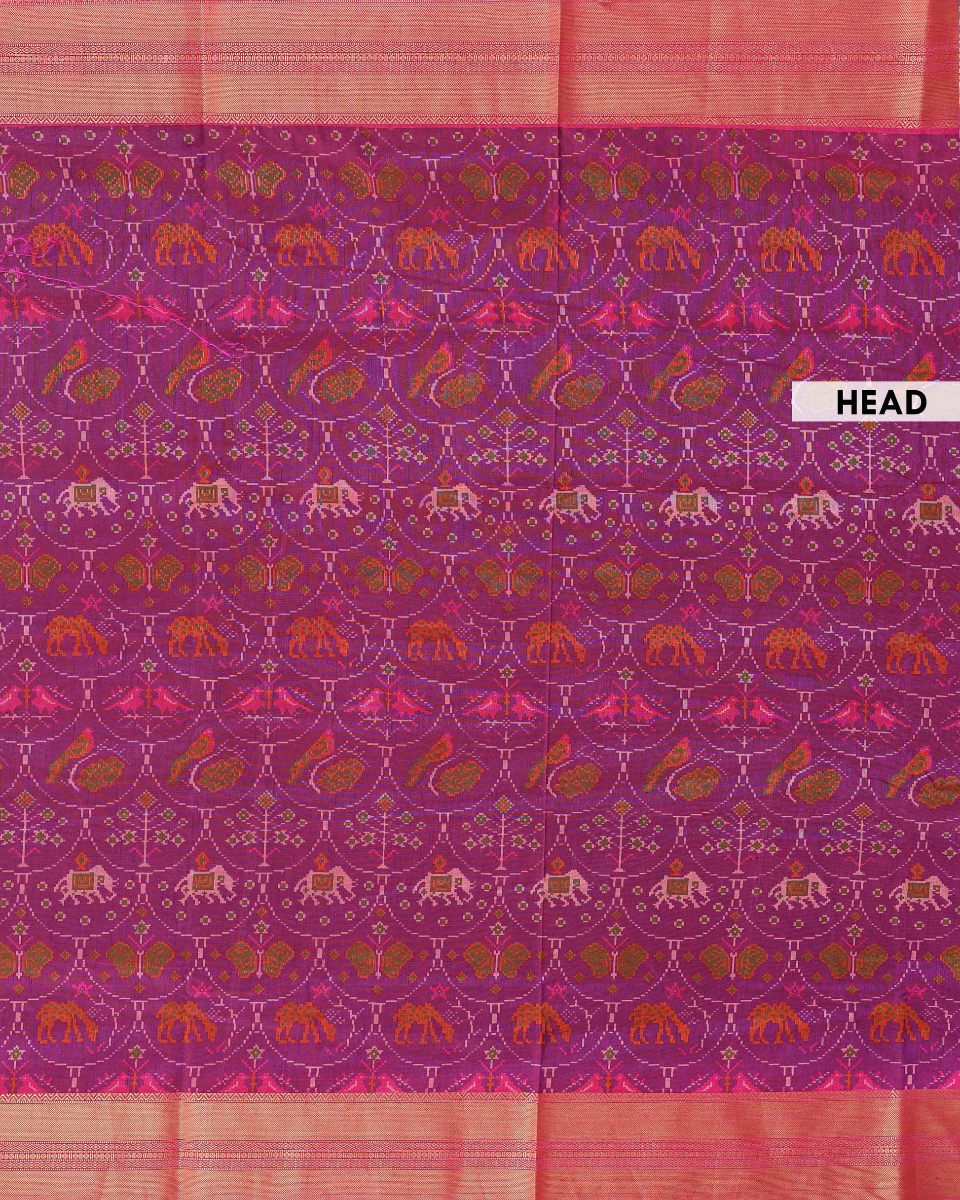 - This exquisite Patola silk saree a vibrant Purple body with traditional double ikkat motifs of elephants and flowers