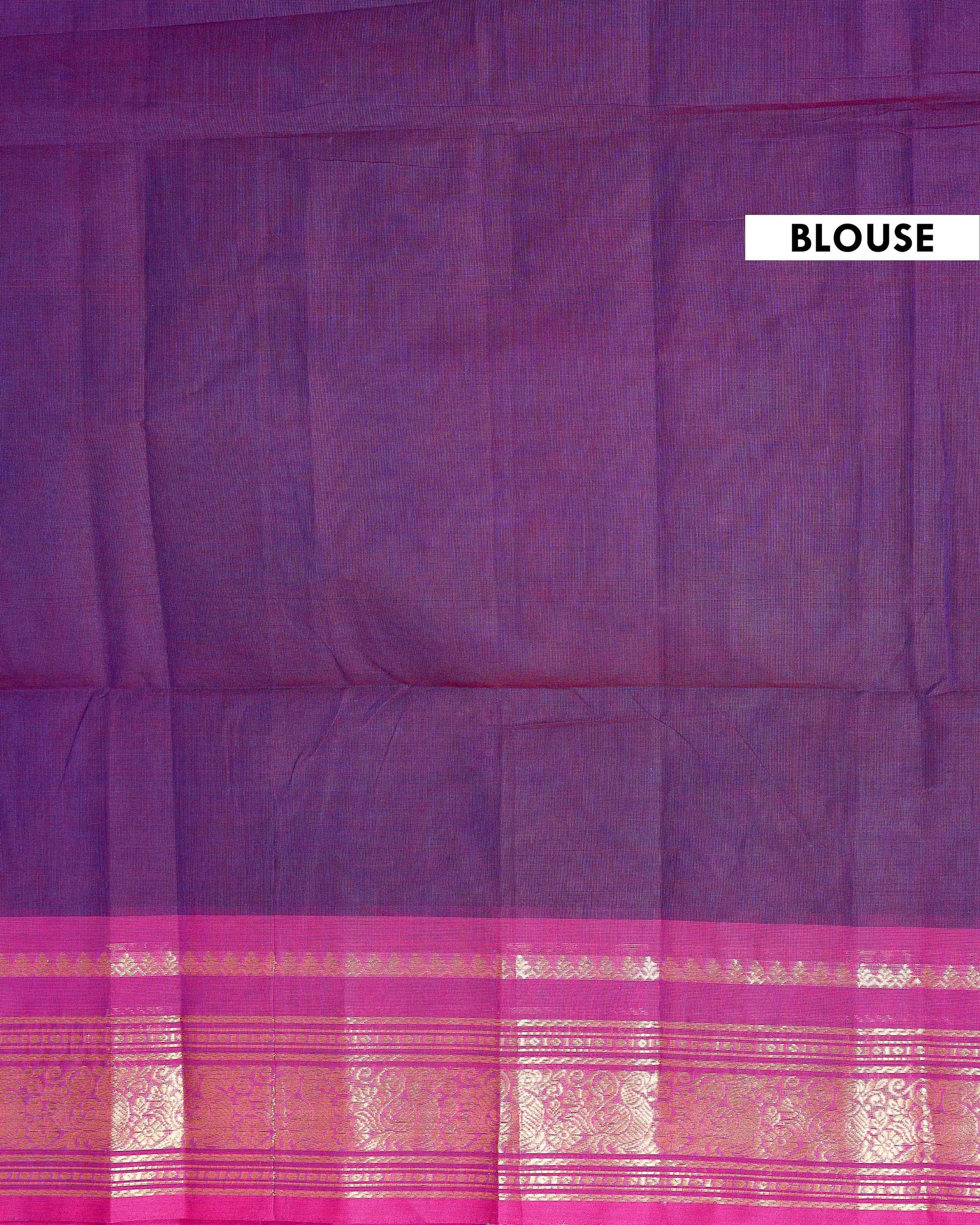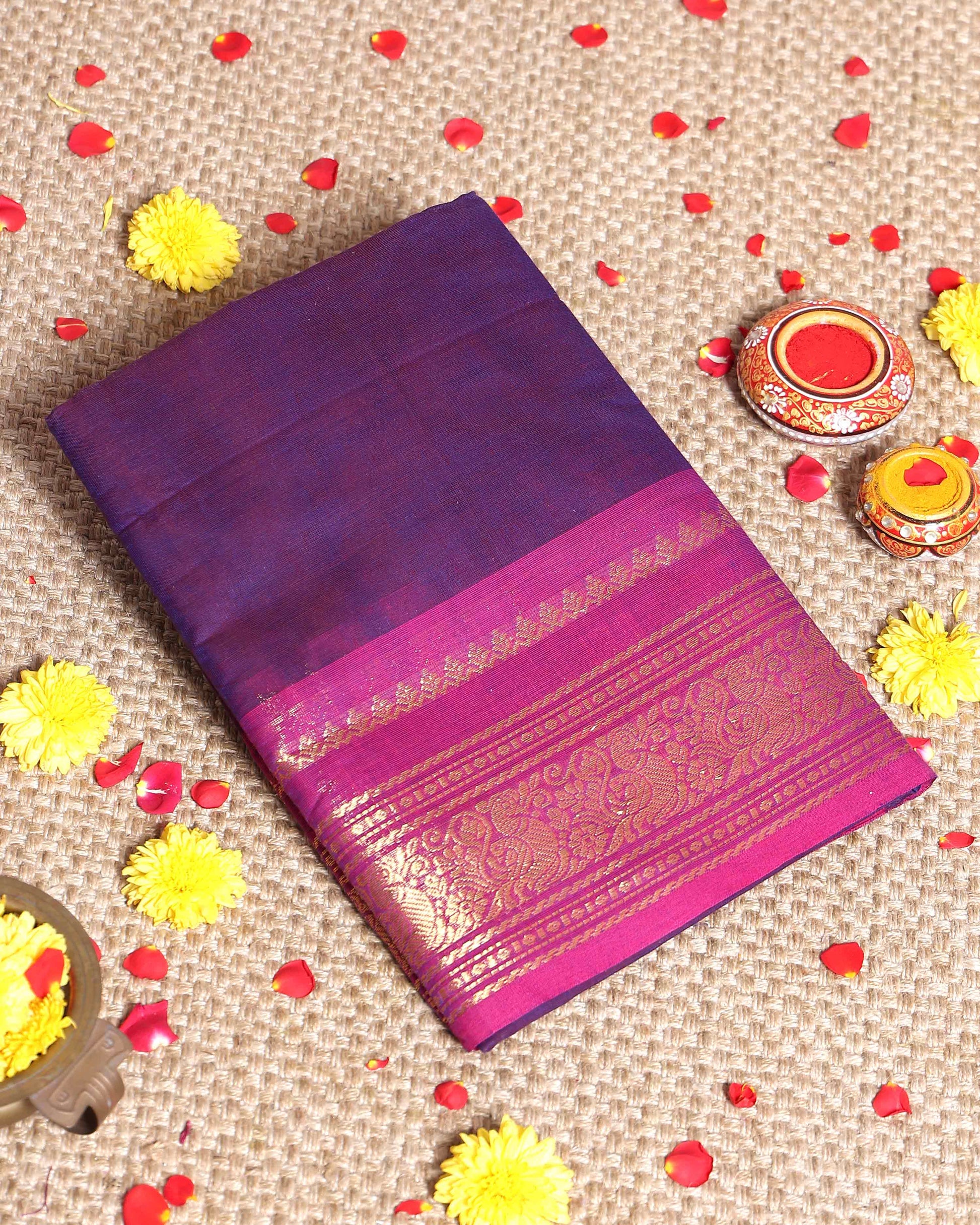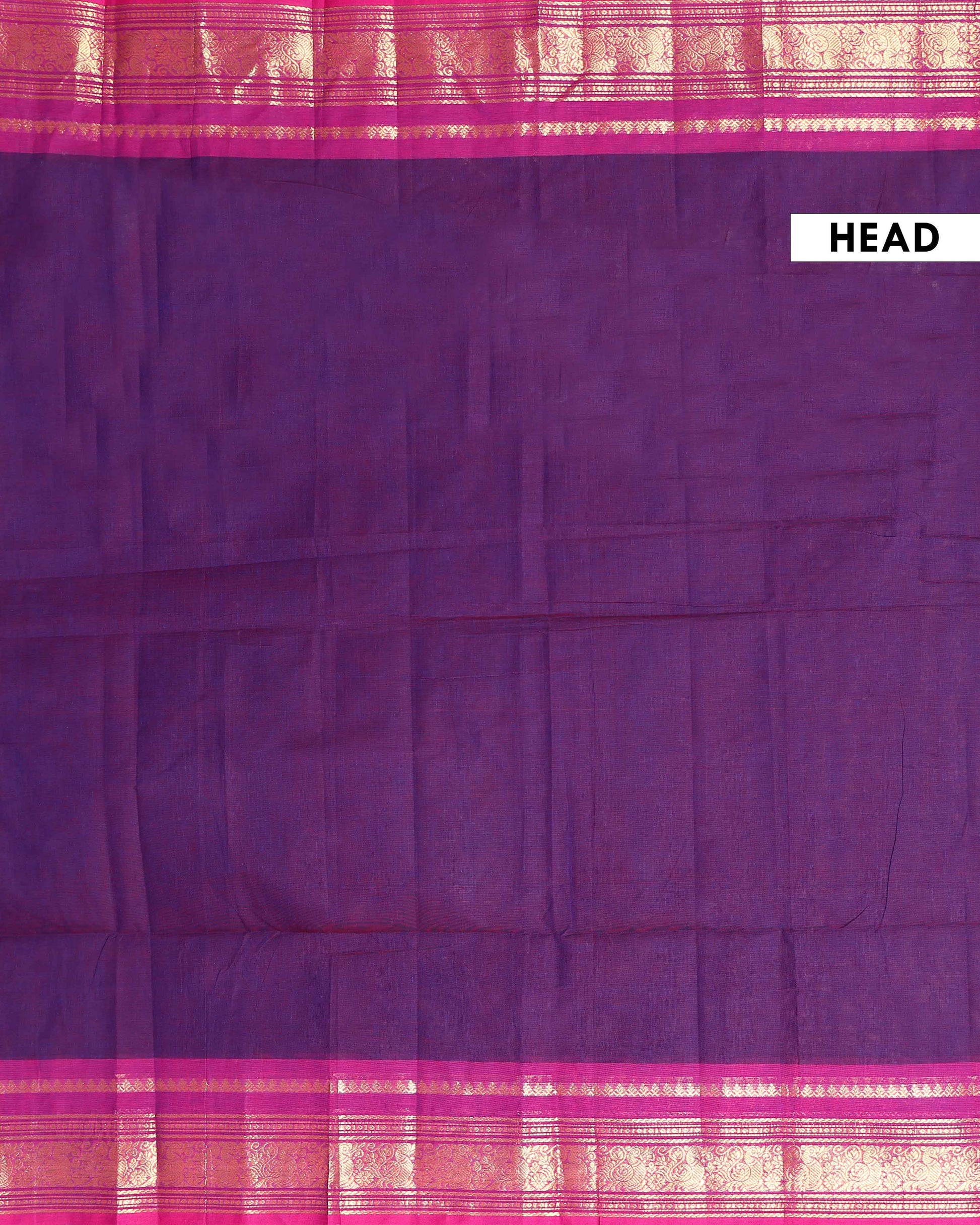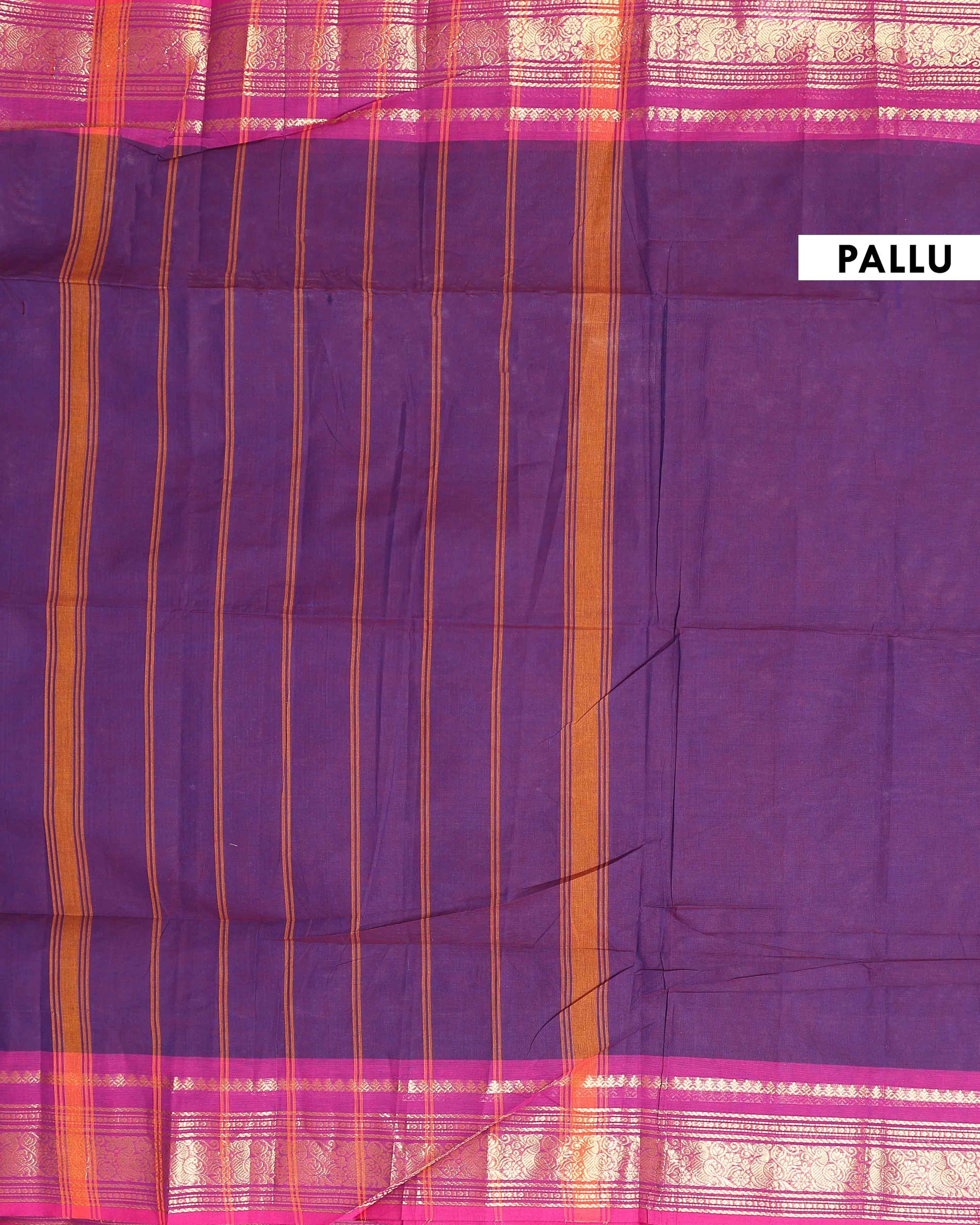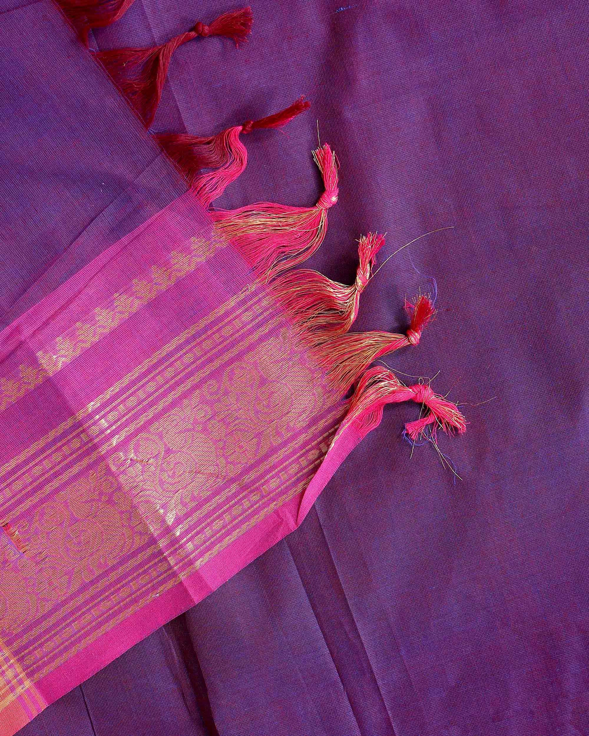 - This pure handloom Kanchi cotton saree in a rich purple hue features a striking pink contrast border with intricate gold zari work, blending tradition with elegance.