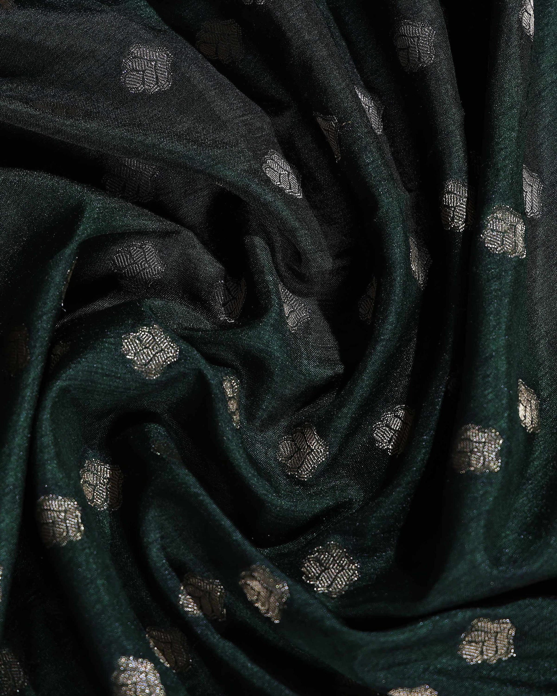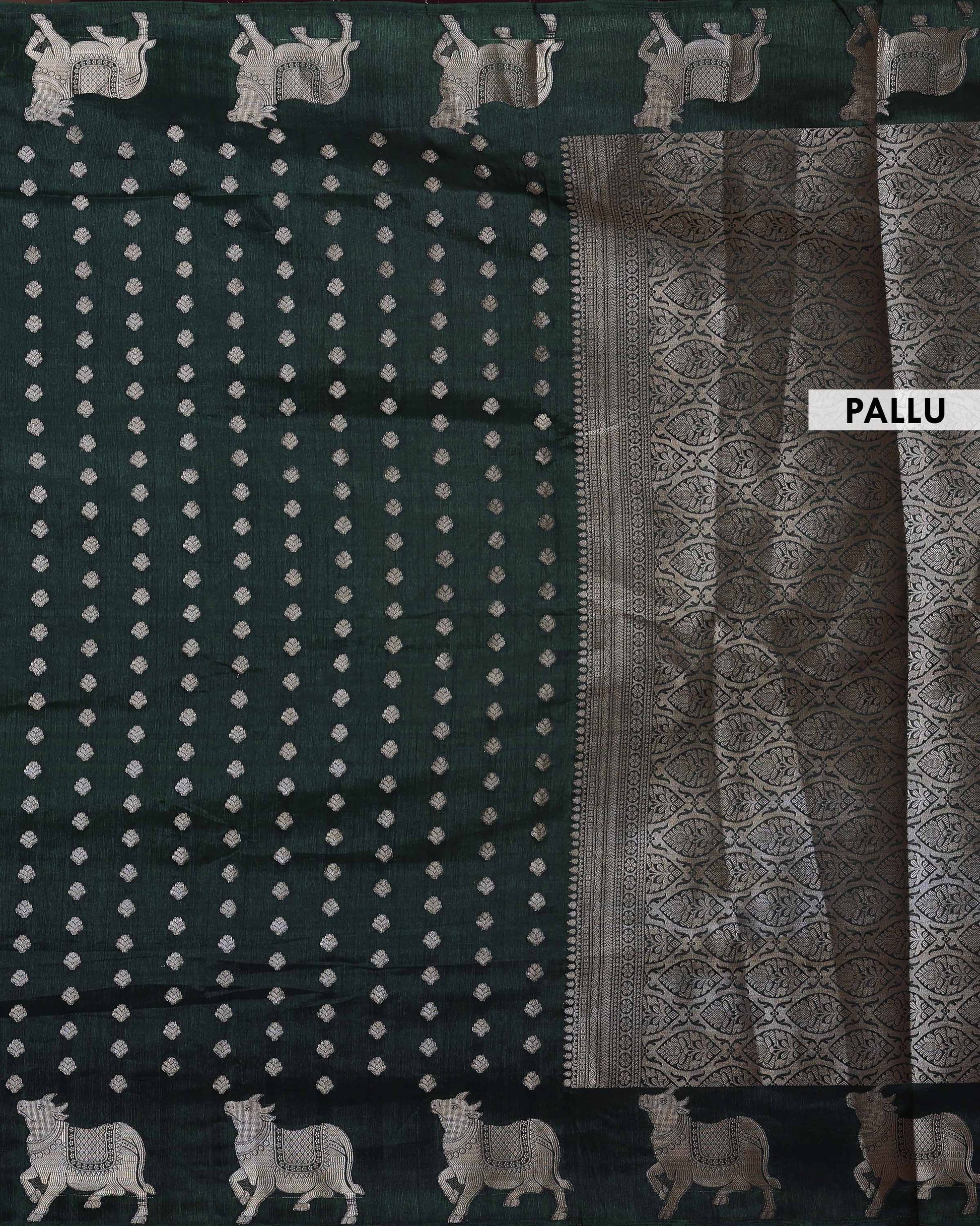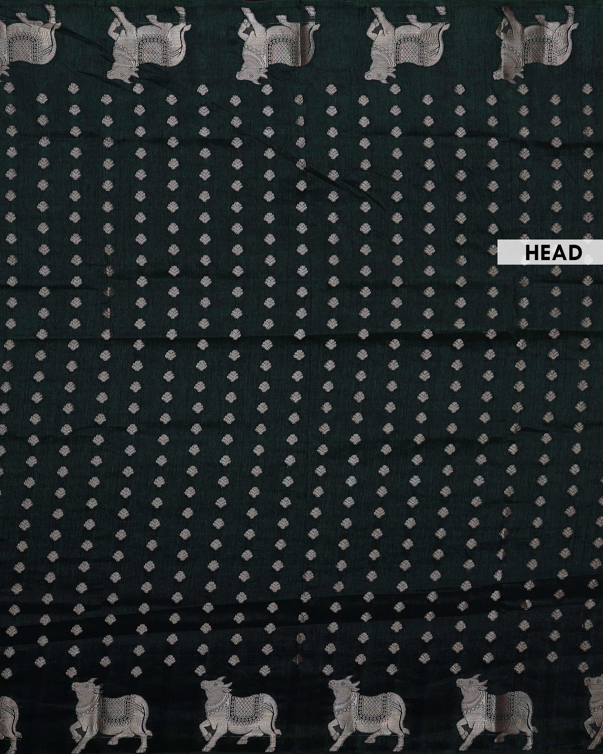 Elegant Semi Banarasi Saree with All over Silver Buti Motifs Pichwai Zari Woven Border - Bottle Green
