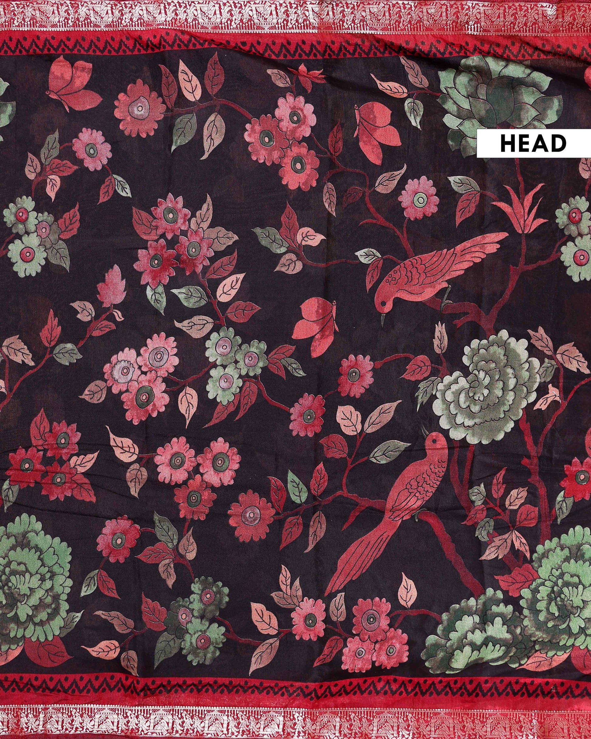 Elegant Semi Chanderi Saree Botanical Motifs and Heritage Art Pallu Design - Black