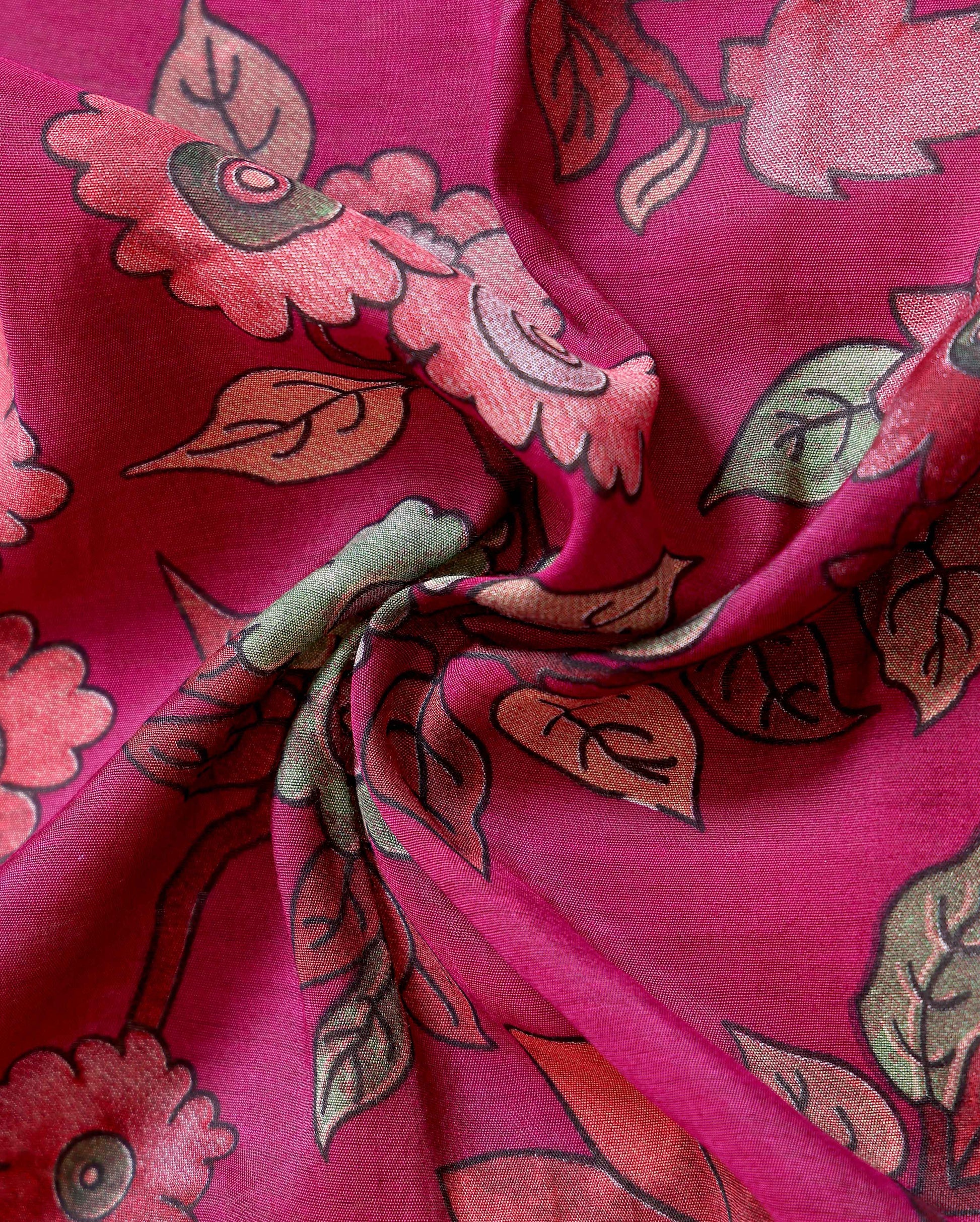- Elevate your style with this semi chanderi saree a vibrant pink body adorned with traditional floral and bird motifs