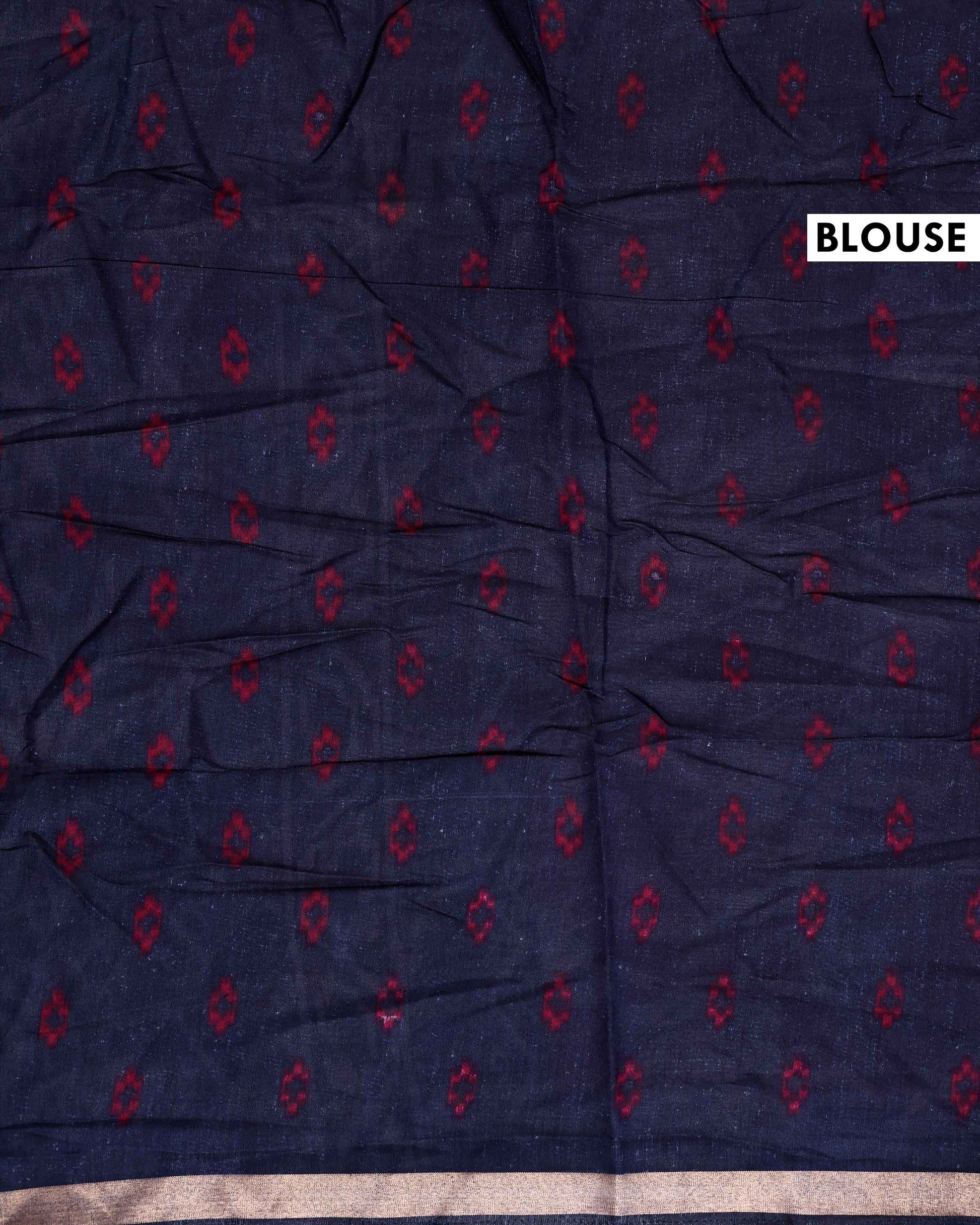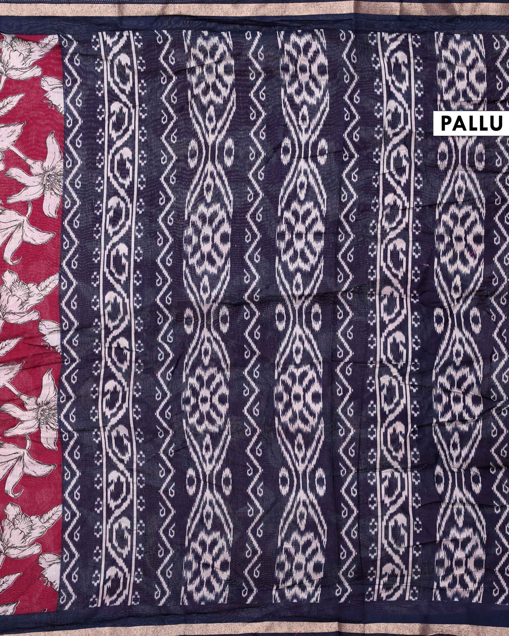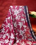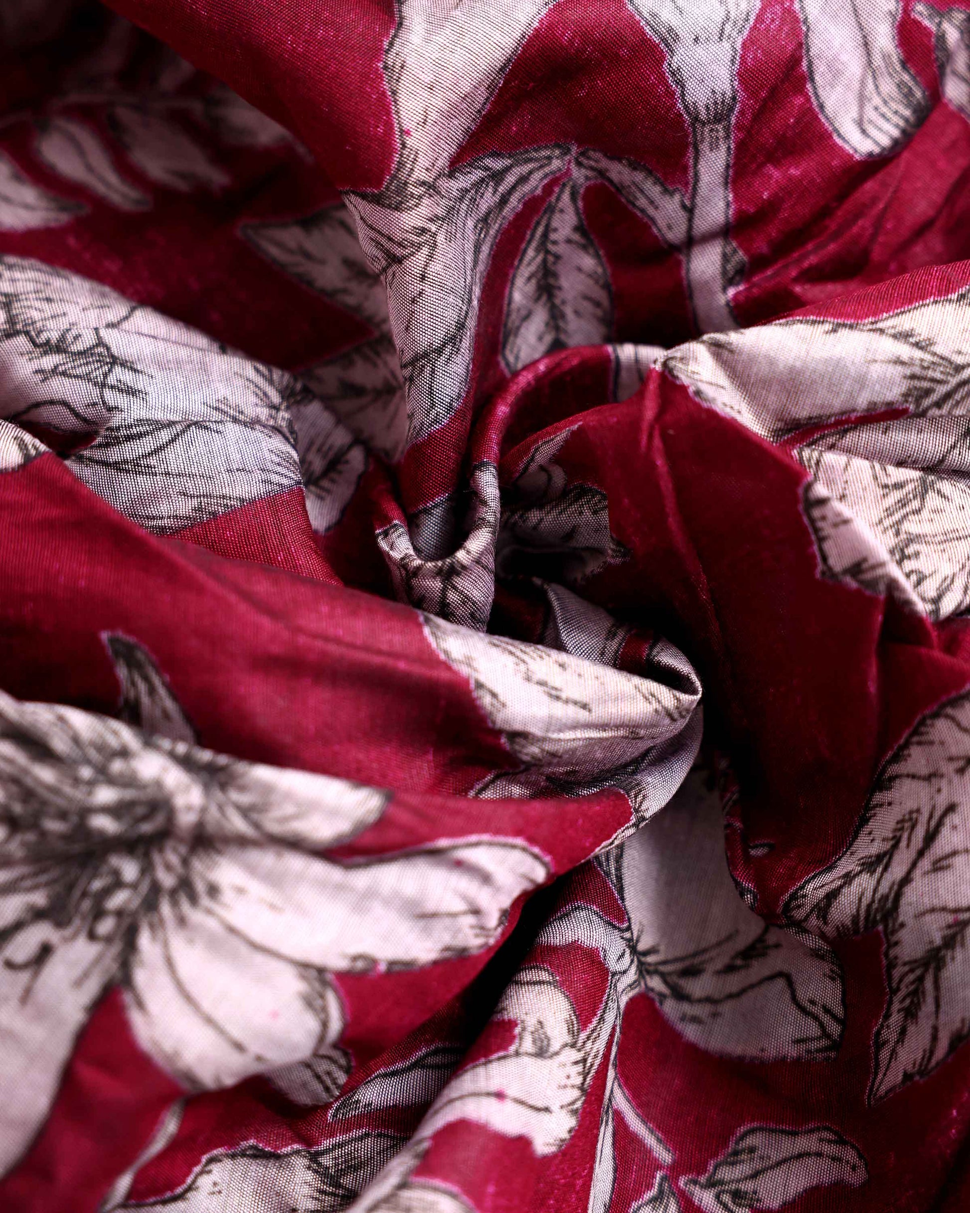 - Elevate any wardrobe with this exquisite maroon semi chanderi saree a delicate white floral and leaf print with a sophisticated navy blue border