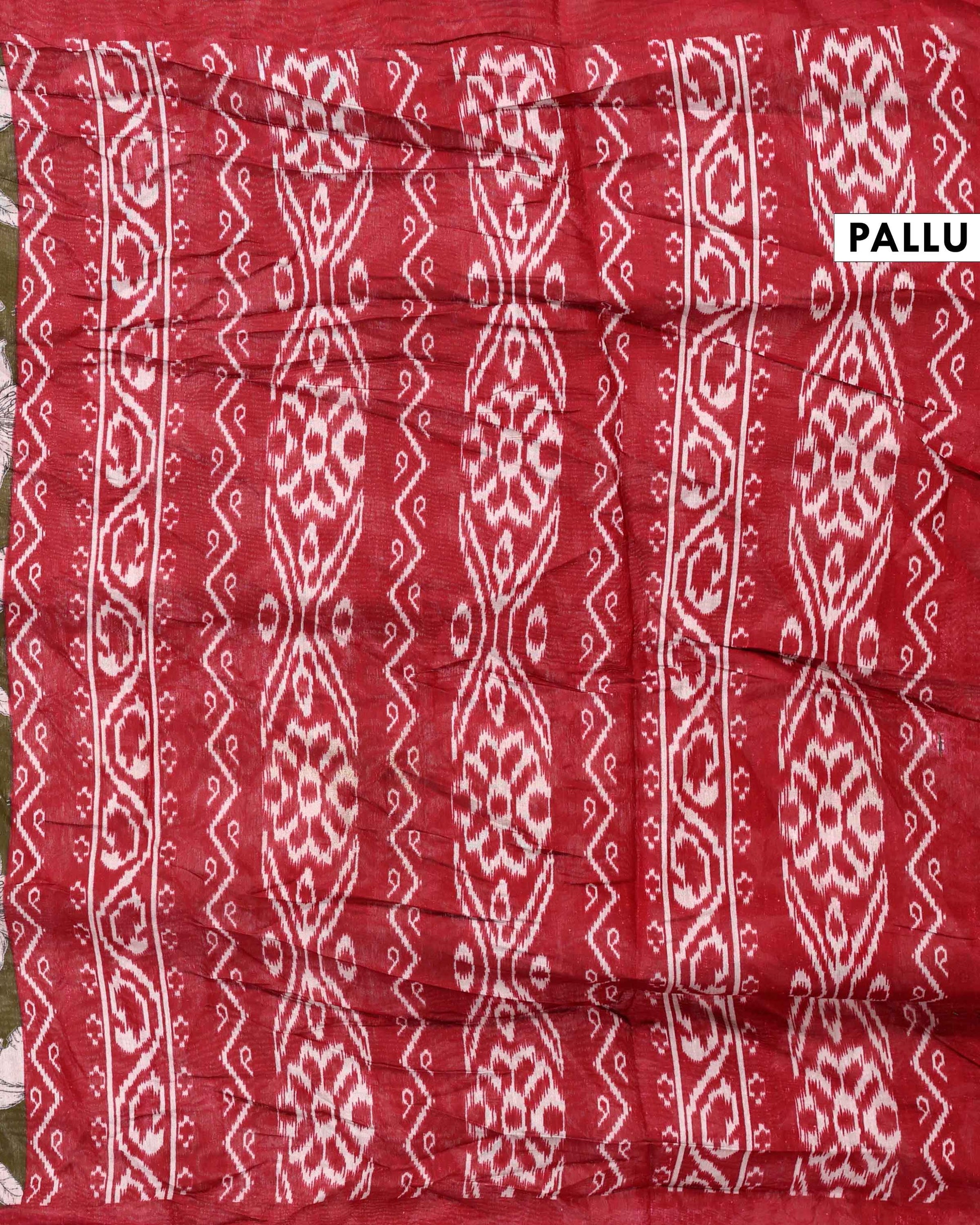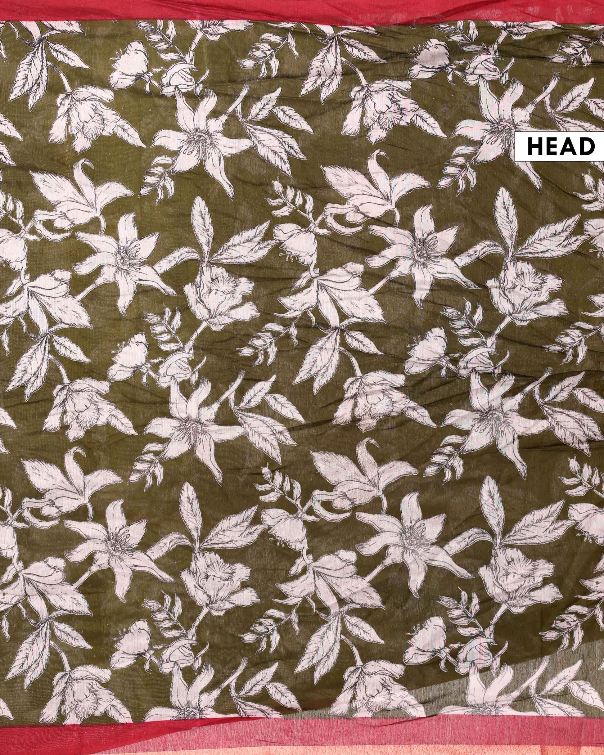 - Elevate any wardrobe with this exquisite Olive Green semi chanderi saree a delicate white floral and leaf print with a sophisticated red border