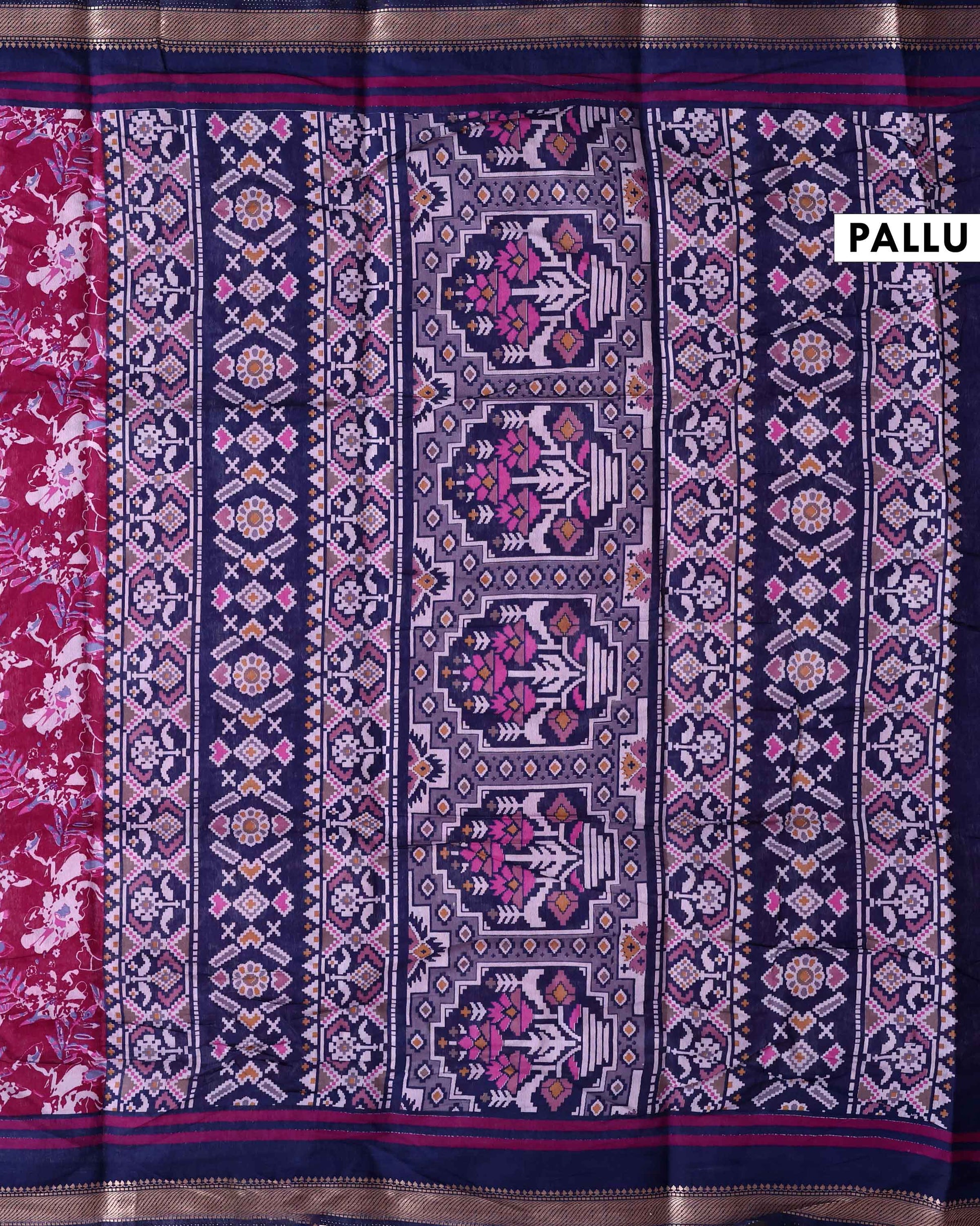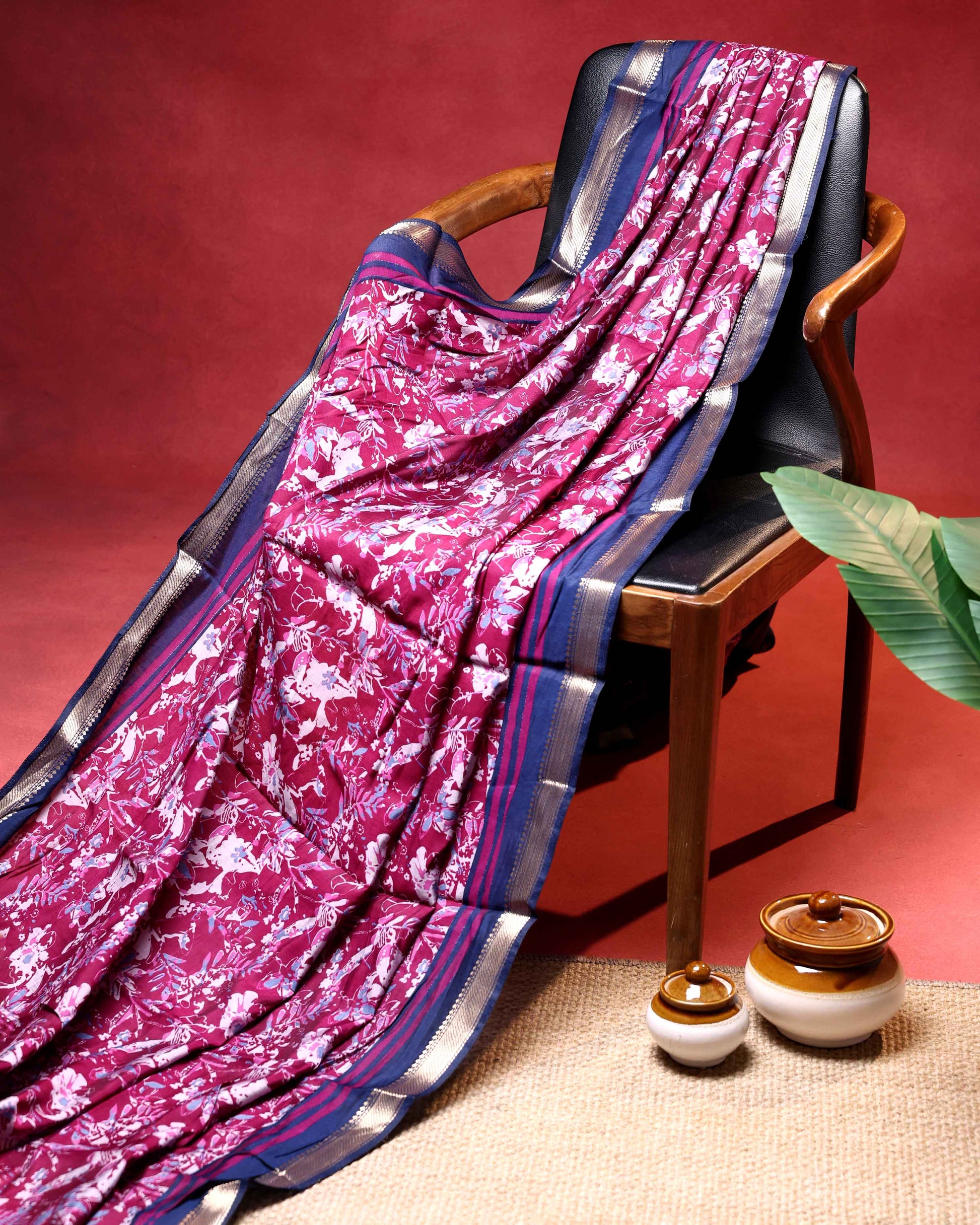 Elegant Semi Chanderi Saree with Floral Inspired Print and Contrast Zari Border - Purple