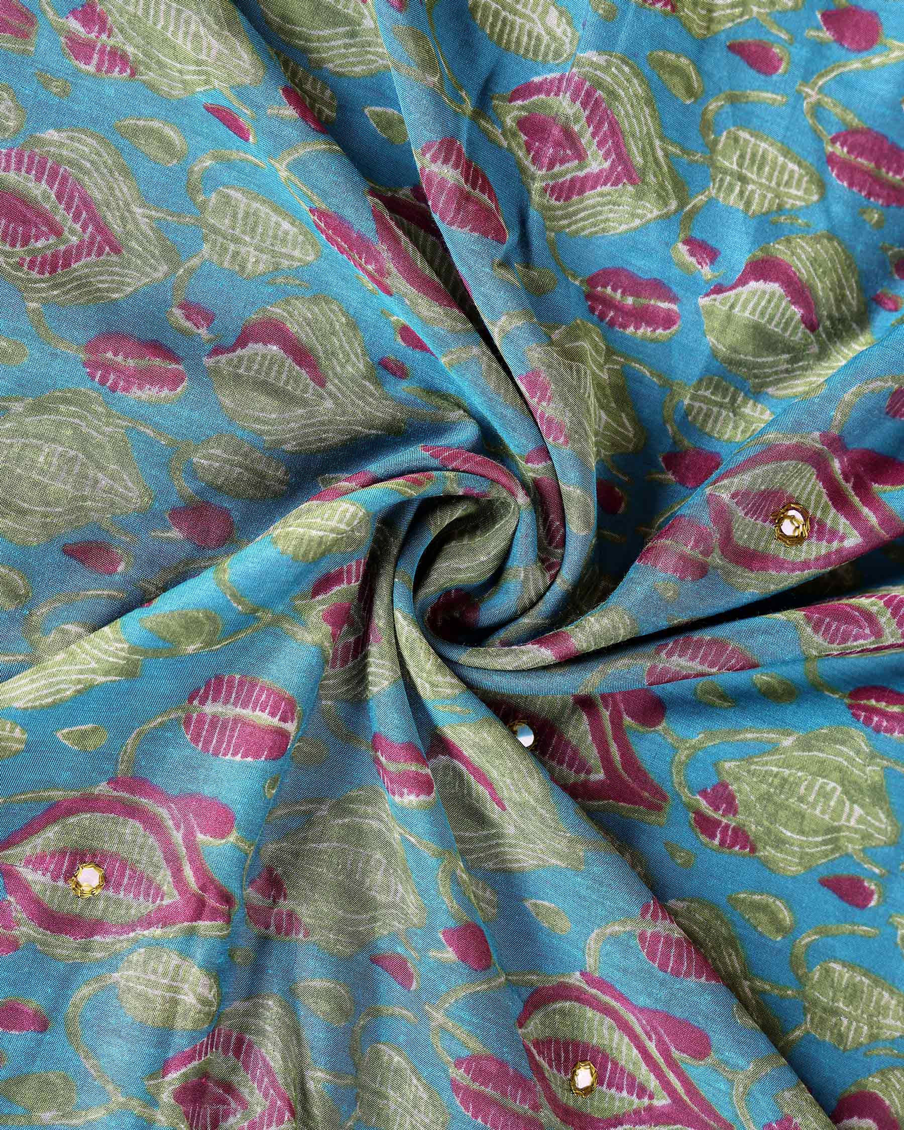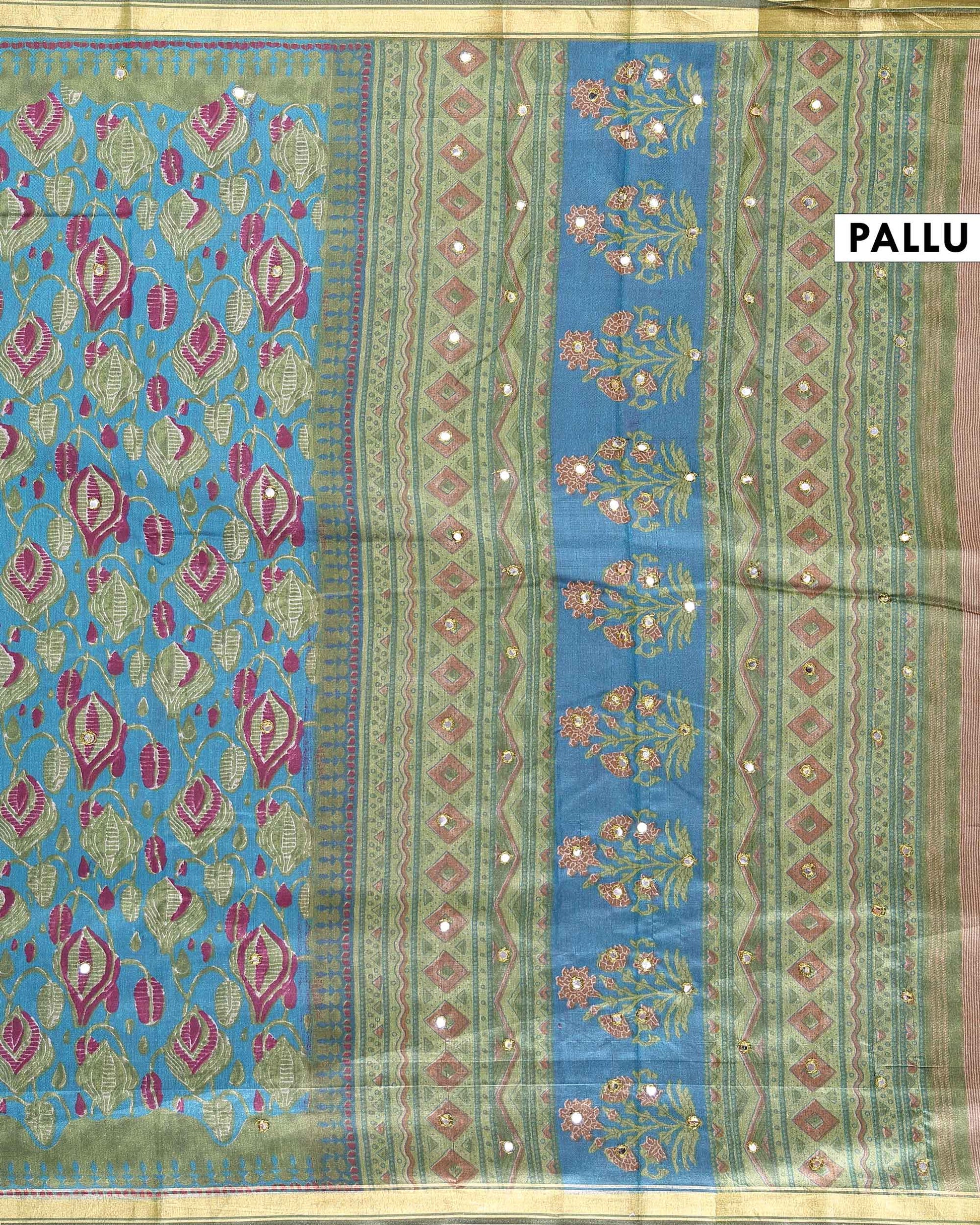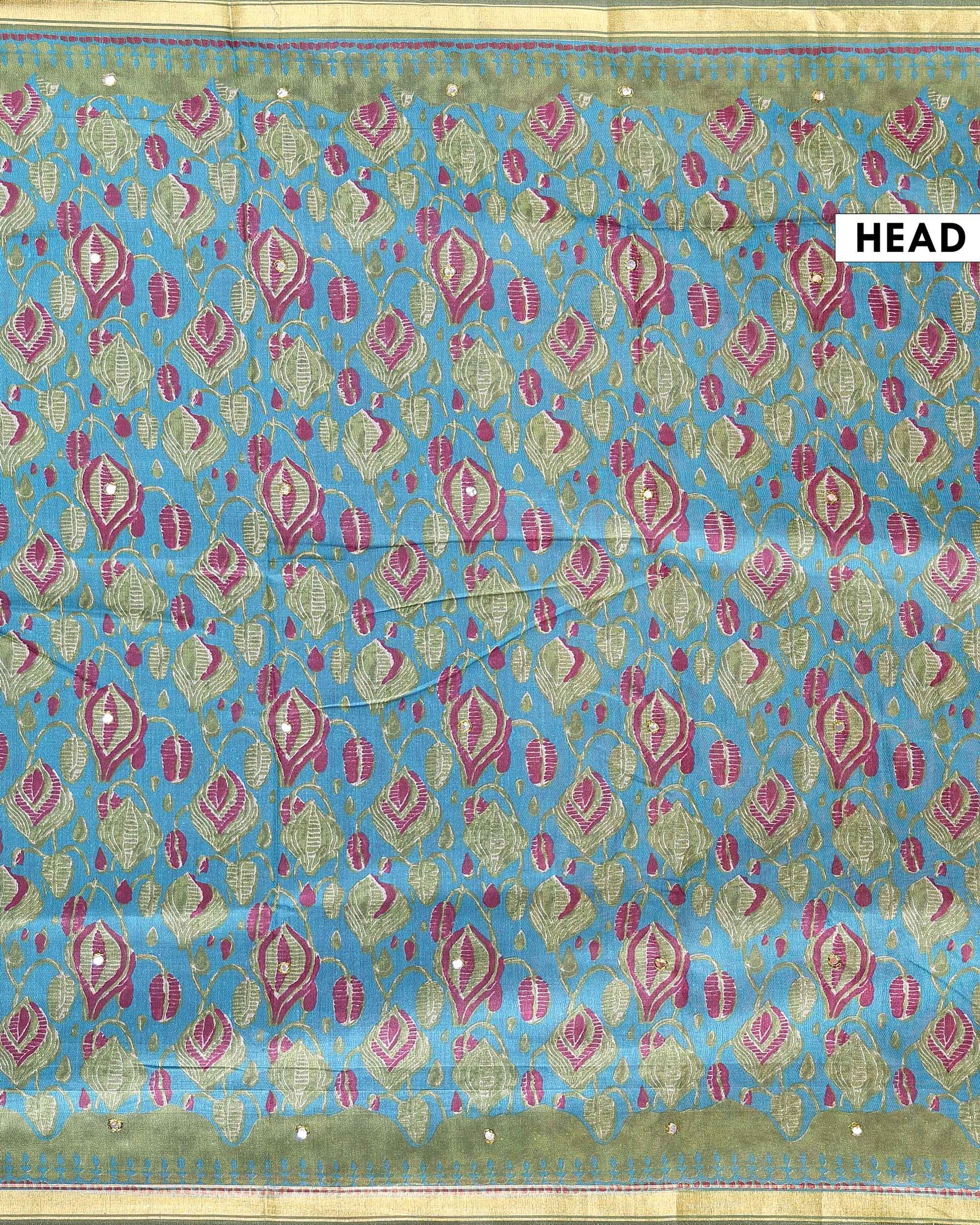 - This is an elegant Blue colour semi chanderi saree with Floral inspired all over print and intricate golden zari border perfect for everyday elegance.