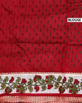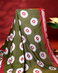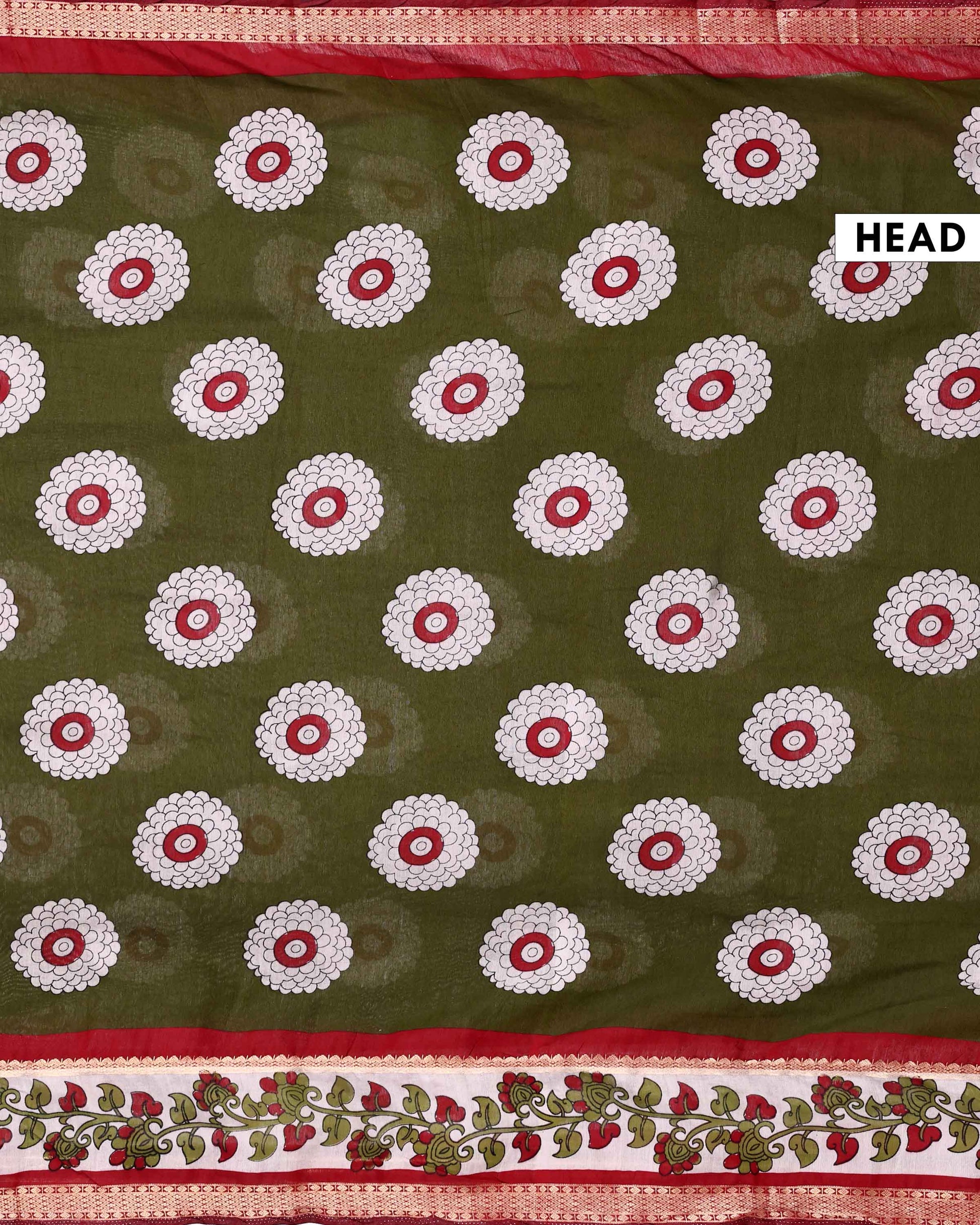 - Drape yourself in elegance with this stunning olive green semi chanderi saree a vibrant white floral print and a bold red border