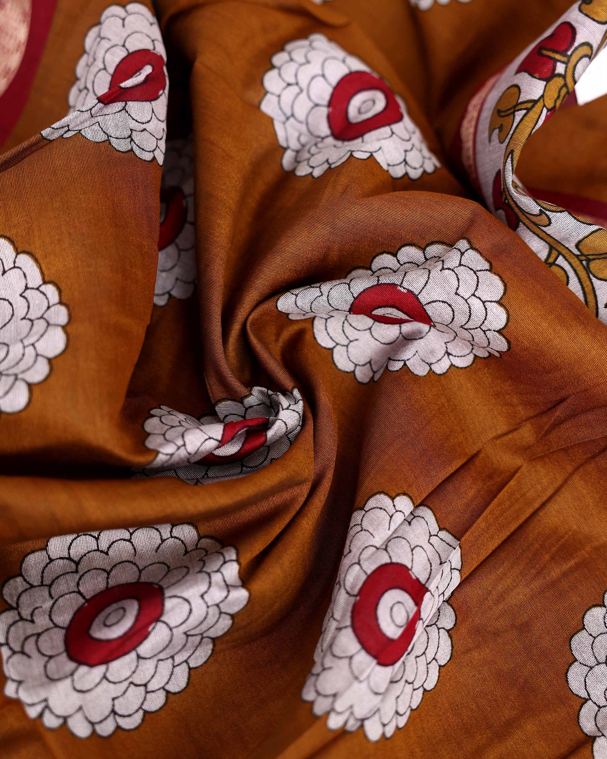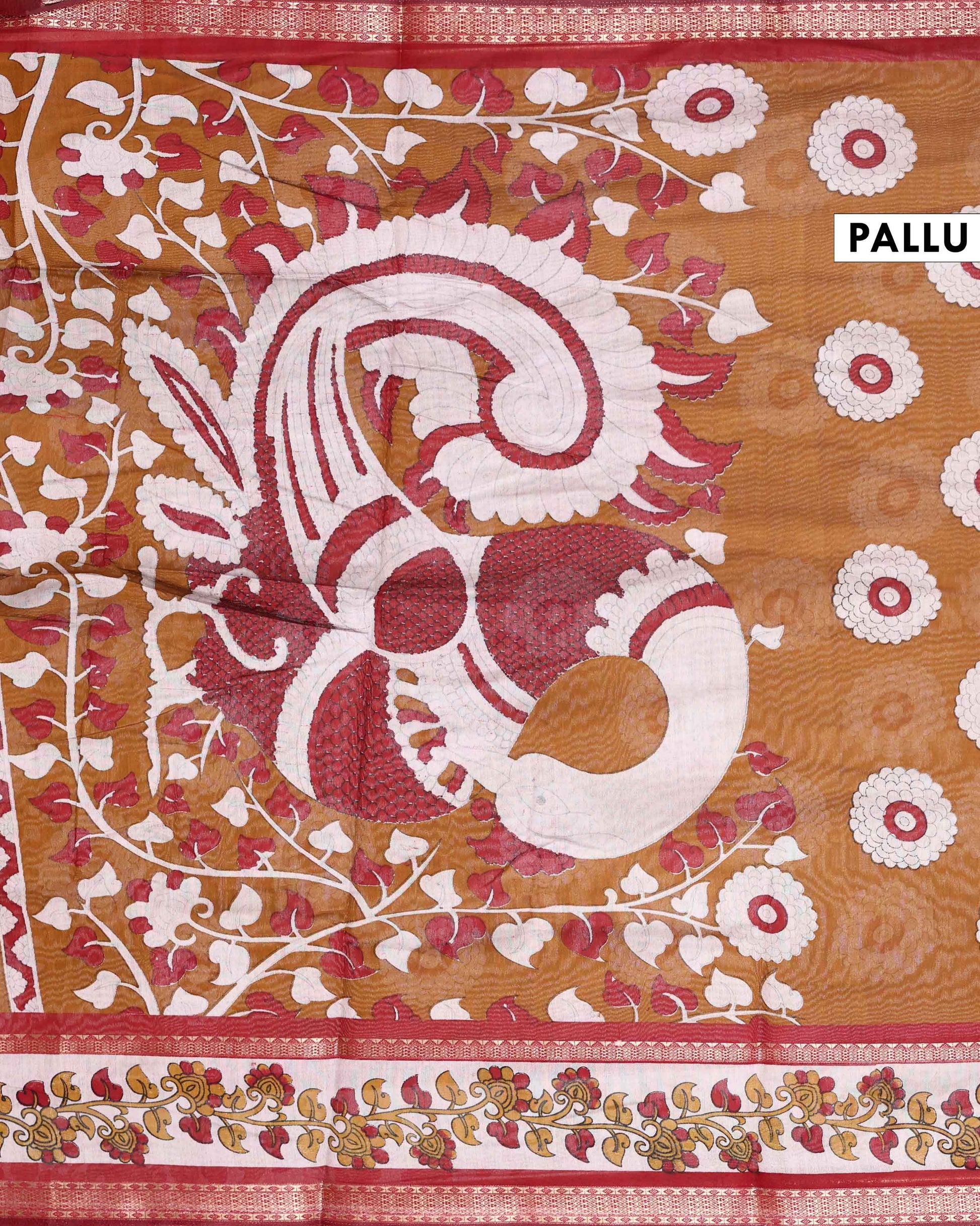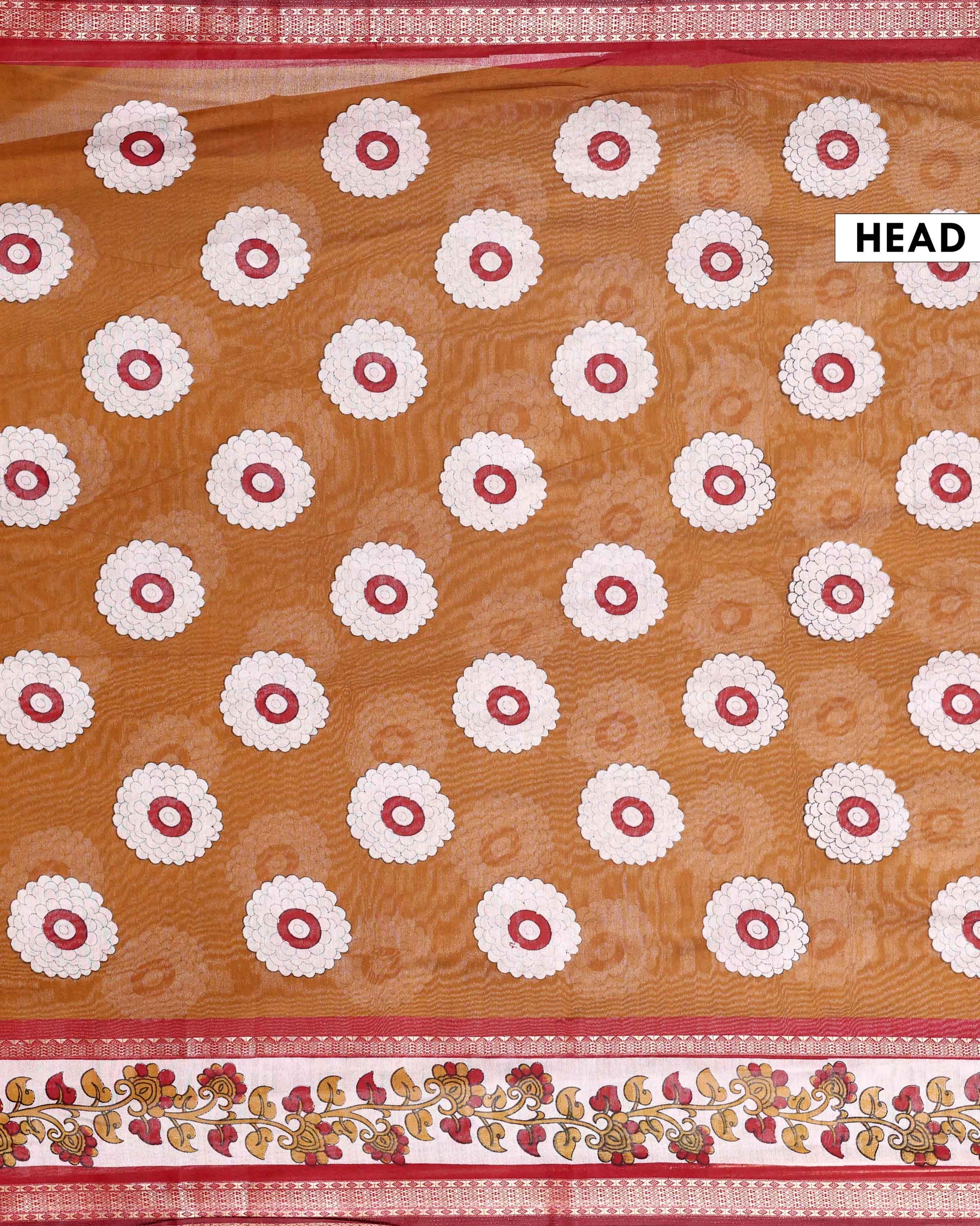 - Drape yourself in elegance with this stunning Mustard semi chanderi saree a vibrant white floral print and a bold Red border