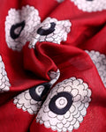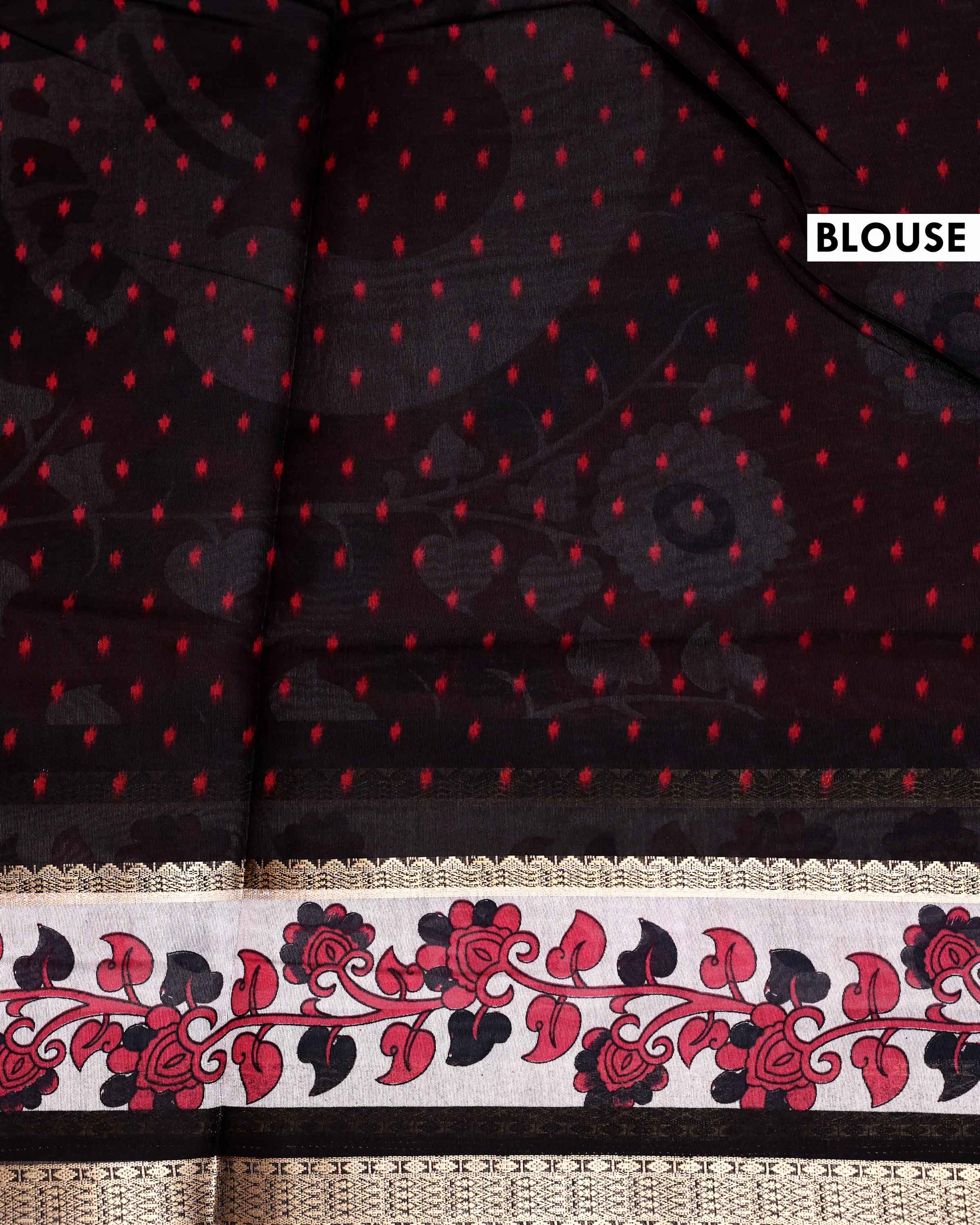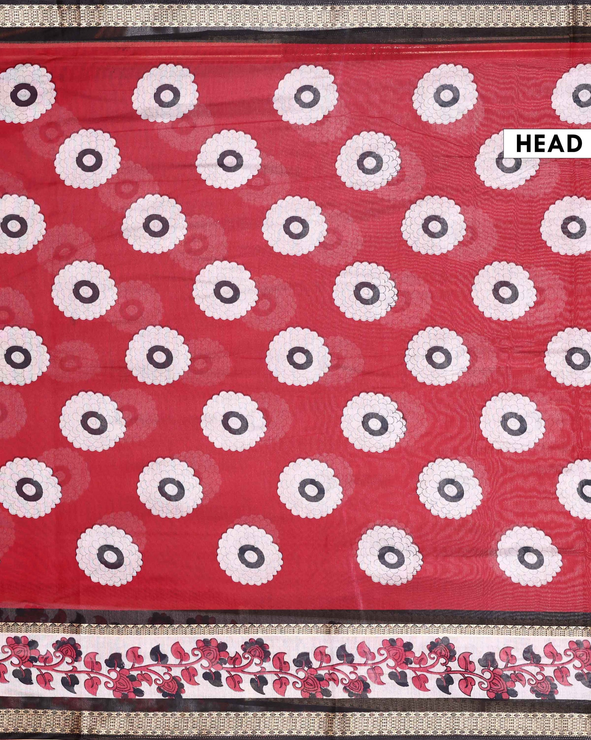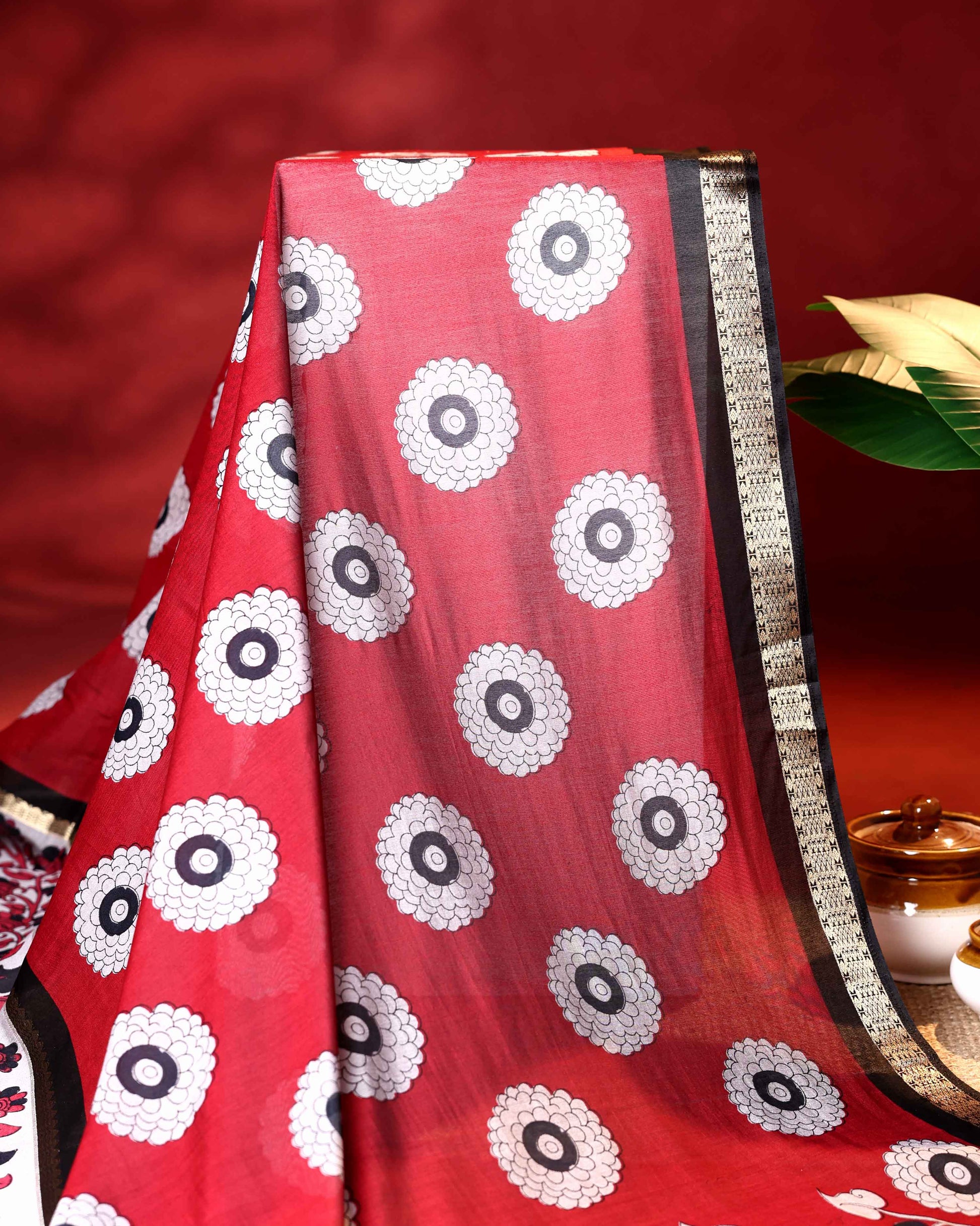 - Drape yourself in elegance with this stunning Red semi chanderi saree a vibrant white floral print and a bold Black border
