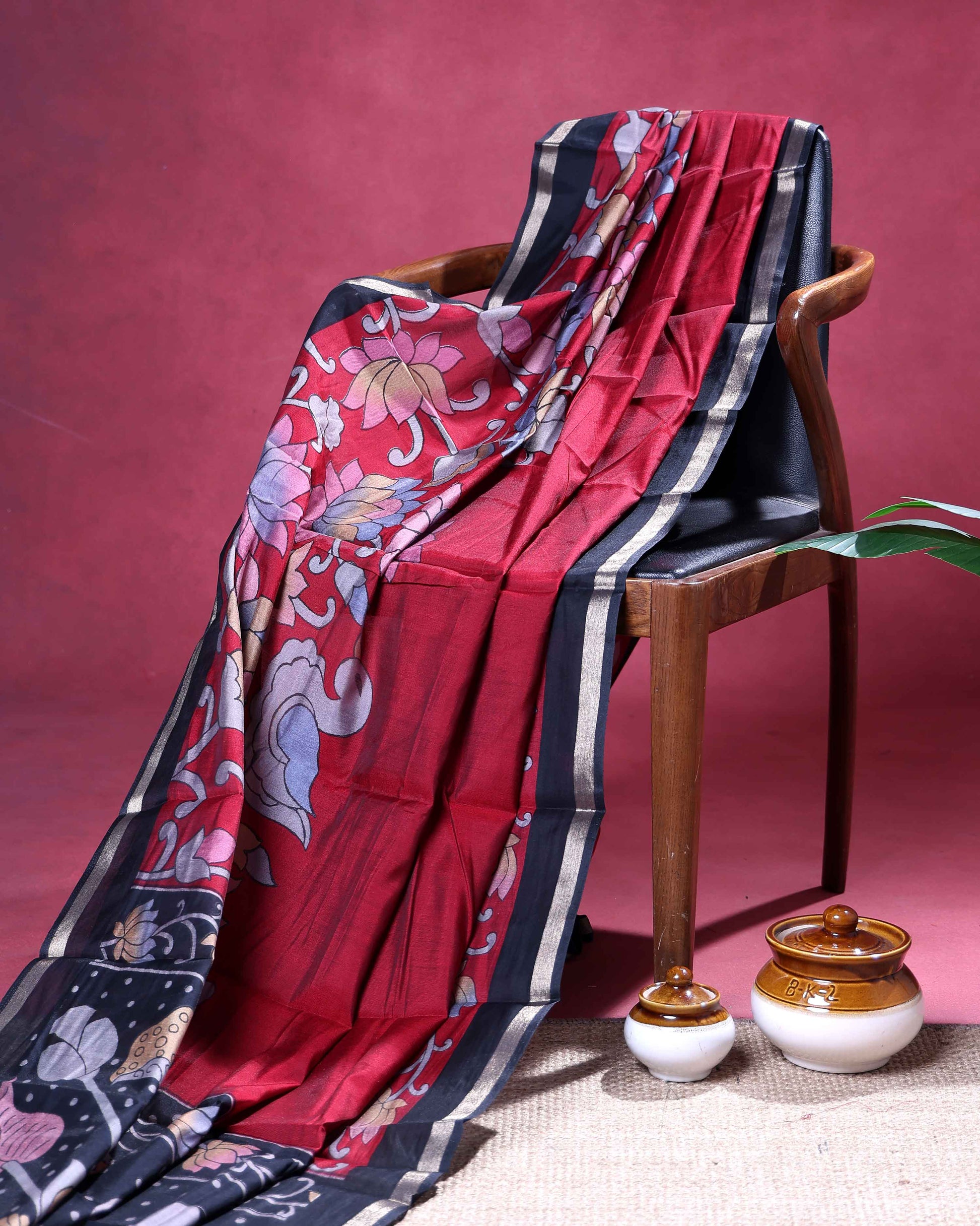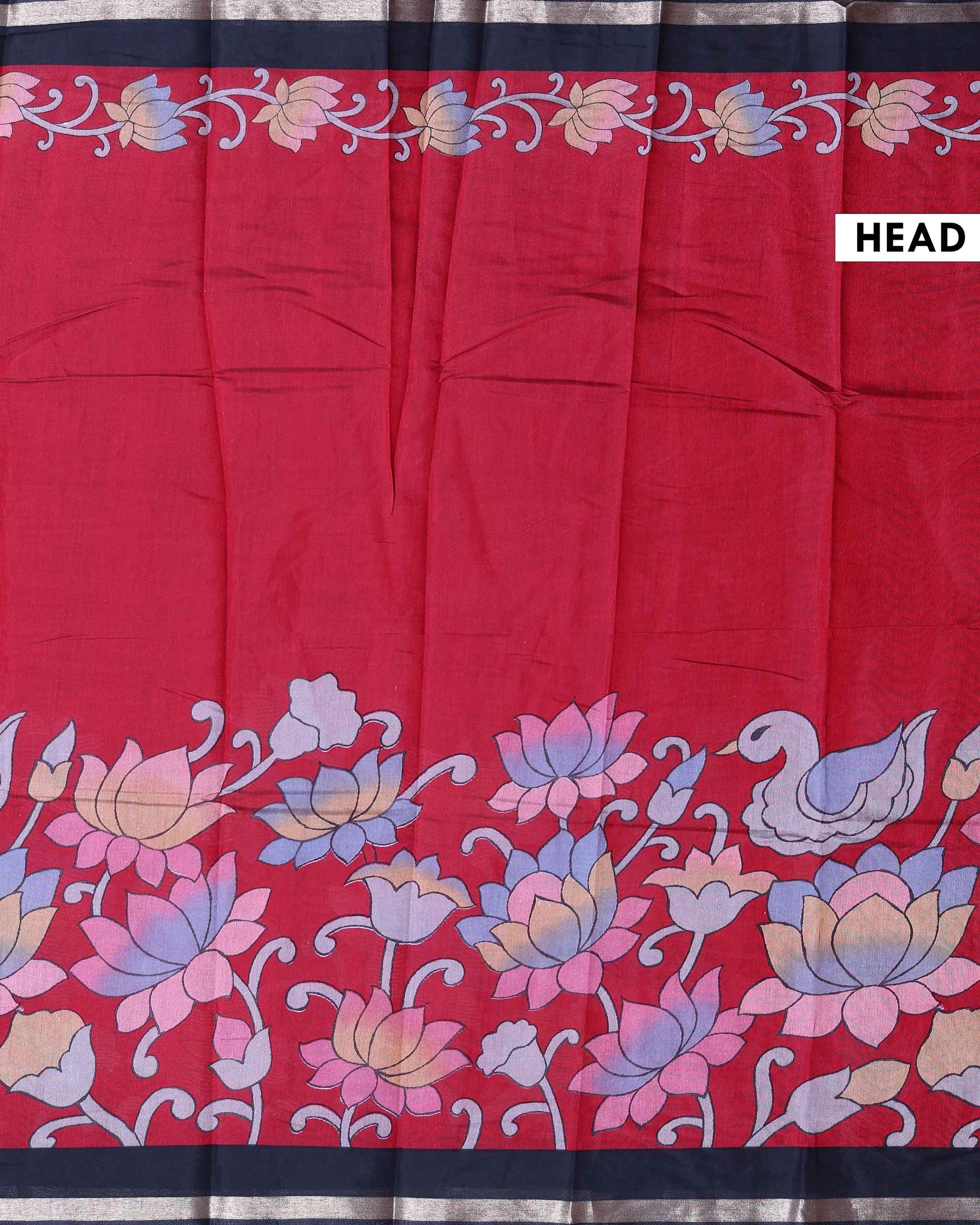 Elevate your style with this classic Red chanderi saree featuring a beautiful Floral inspired print and an intricate zari border.