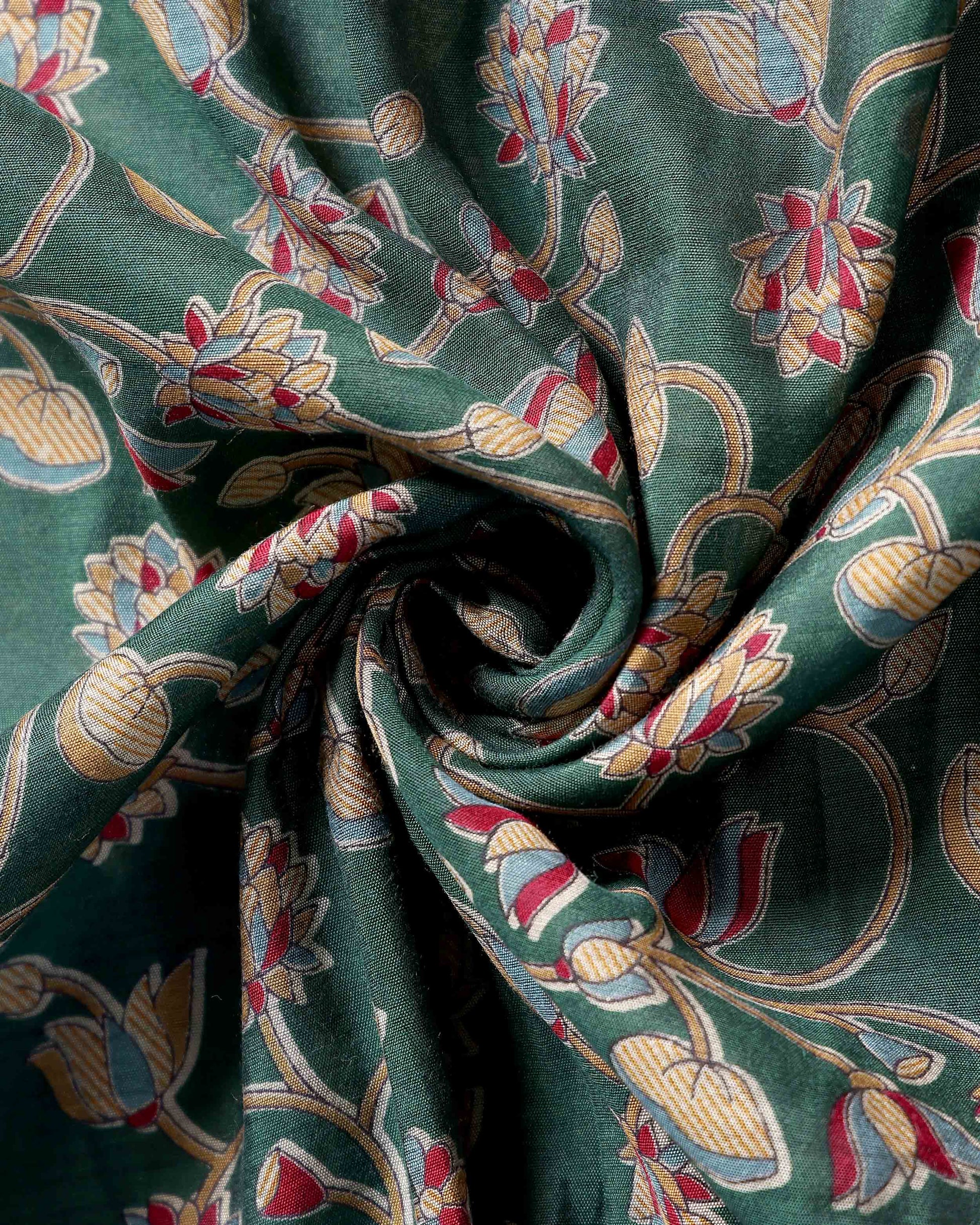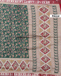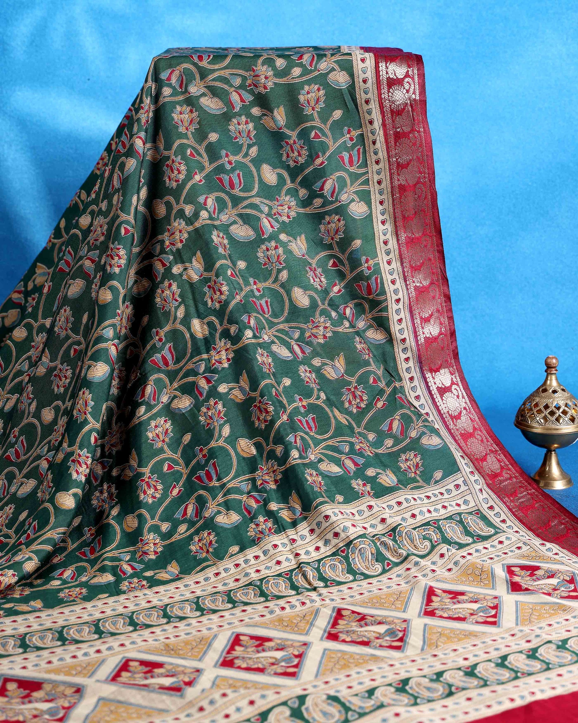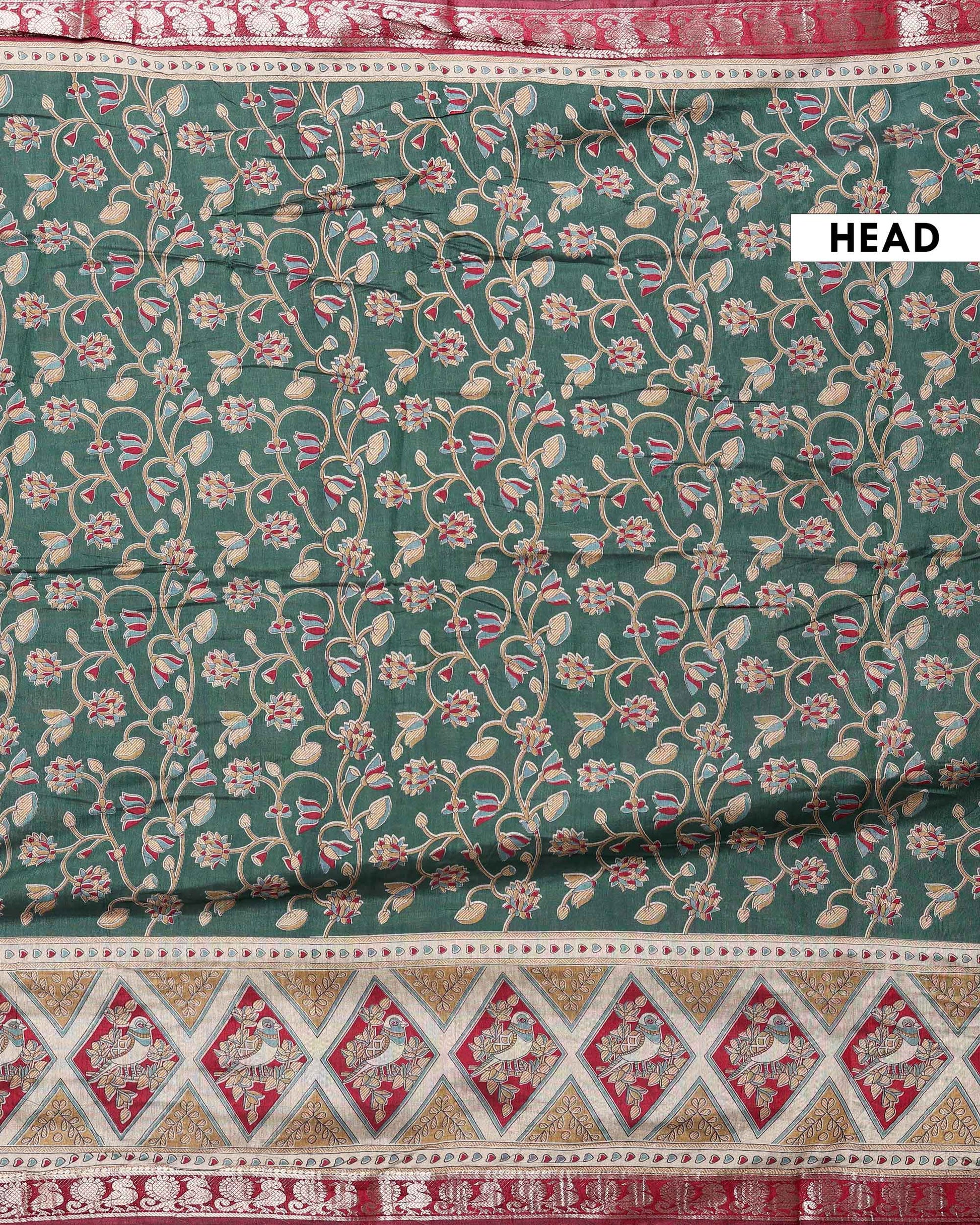 Elegant Semi Chanderi Saree with Floral Motifs and Traditional Contrast Woven Border - Green
