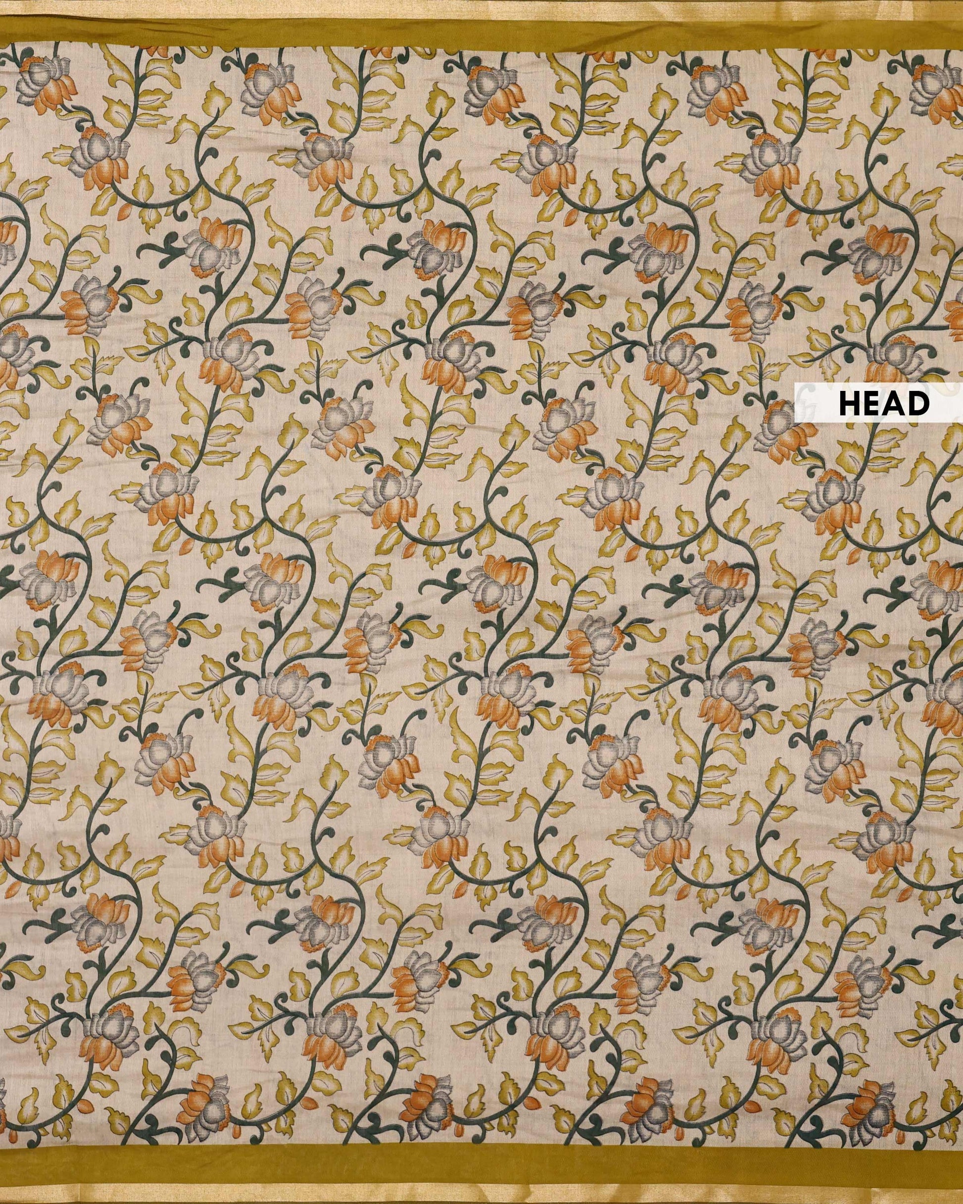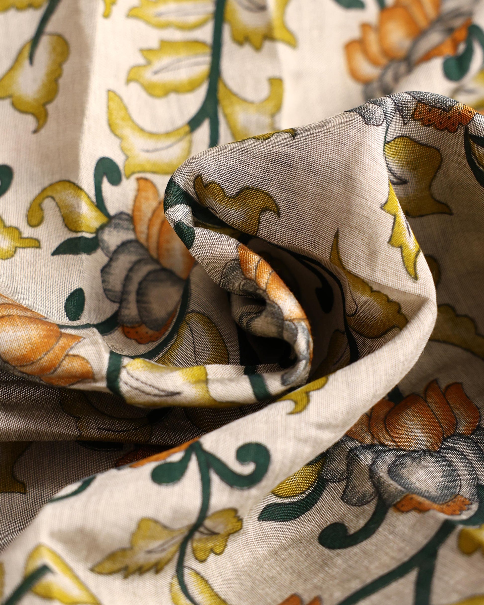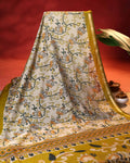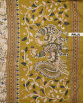 - Experience elegance with this beautiful raw silk saree a timeless kalamkari inspired floral print in subtle yellow and grey tones, perfect for any sophisticated occasion