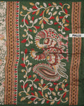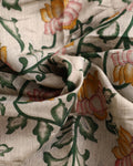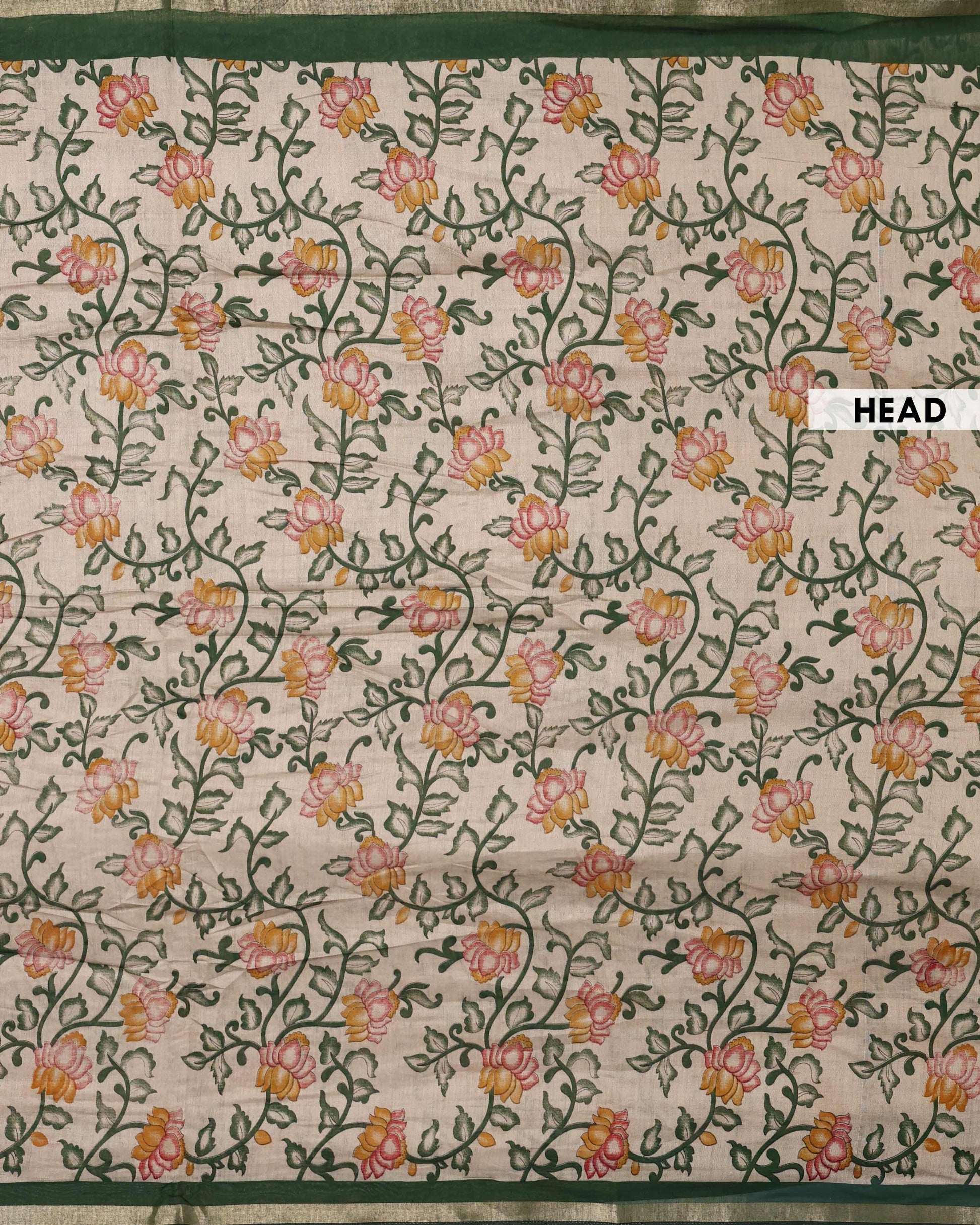 - A beautiful cream raw silk saree with vibrant pink and yellow floral motifs and a deep green border.