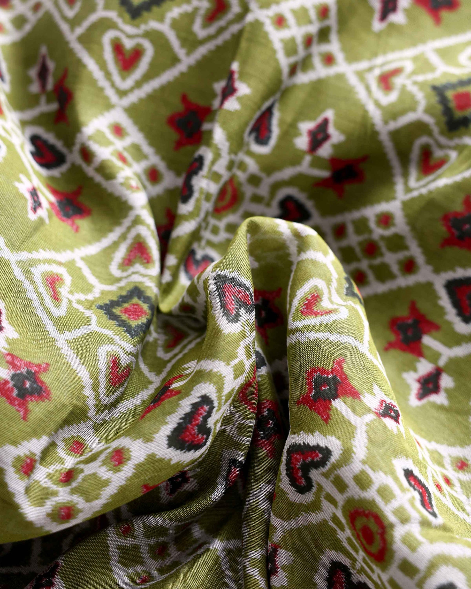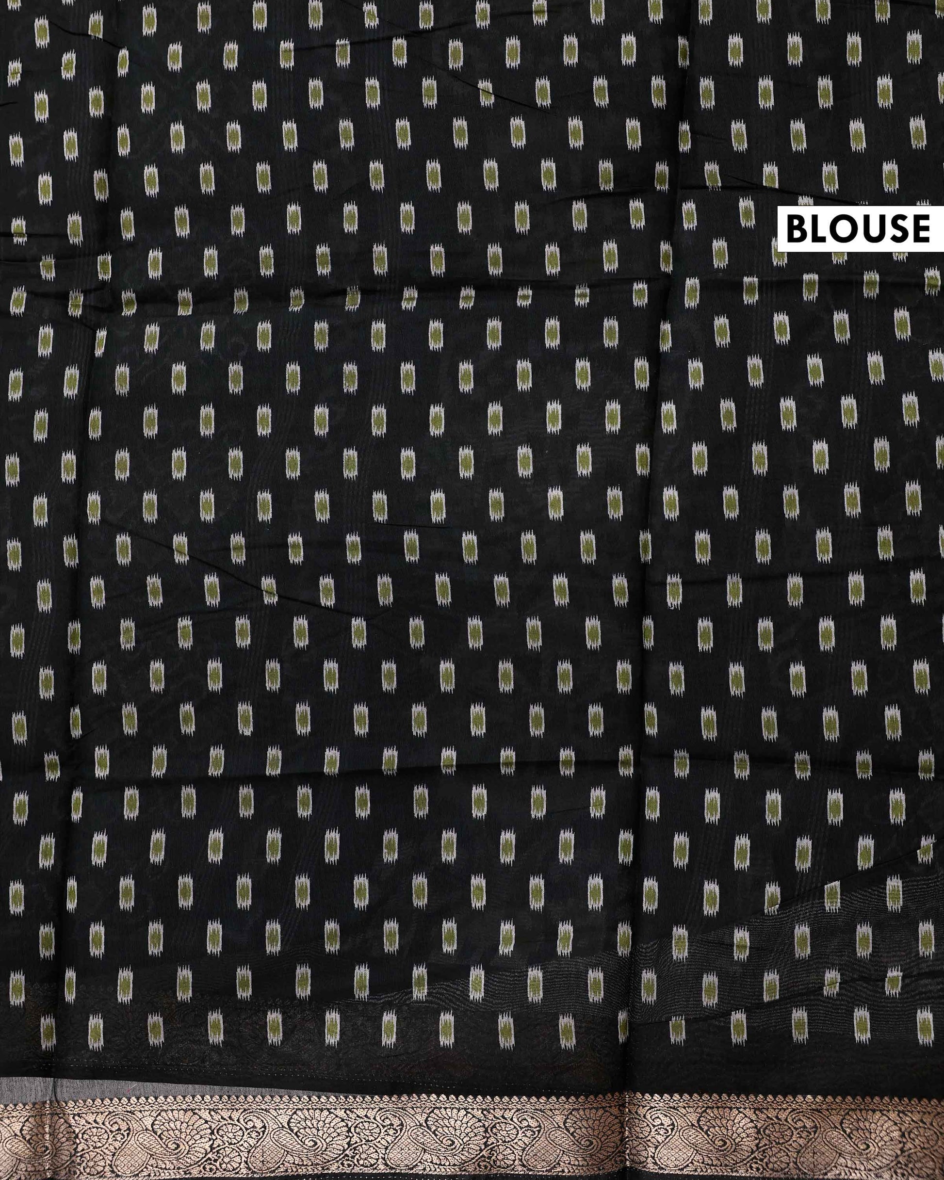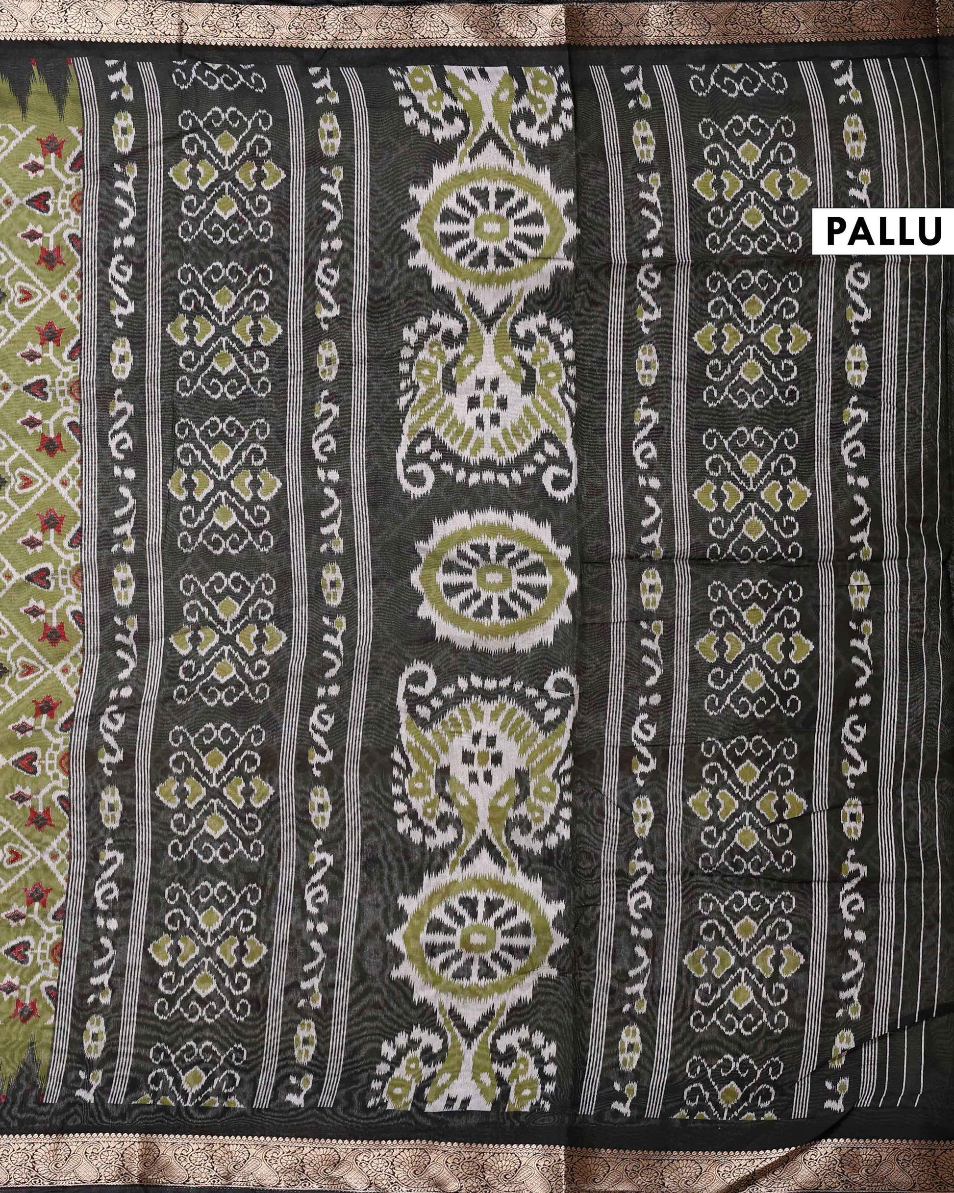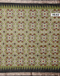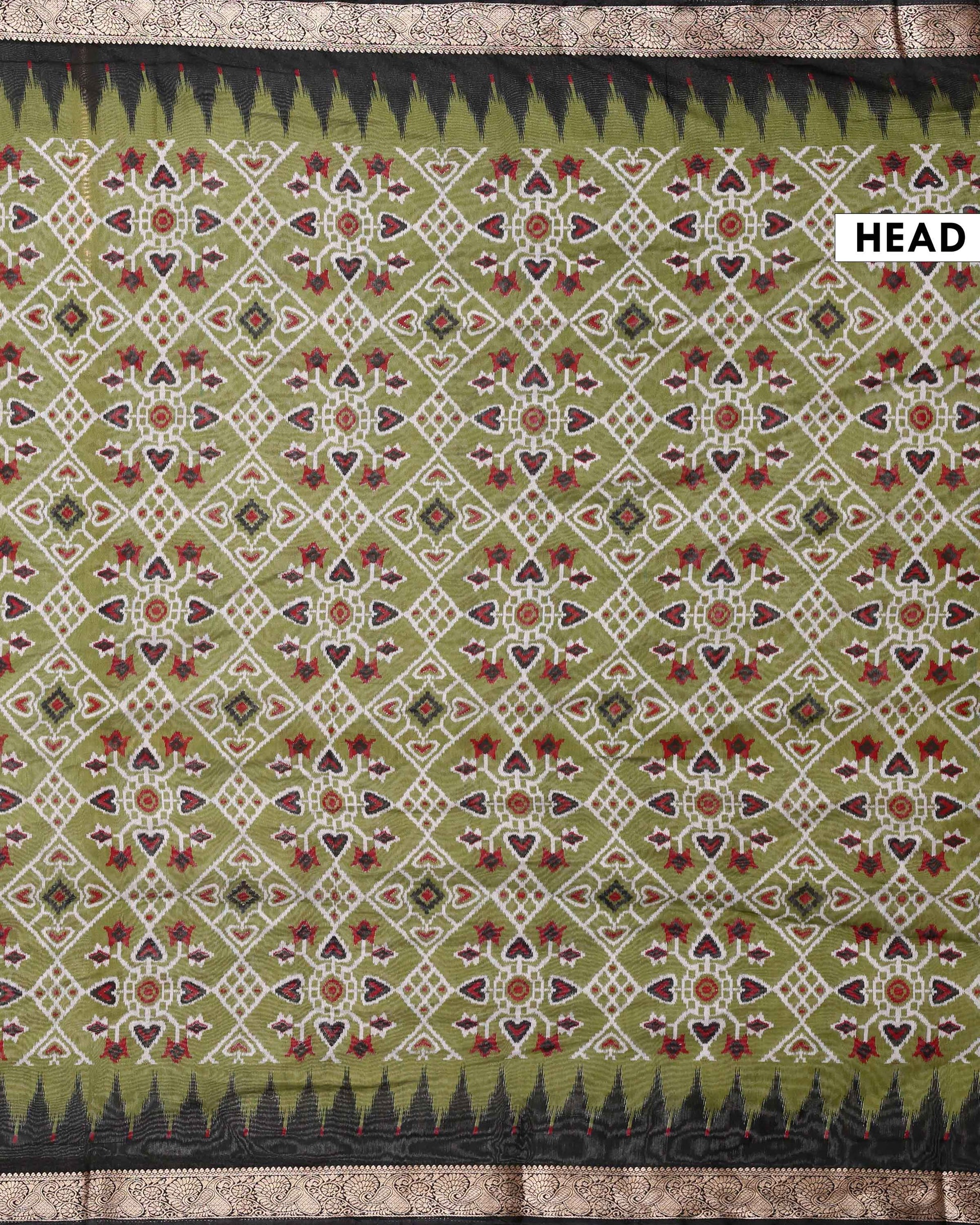 - This is a semi chanderi saree a Olive Green and white diamond ikkat pattern with a dark ornate border.