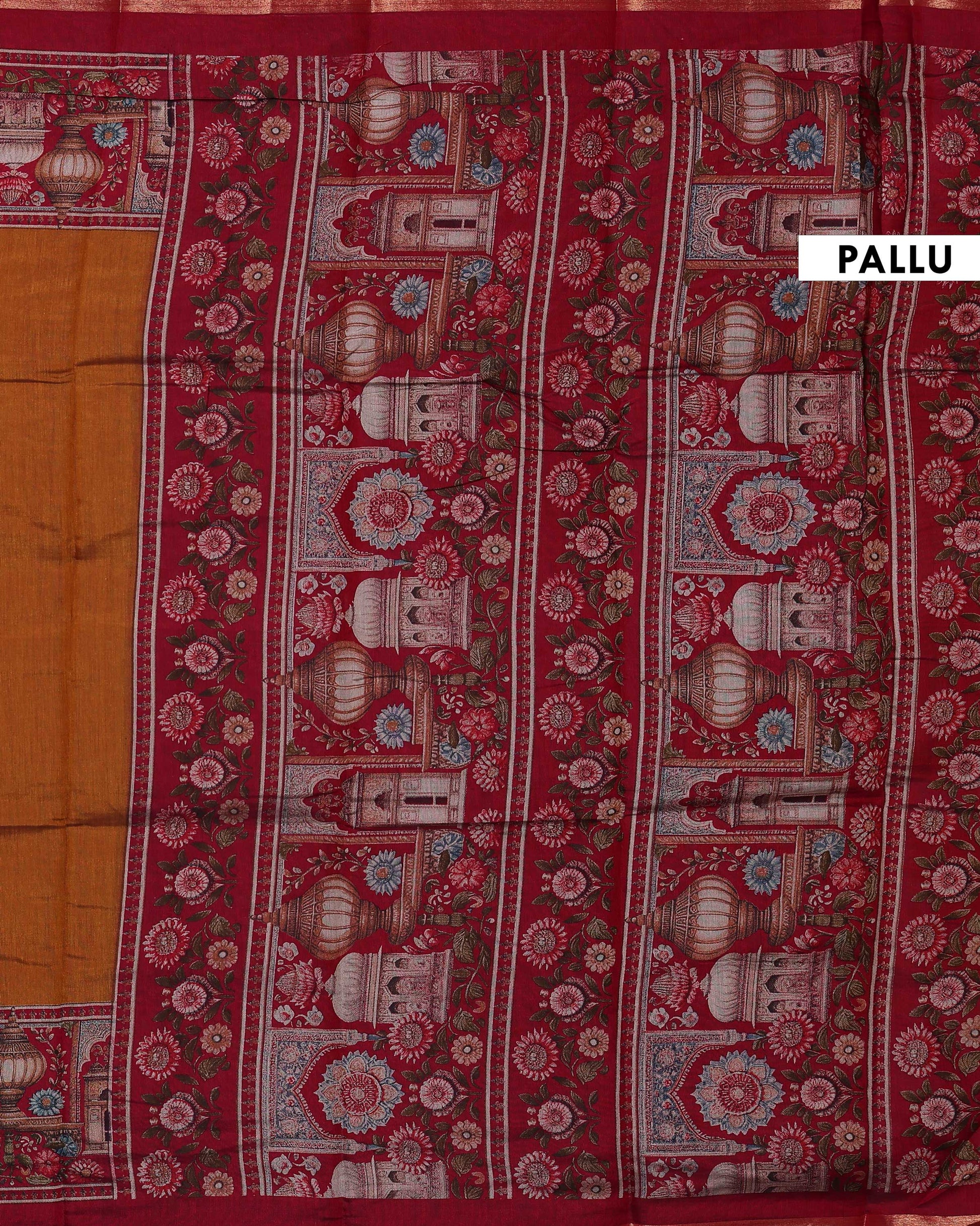 - This is an elegant Mustard colour semi chanderi saree with Floral inspired all over print and intricate golden zari border perfect for everyday elegance.