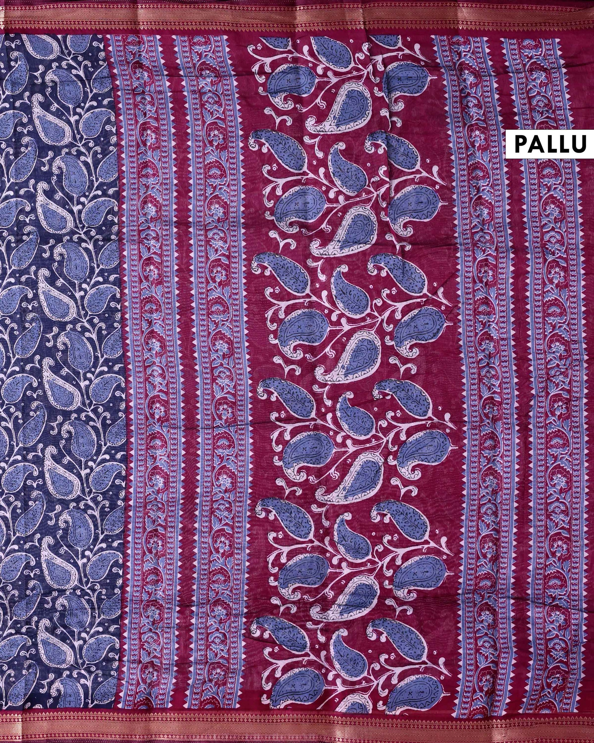 Elegant Semi Chanderi Saree with Paisley Inspired Print and Contrast Zari Border - Blue