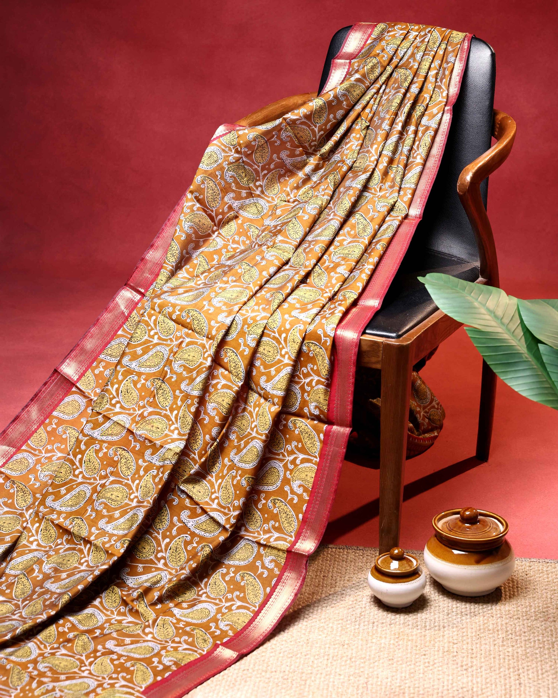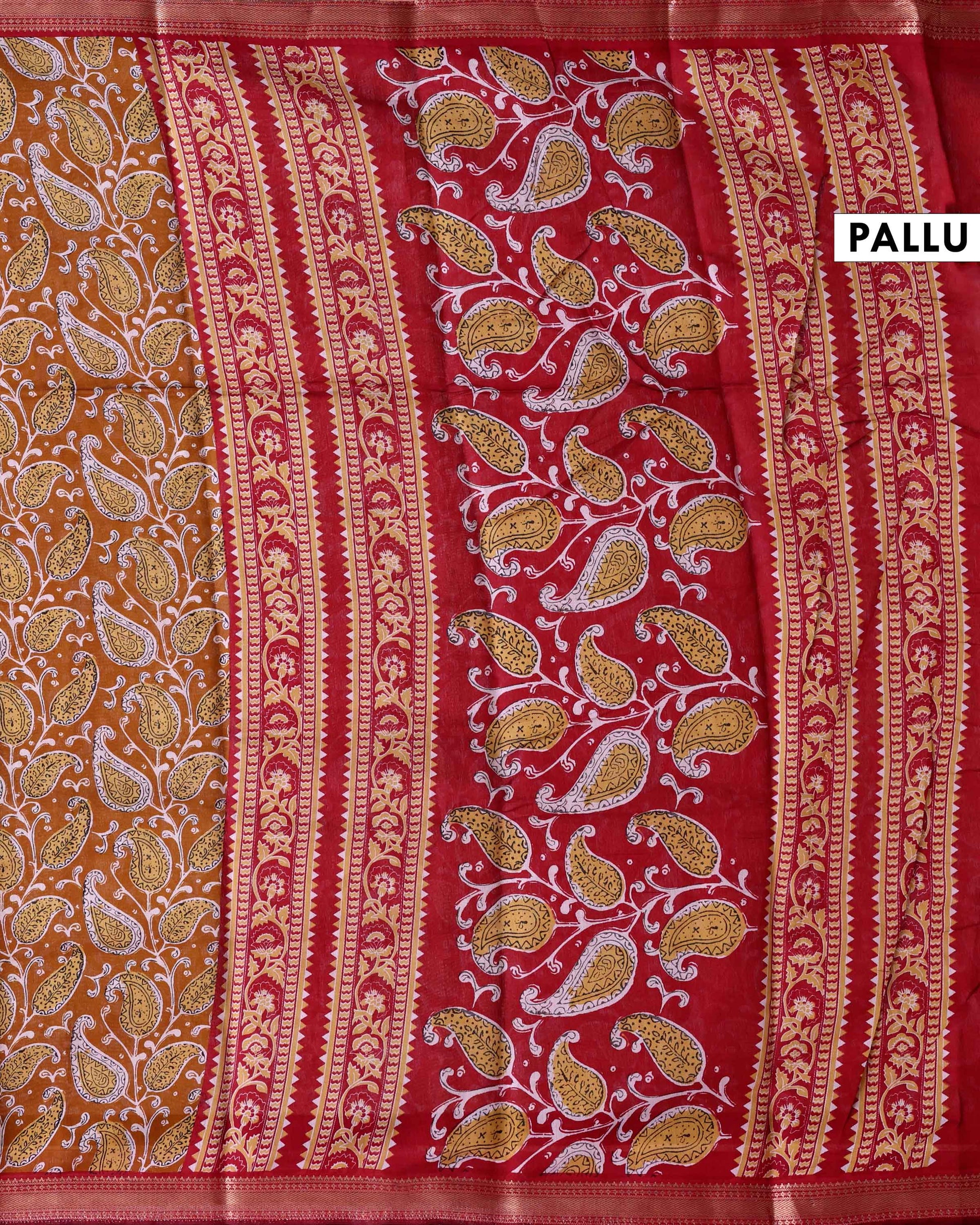 - This is an elegant Mustard colour semi chanderi saree with paisey inspired all over print and intricate golden zari border perfect for everyday elegance.
