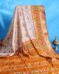 - Draped in elegance, this beautiful semi chanderi saree a classic white body adorned with vibrant red and green dotted motifs perfectly contrasted by a rich mustard yellow border and pallu showcasing traditional geometric patola inspired patterns.