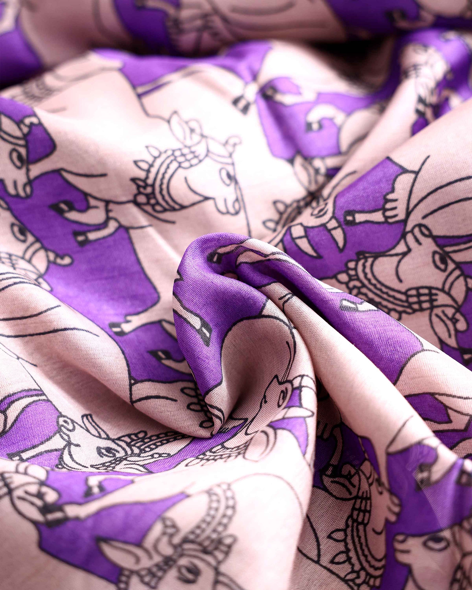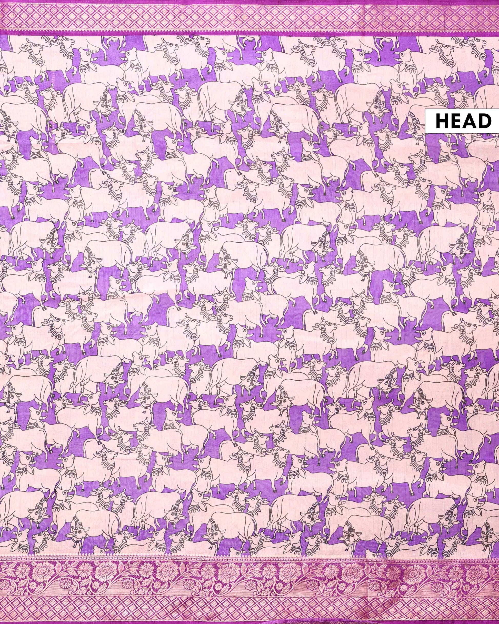 - Elevate your ethnic wardrobe with this exquisite white and Purple semi chanderi saree a unique allover Nandi cow print.