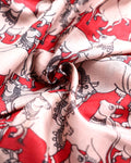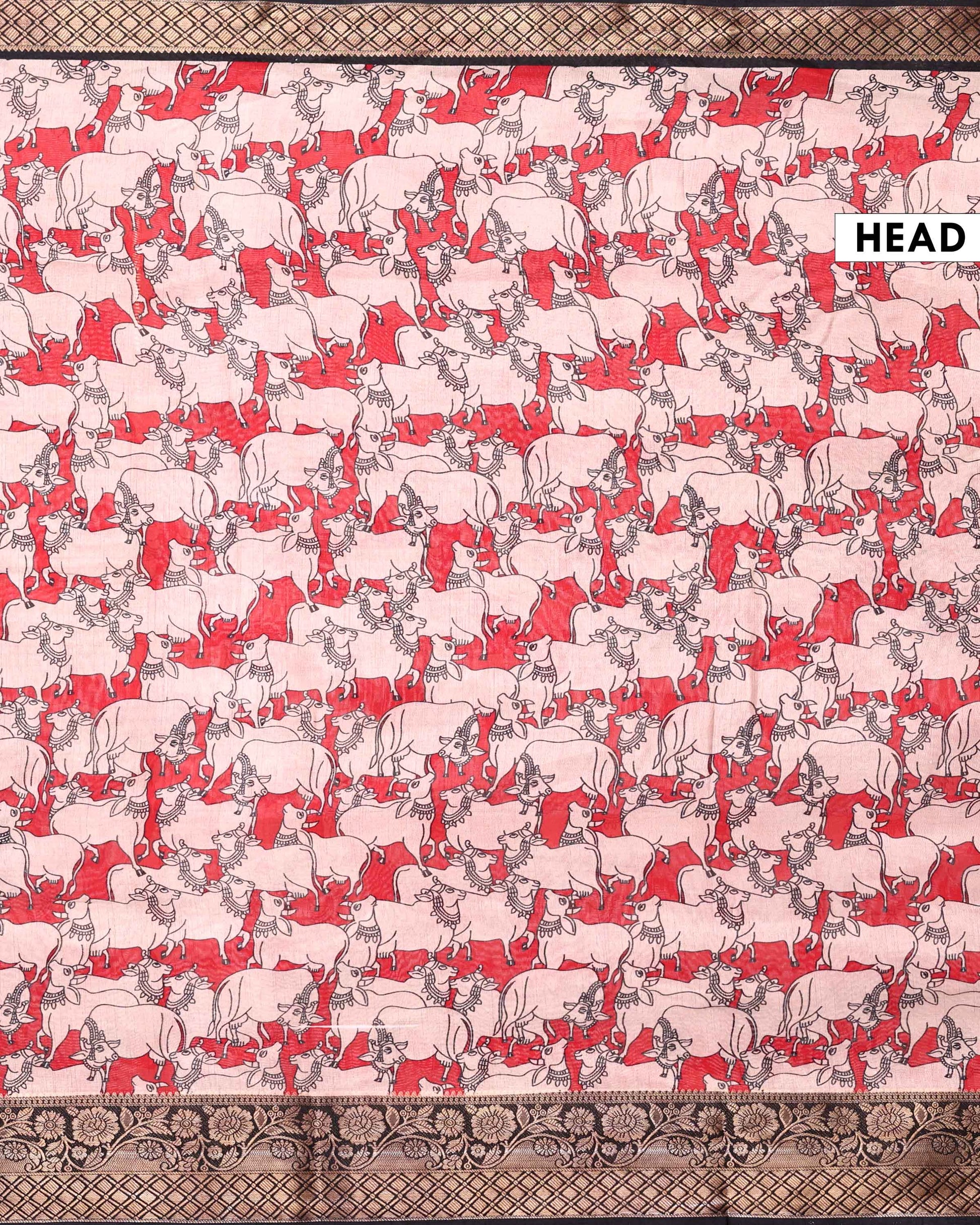 - Elevate your ethnic wardrobe with this exquisite white and red semi chanderi saree a unique allover Nandi cow print.