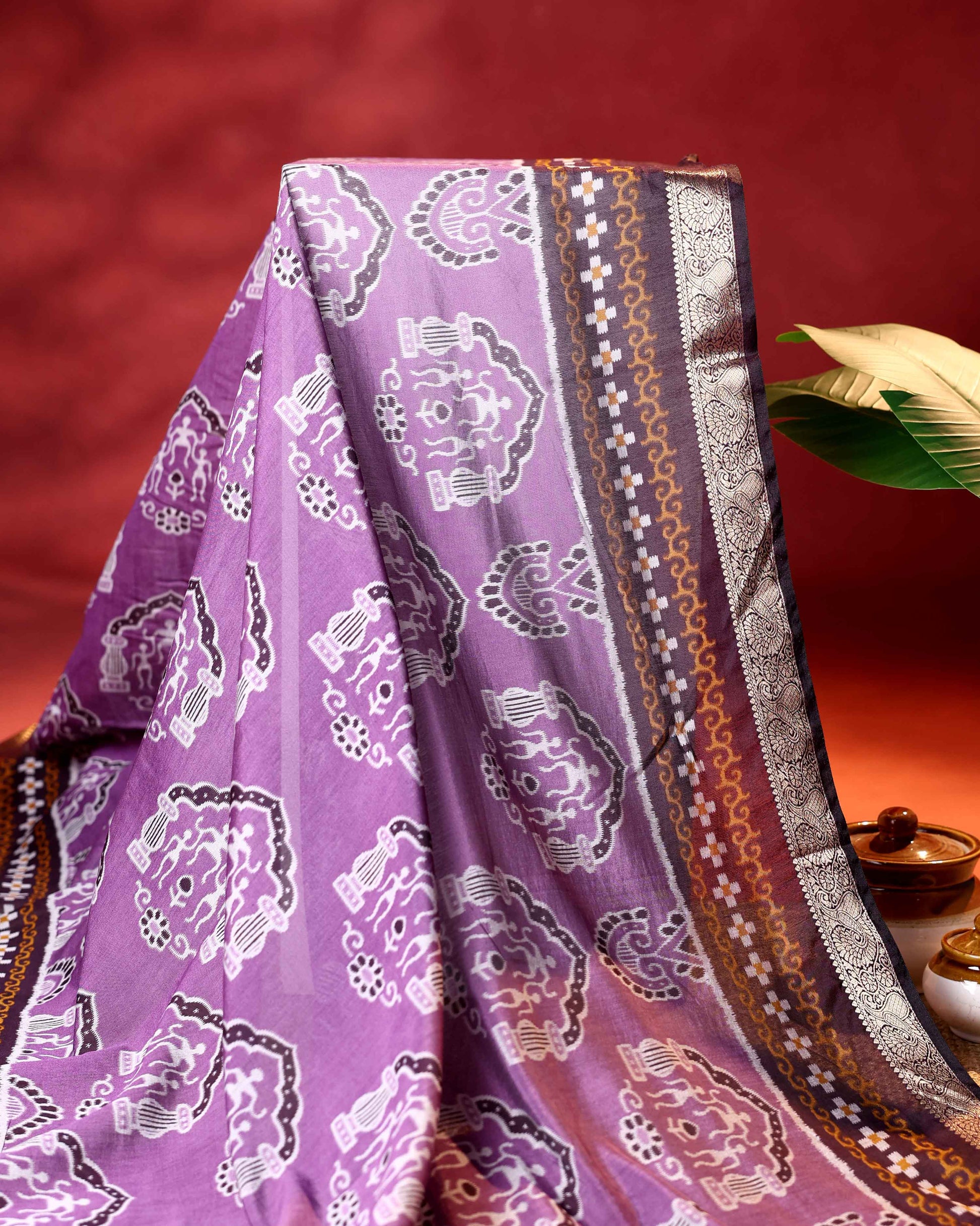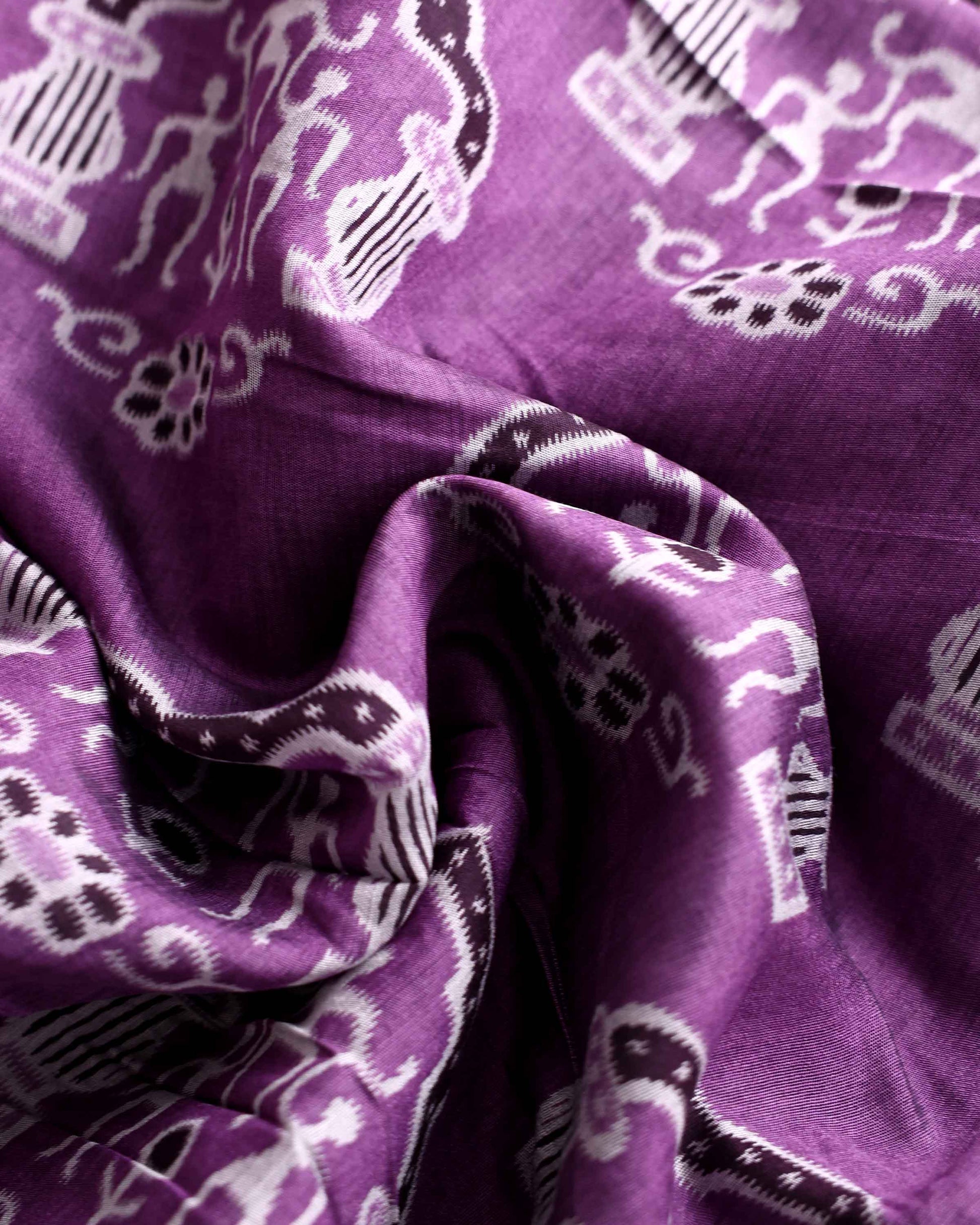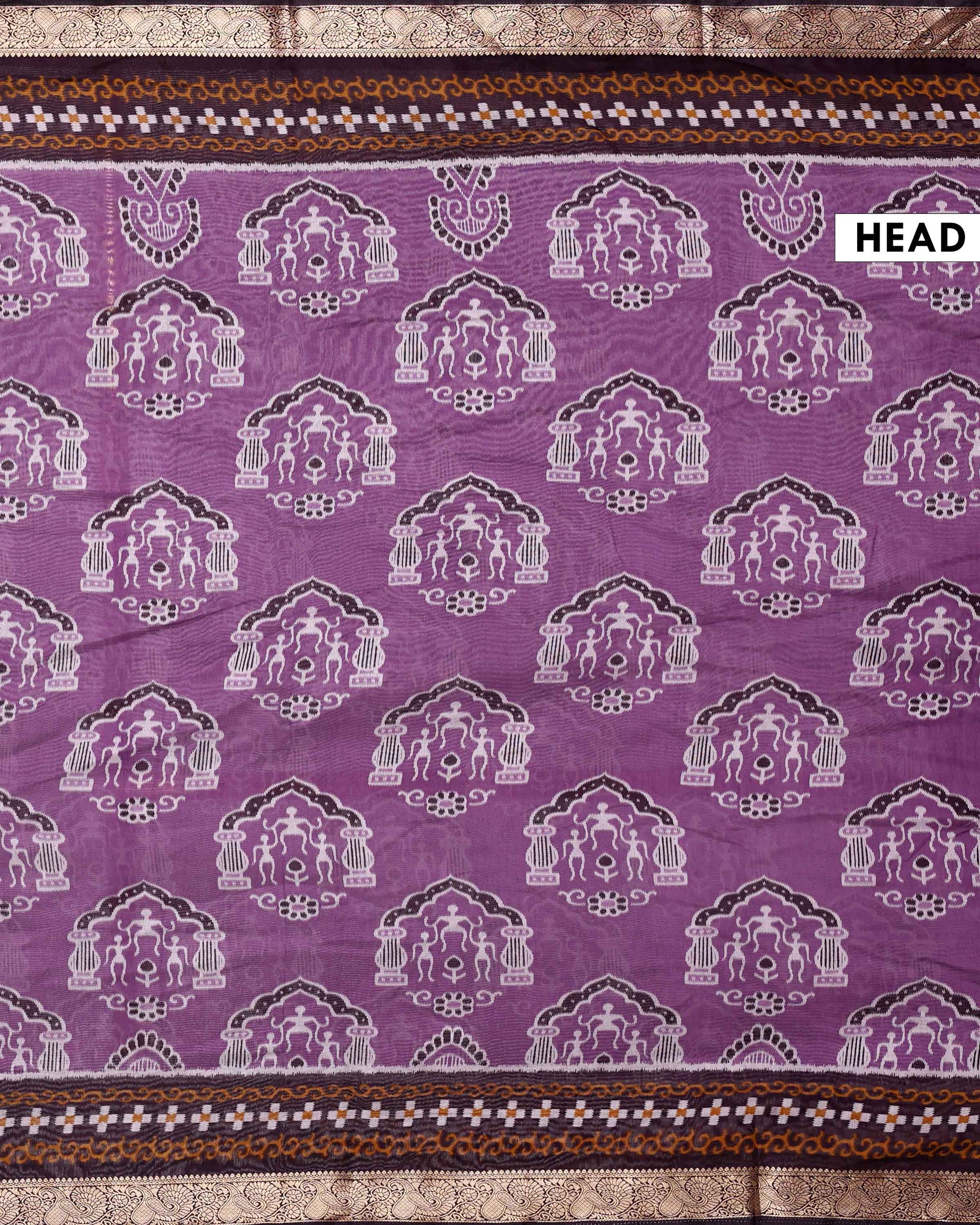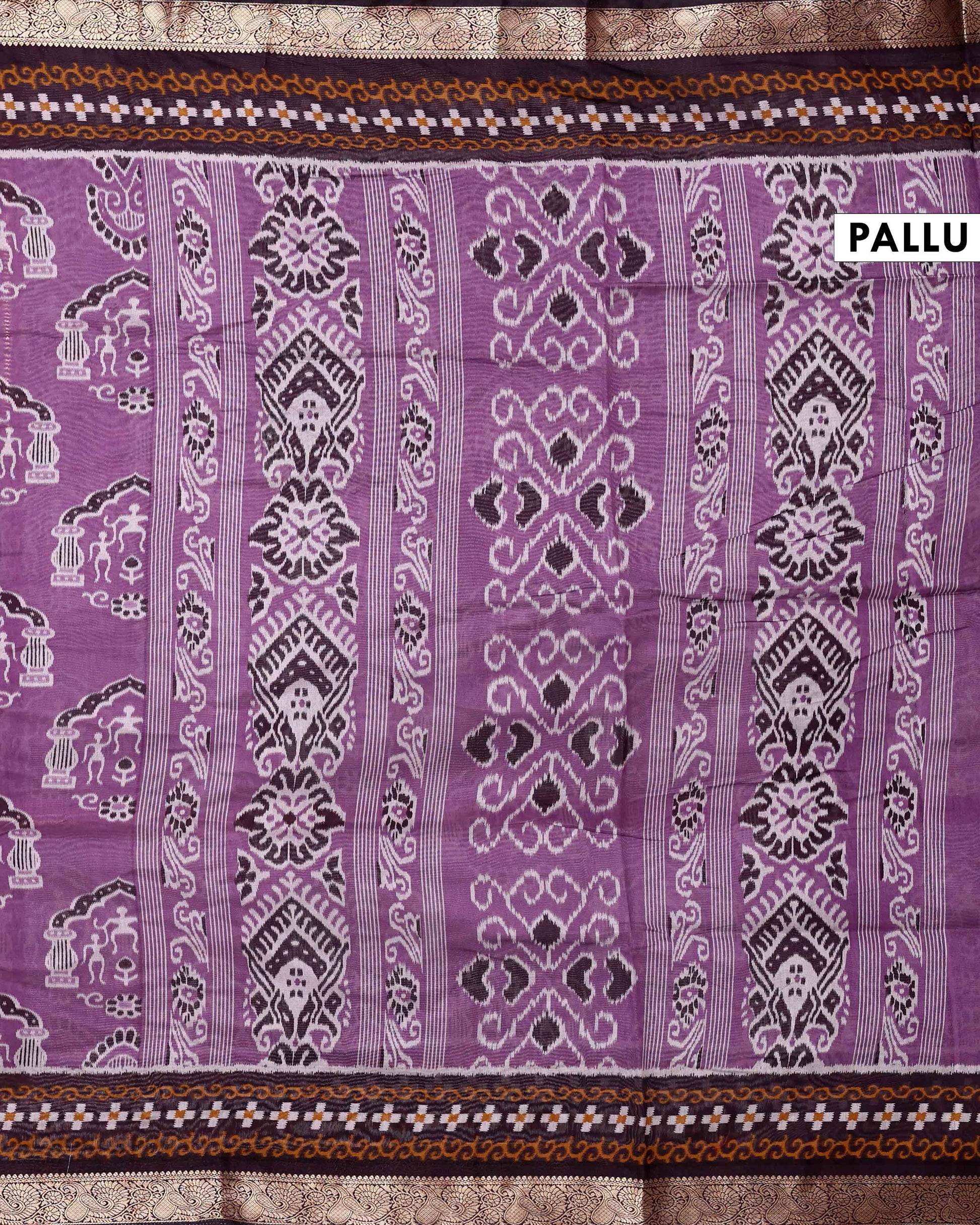 - This elegant purple semi chanderi saree a charming all over ikkat pattern and a sophisticated dark border, perfect for contemporary festive wear.