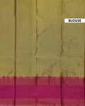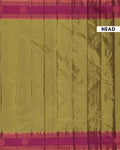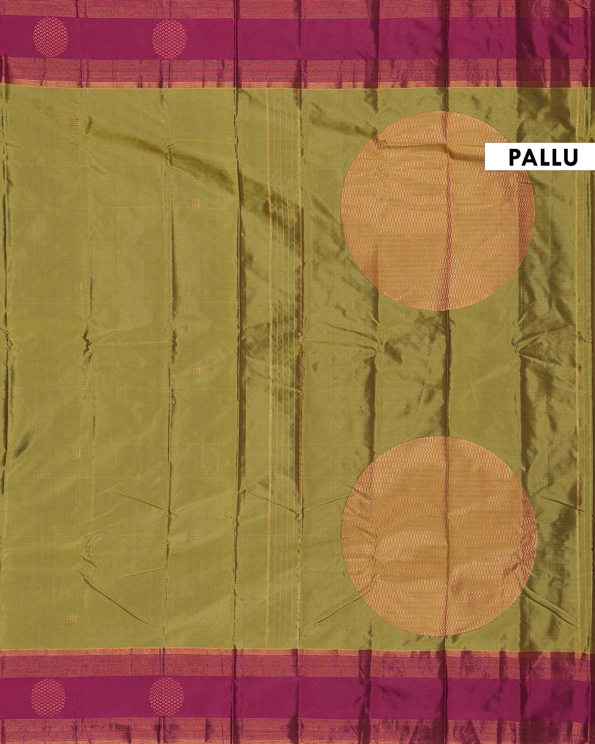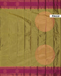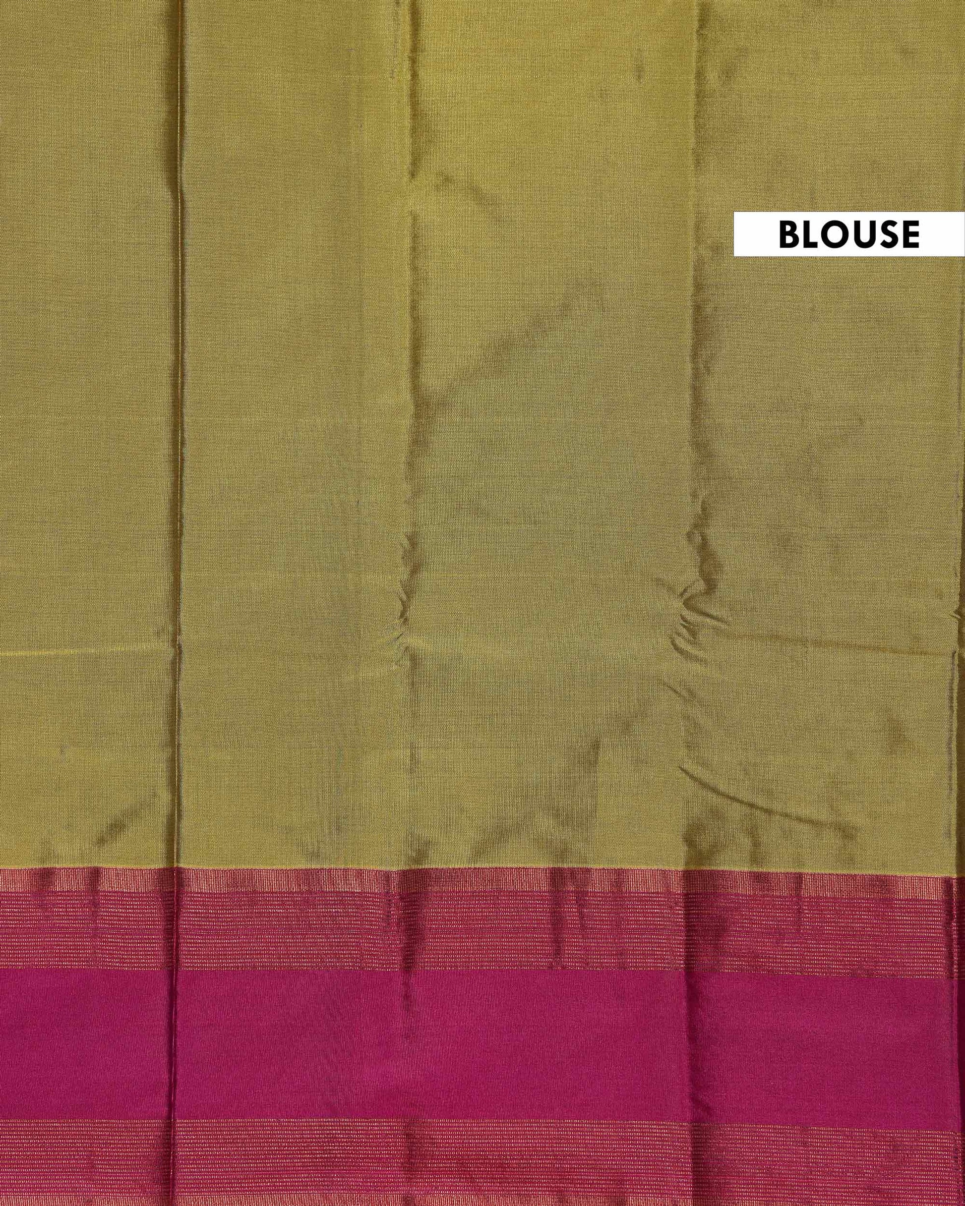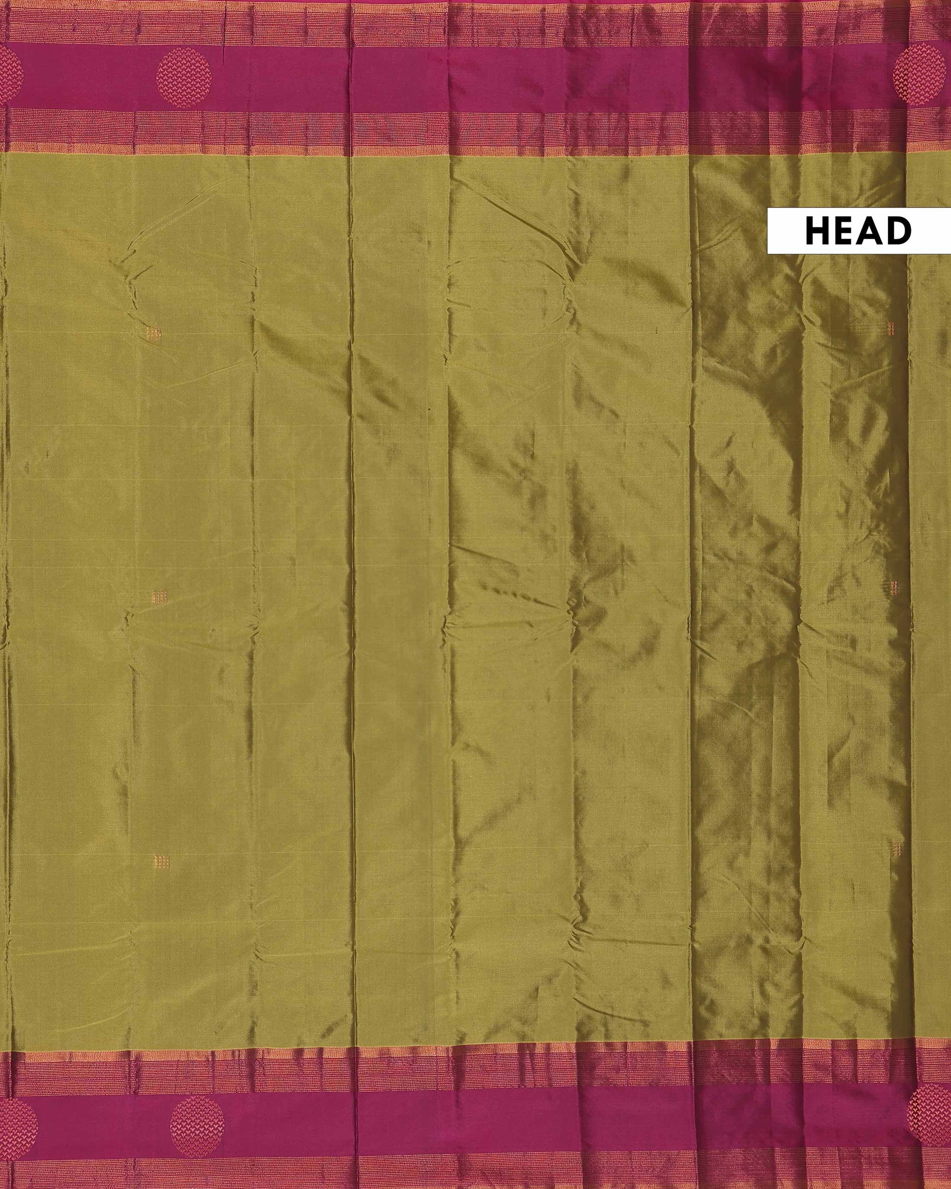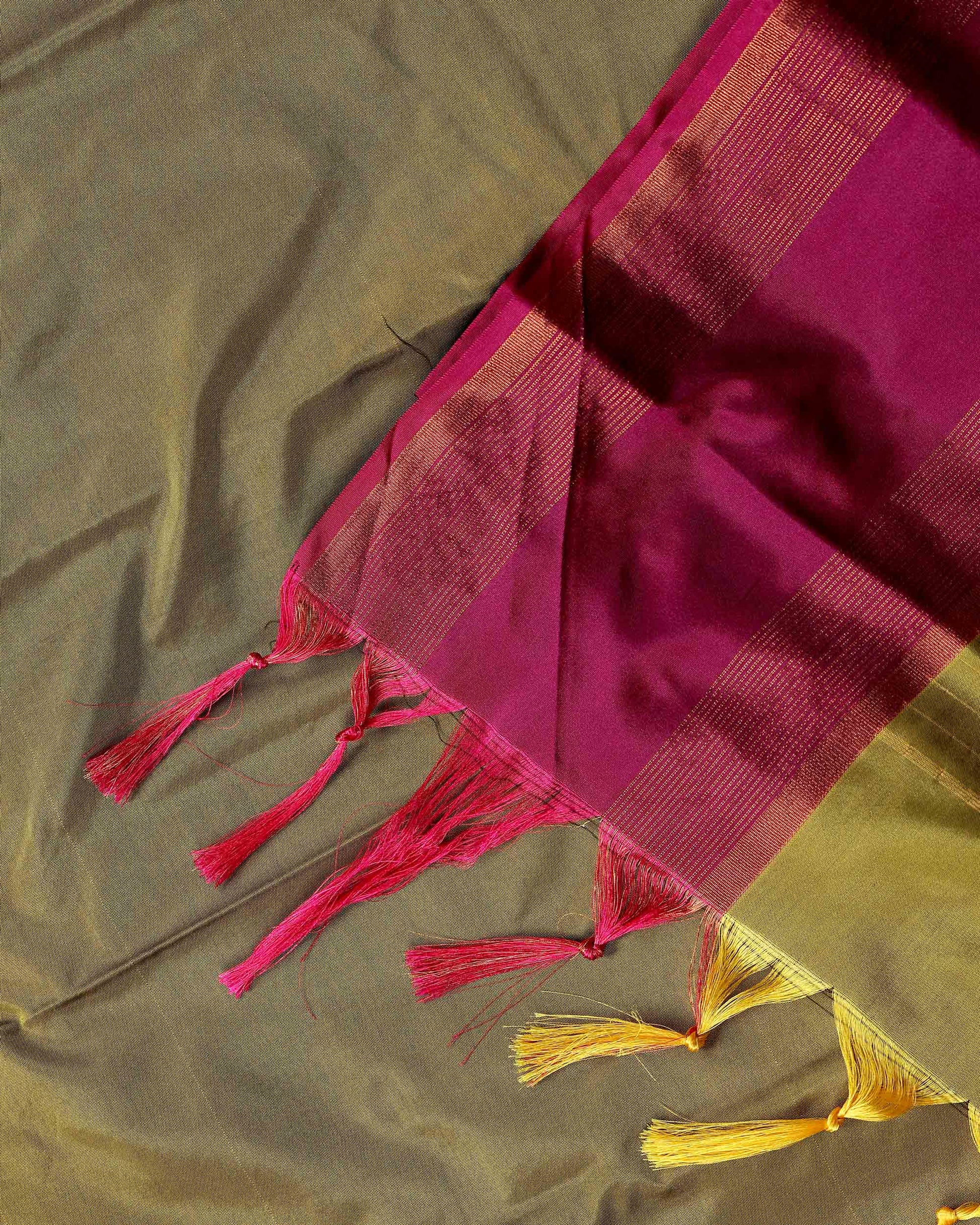 Elevate your style with this stunning olive green soft silk saree a rich contrasting magenta border adorned with intricate zari work.
