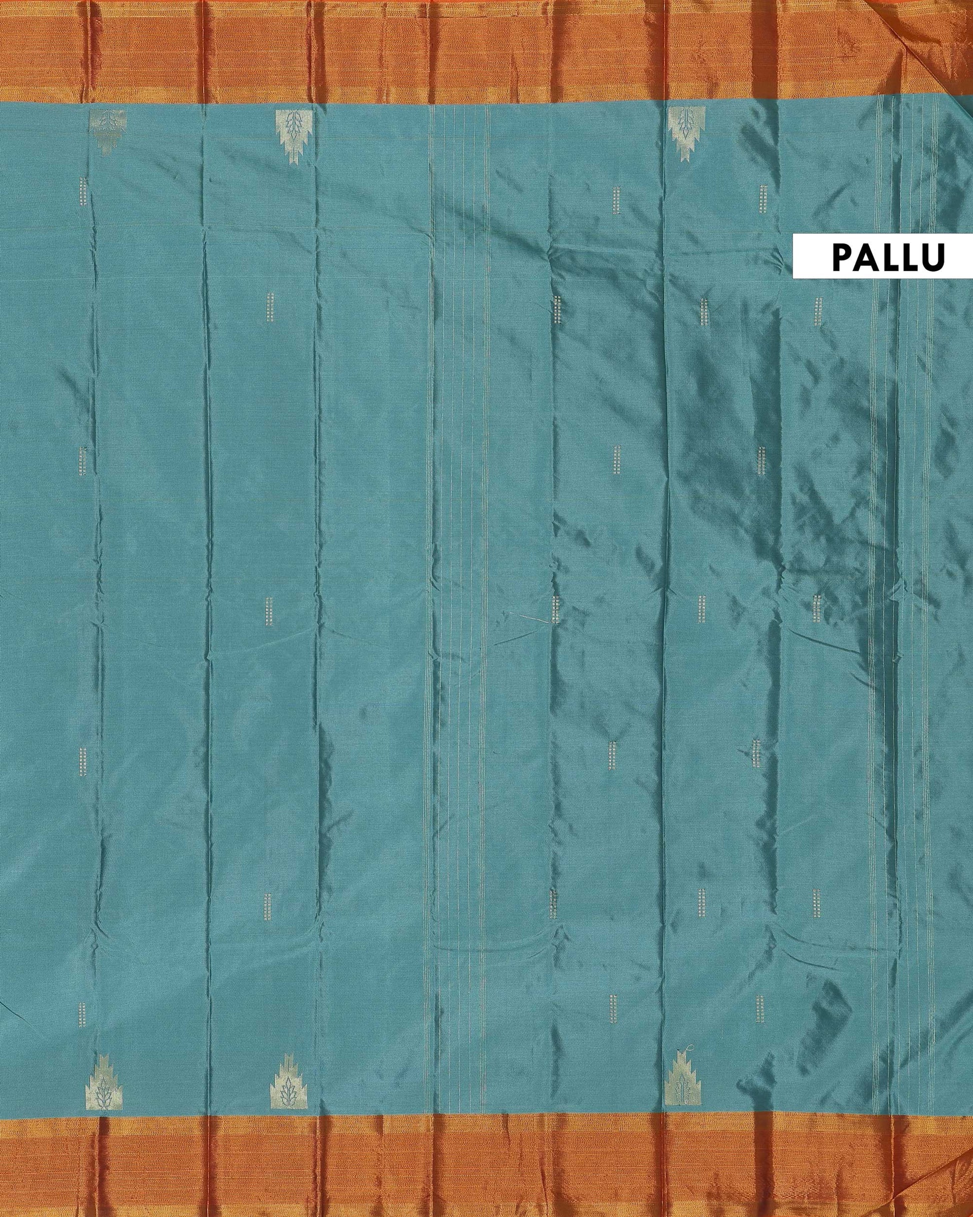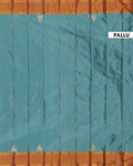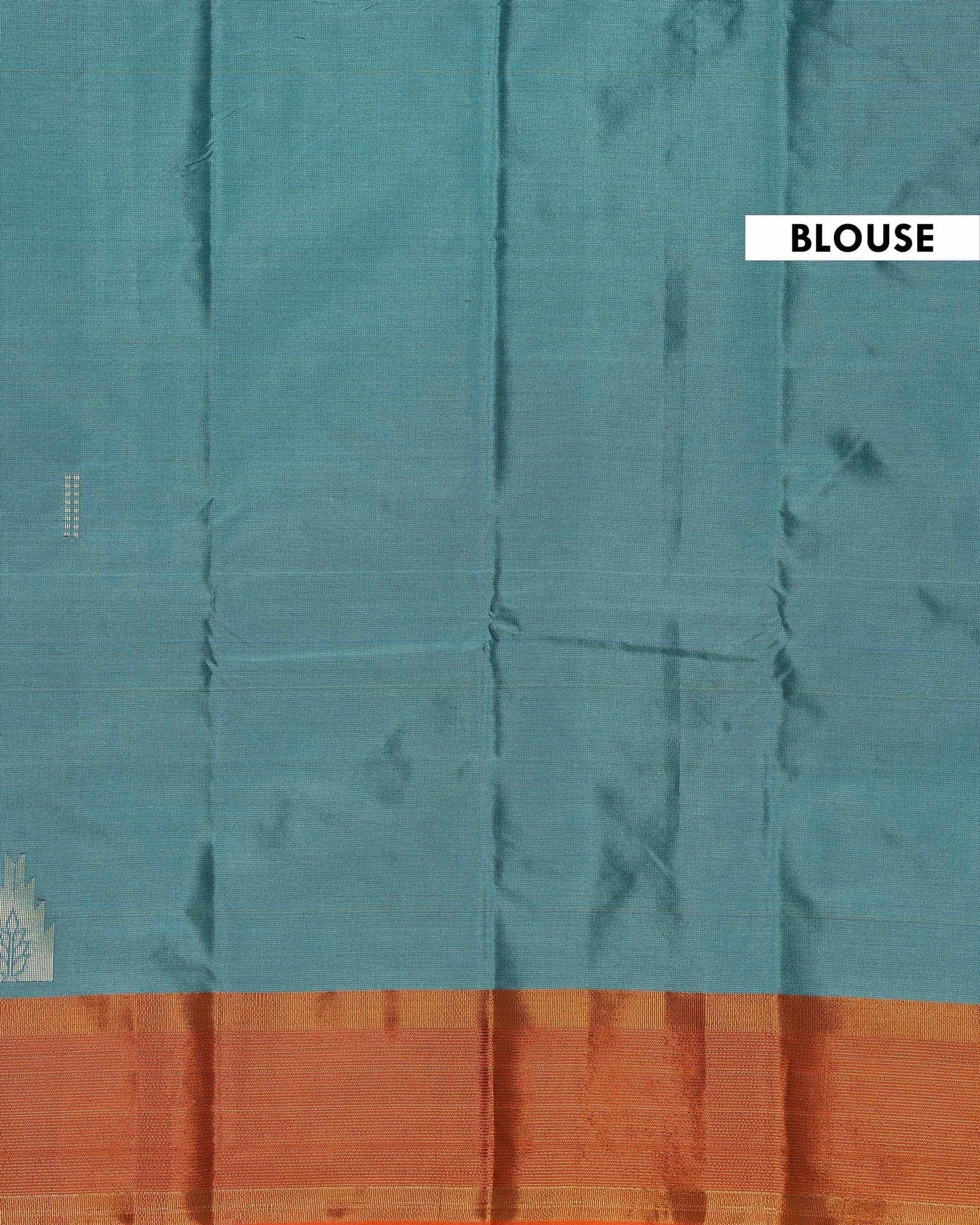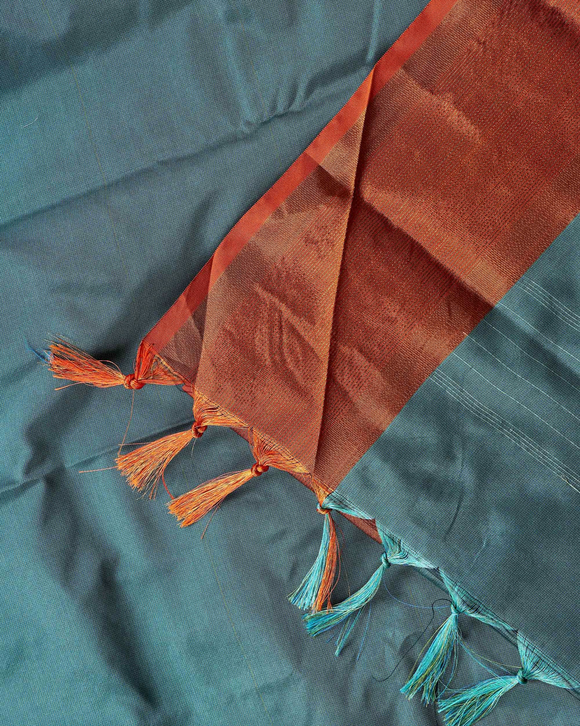 - This stunning teal blue semi soft silk saree with its rich rust orange border offers timeless elegance and comfort