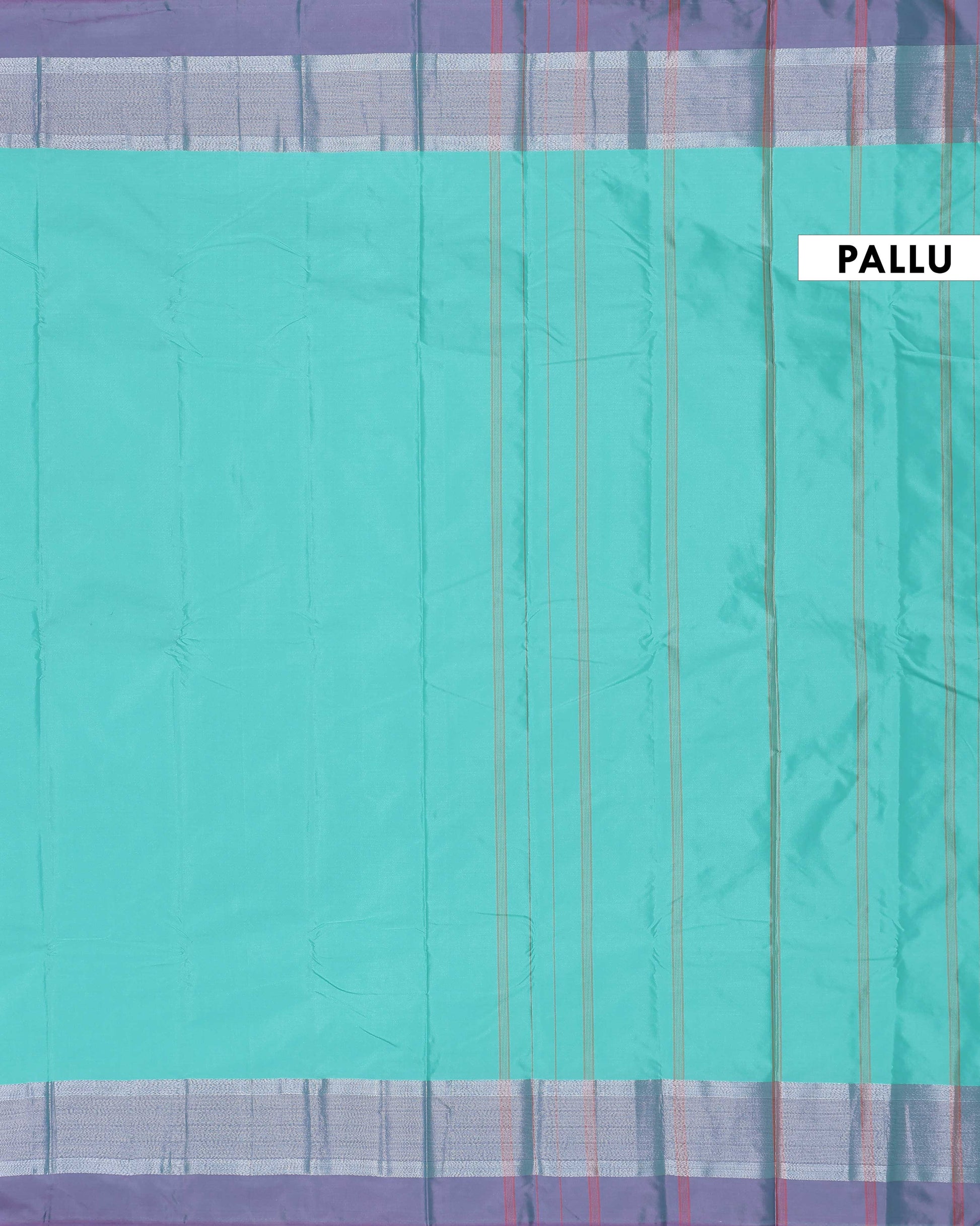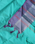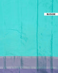 - This elegant turquoise blue soft silk saree features a striking grey contrast border and a luxurious, soft texture