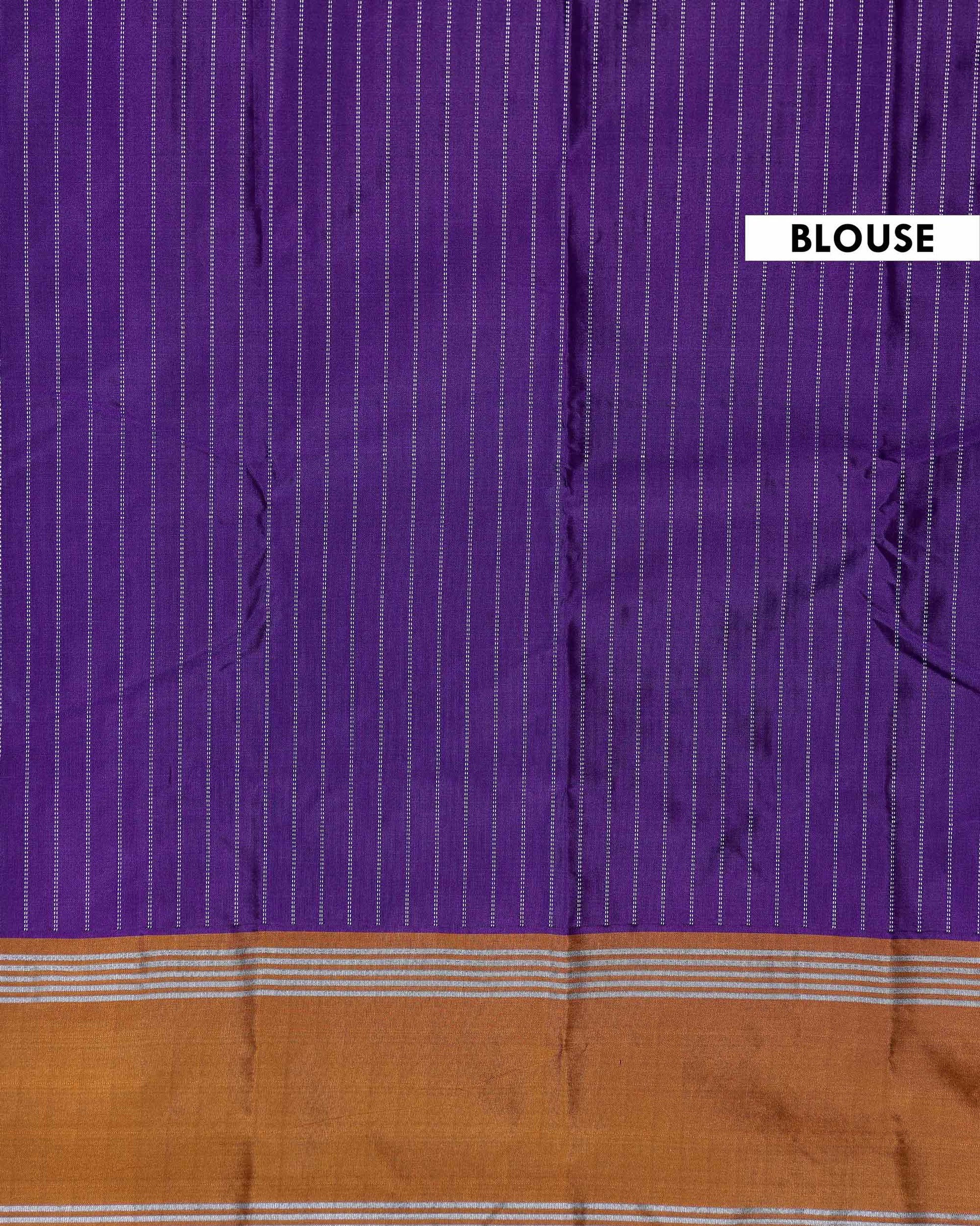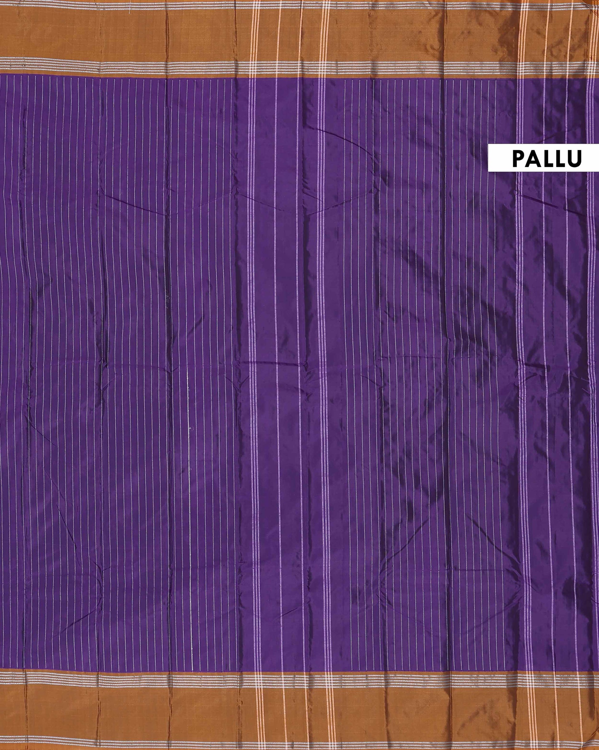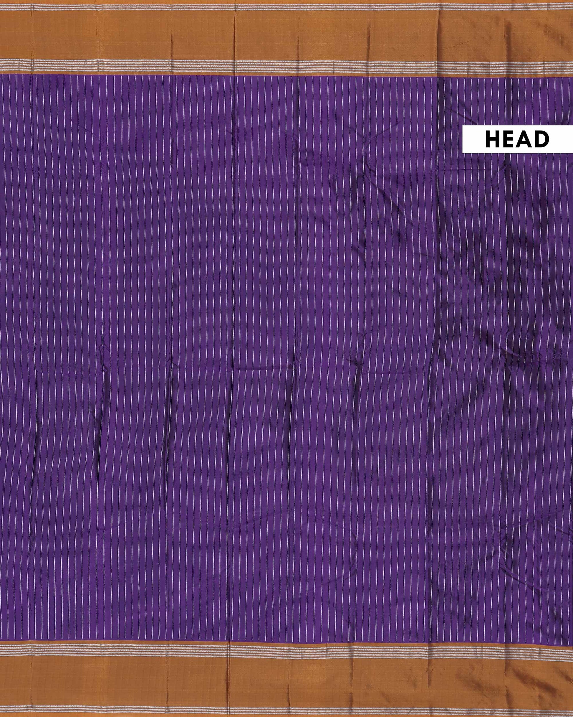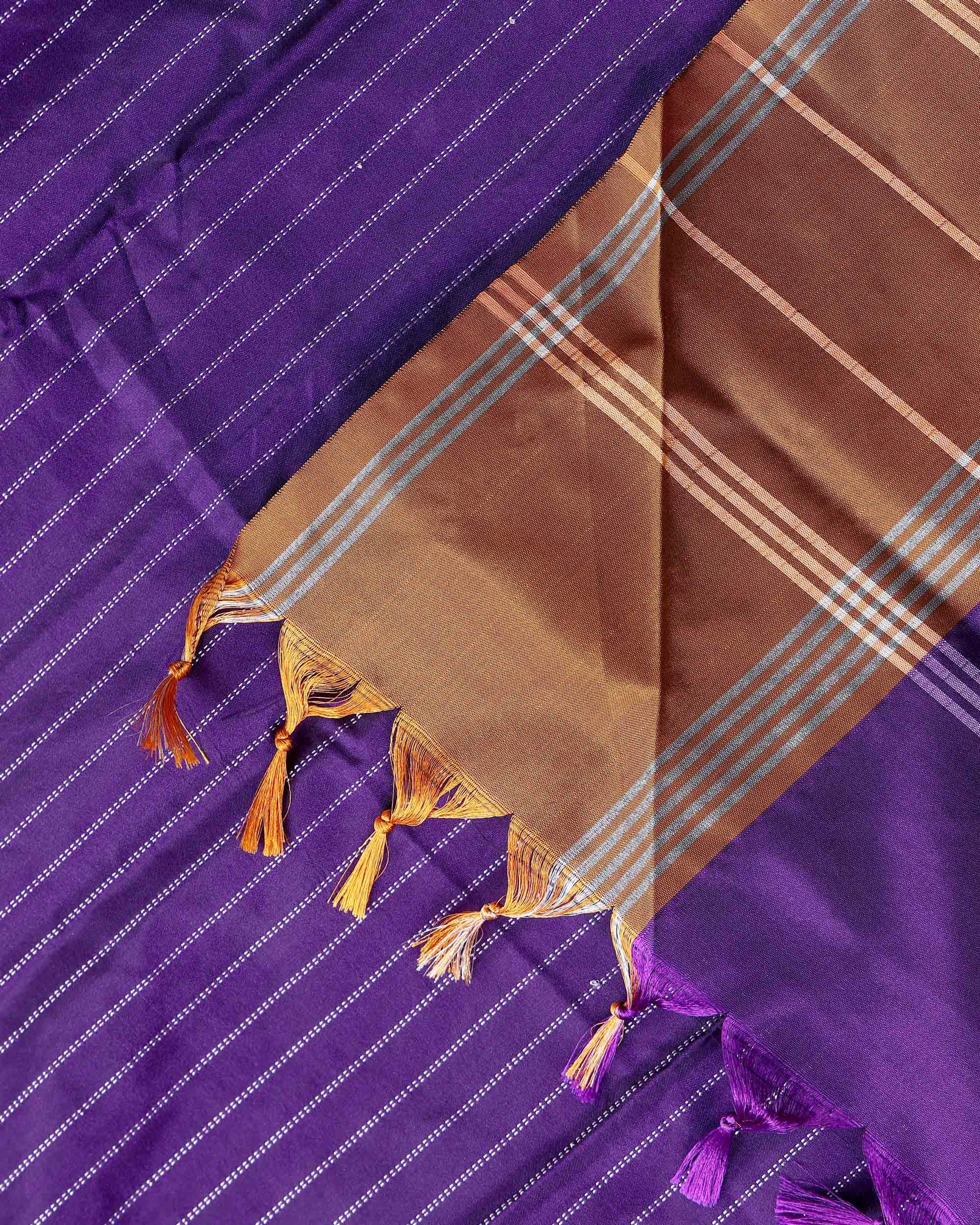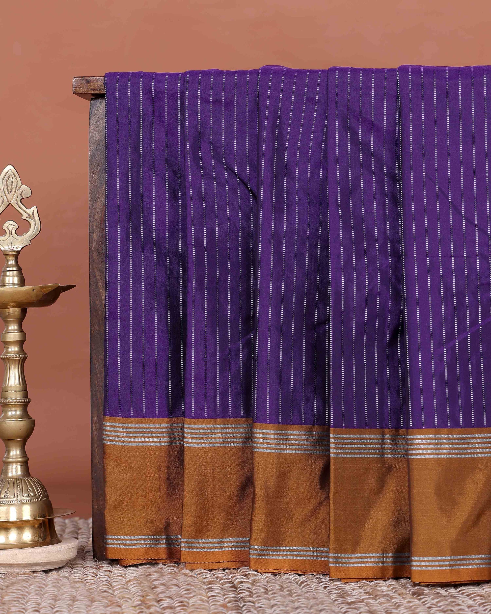 - Elevate any occasion with this stunning purple soft silk saree elegant vertical zari stripes and a rich contrast brown border.