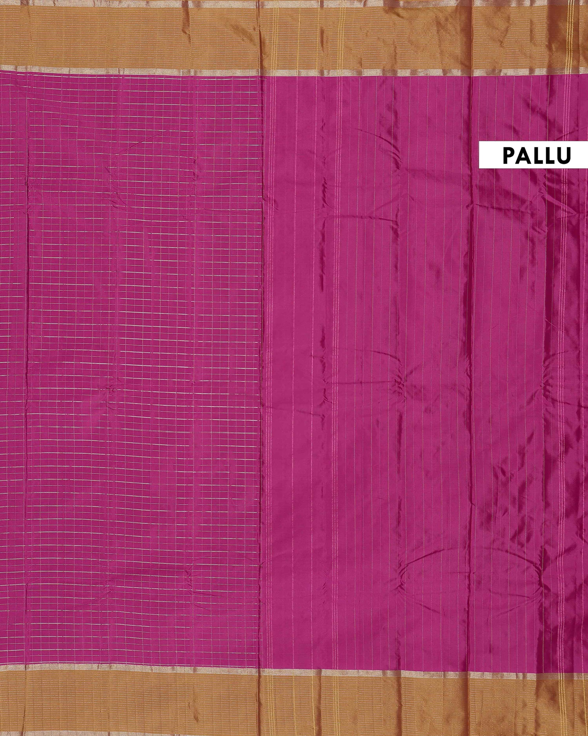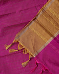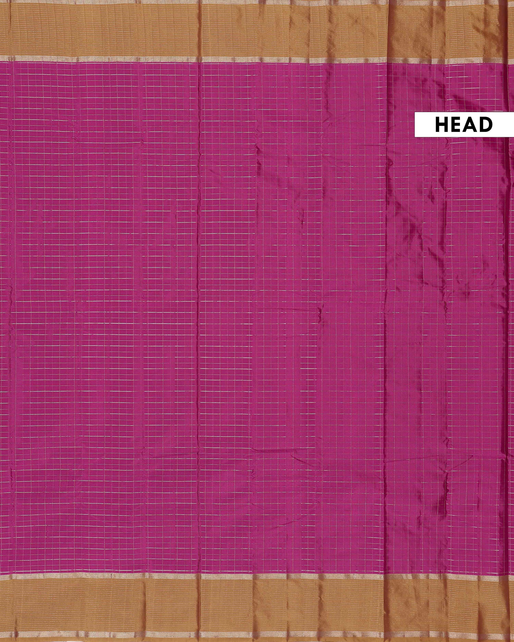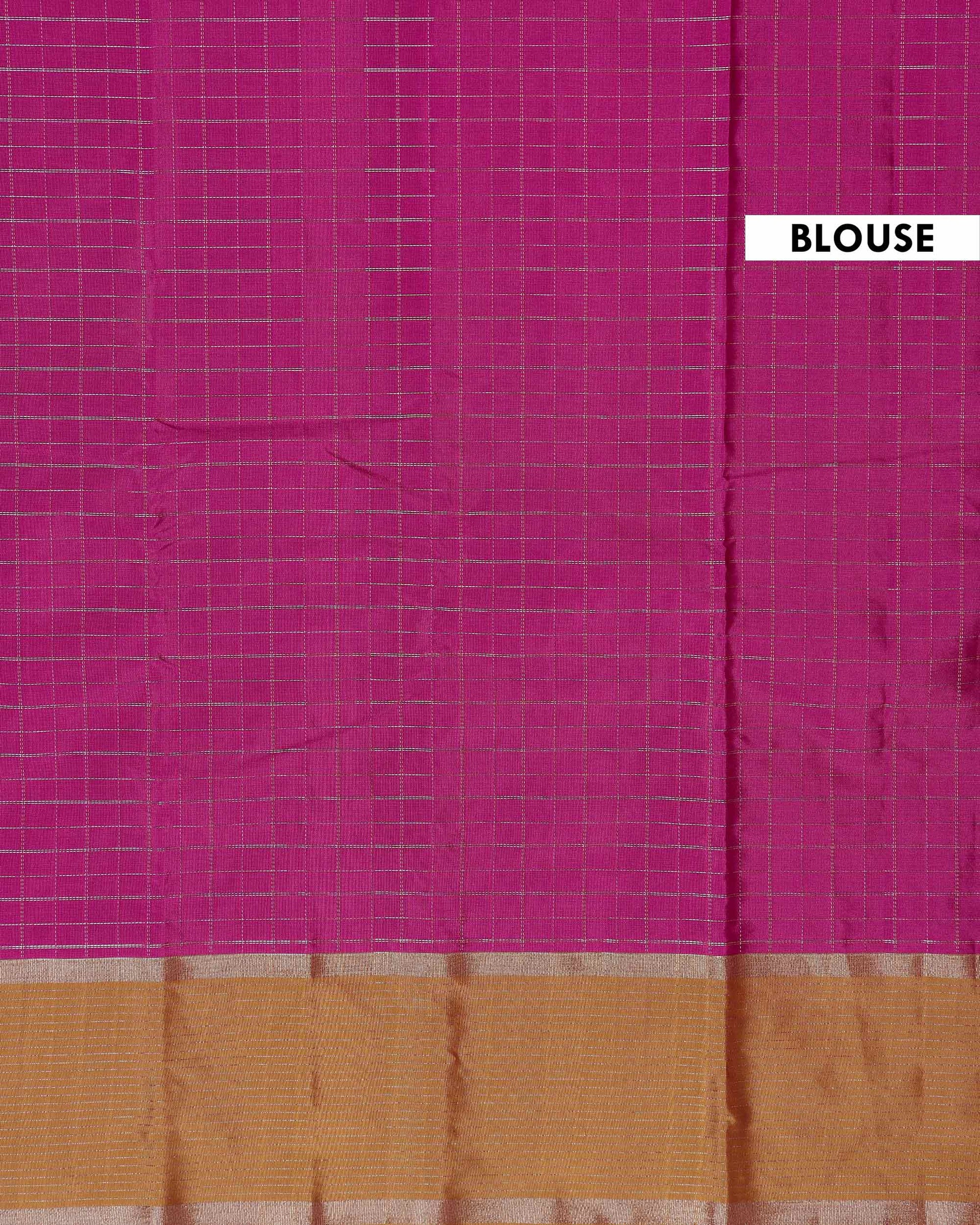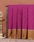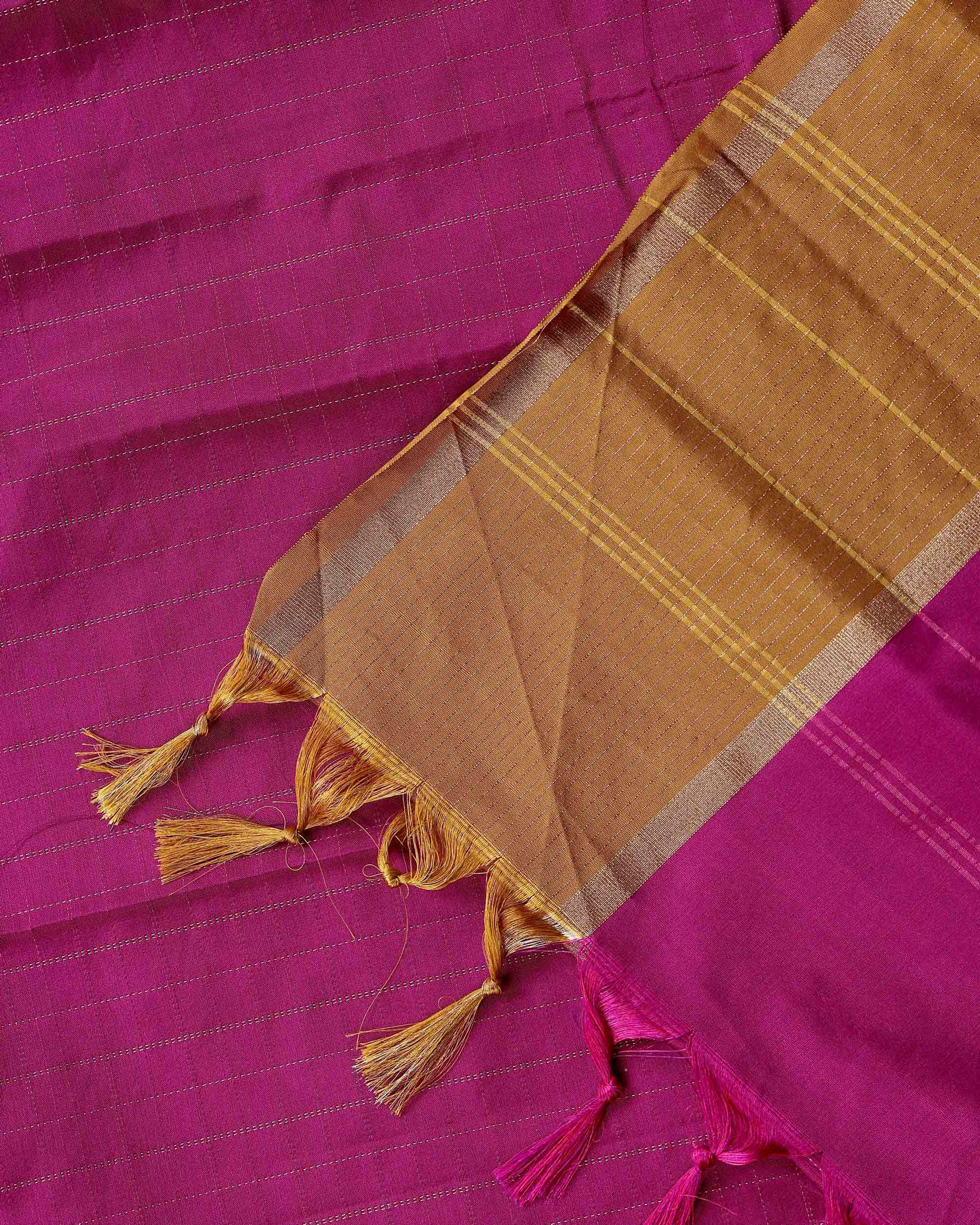 - A stunning magenta Semi Soft Silk Saree elegant zari checks and a rich gold border.