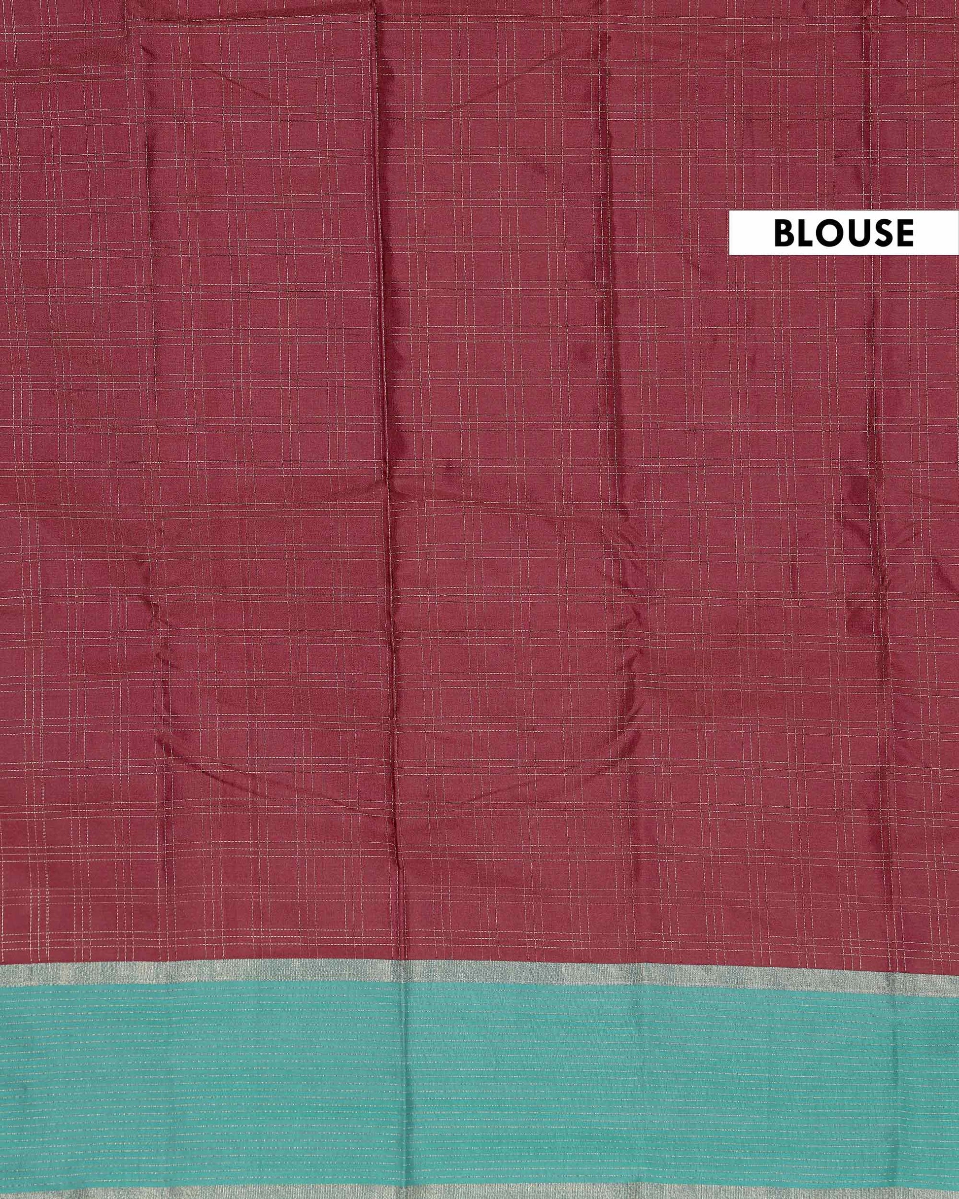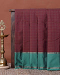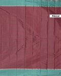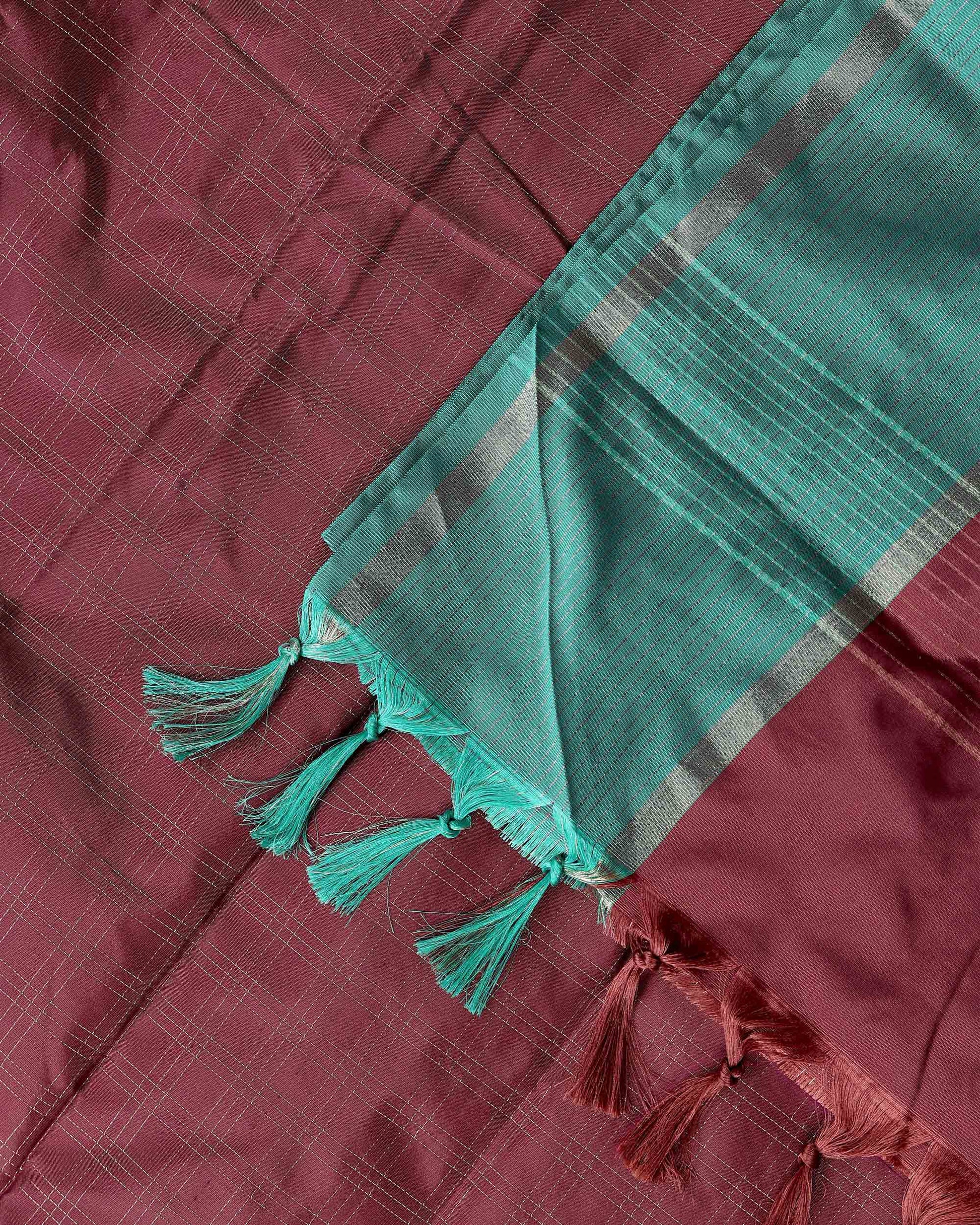- Elevate your ethnic style with this stunning purple soft silk saree delicate silver zari checks and a vibrant teal green contrast border.