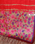 The vibrant red pallu and border are adorned with intricate, hand-painted floral and peacock motifs