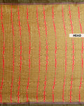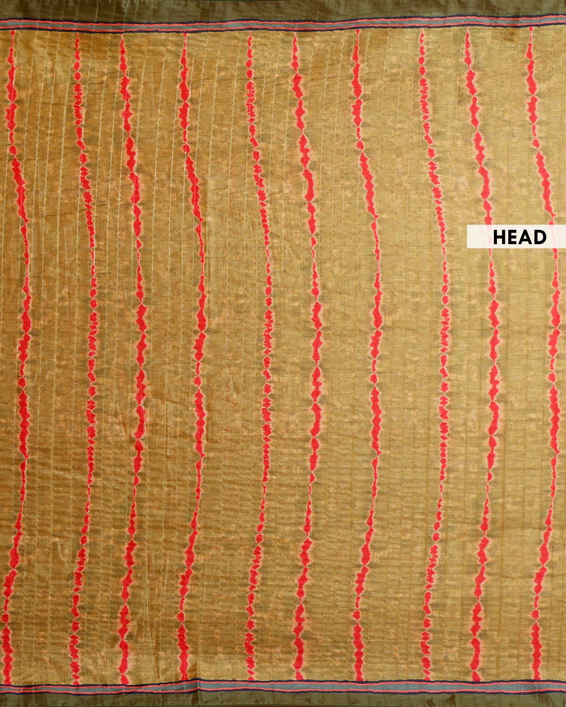- This handwoven Tussar silk saree features a rich olive green body with subtle tie-dye stripes