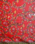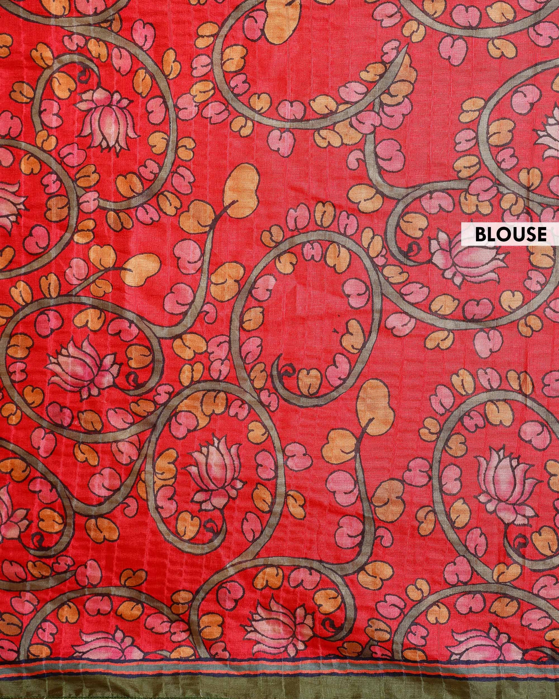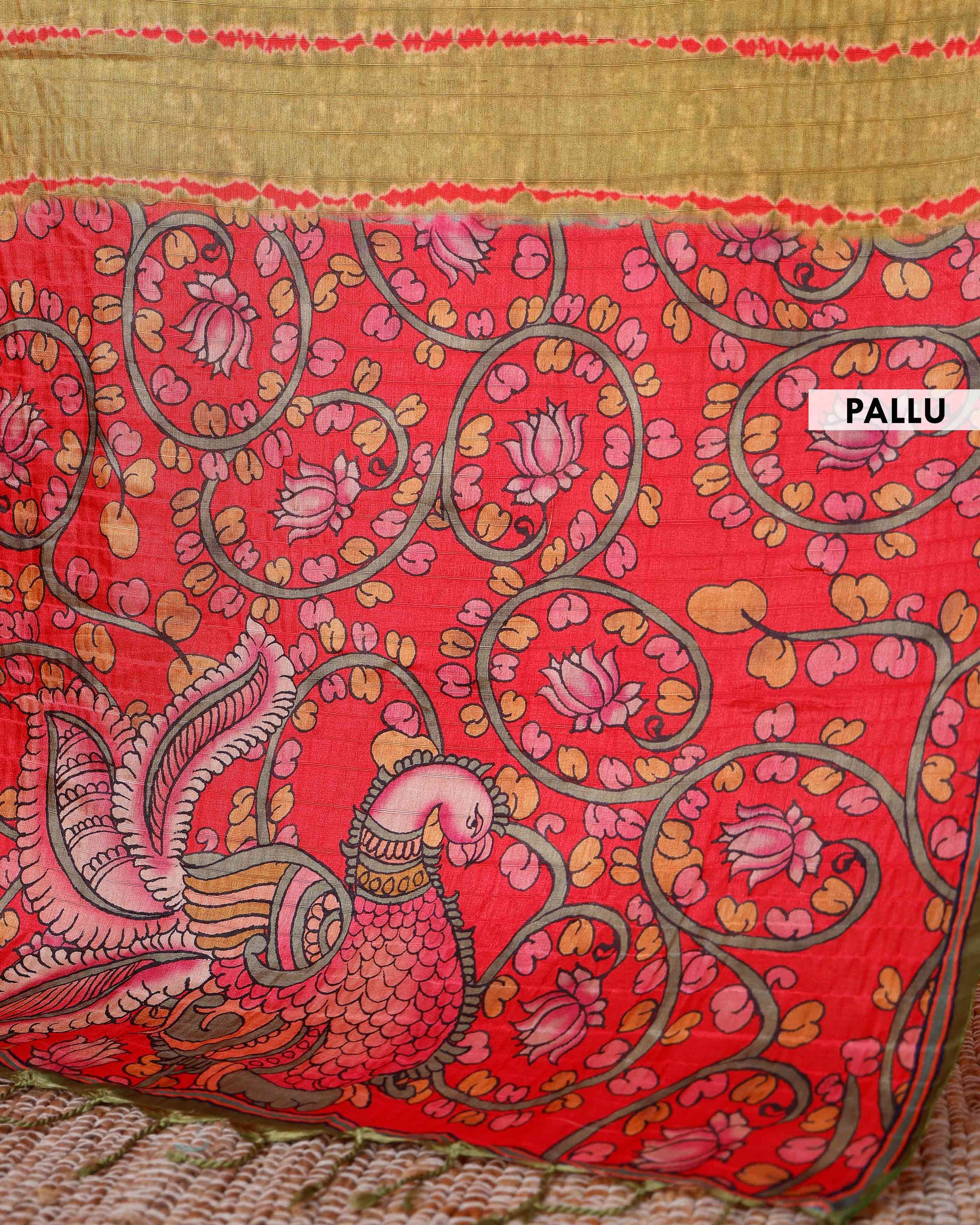 - The vibrant red pallu and border are adorned with intricate, hand-painted floral and peacock motifs, creating a striking contrast