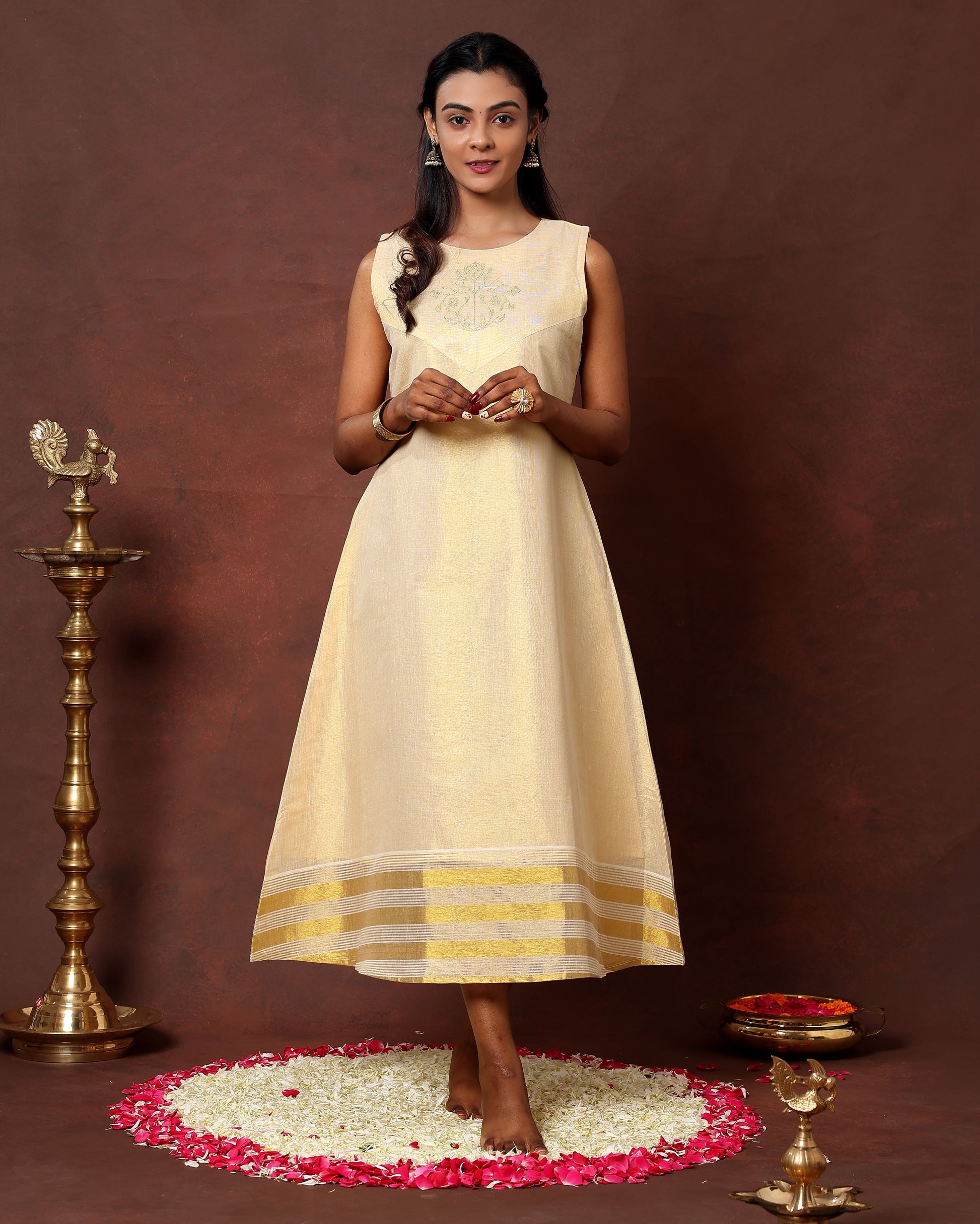 Elegant Sleeveless A-Line Kurta with Golden Border and Embroidered Yoke - Off-White