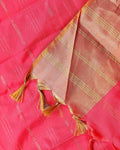 - This stunning handloom soft silk saree in vibrant pink is adorned with delicate vertical stripes offering a subtle yet brilliant sheen