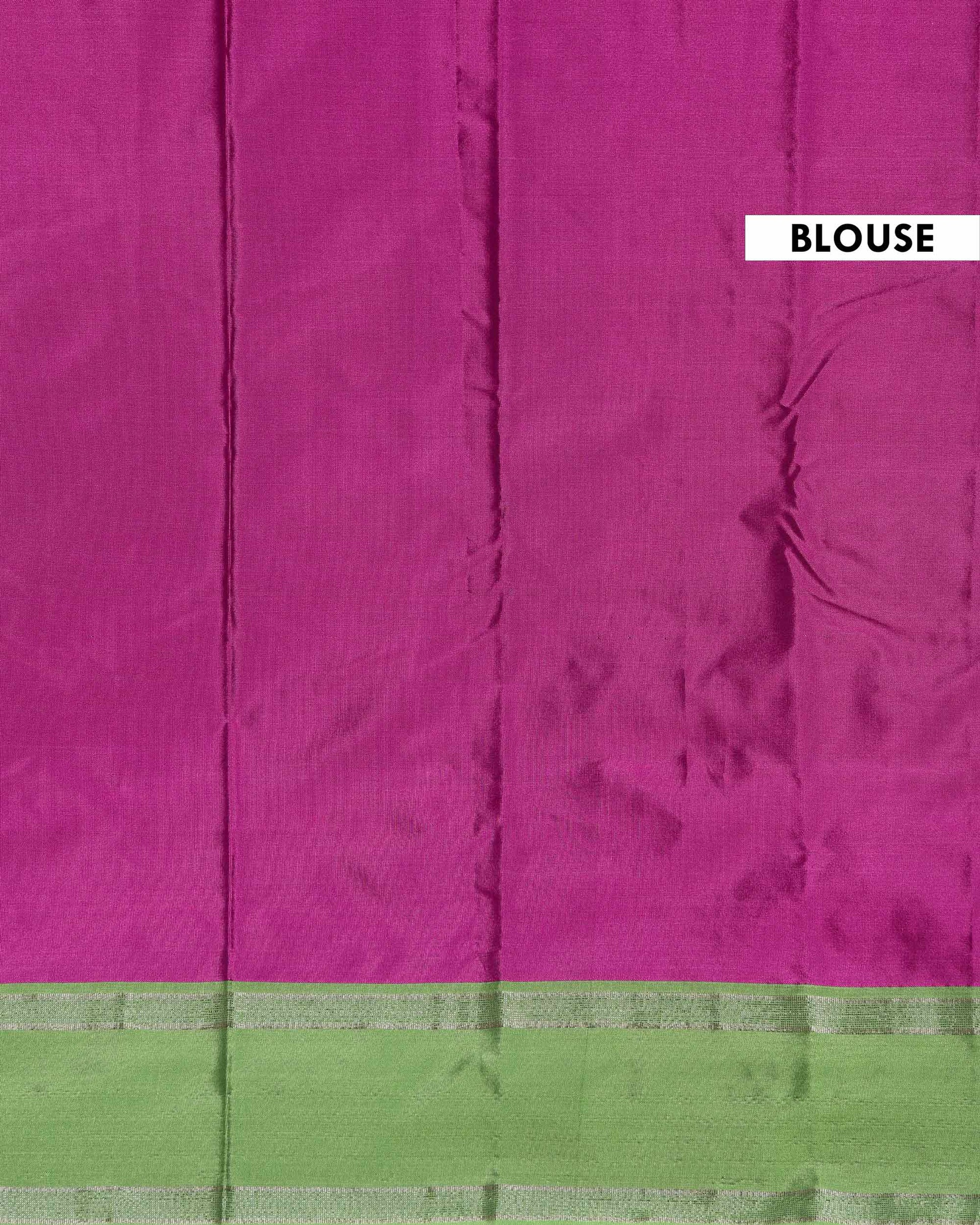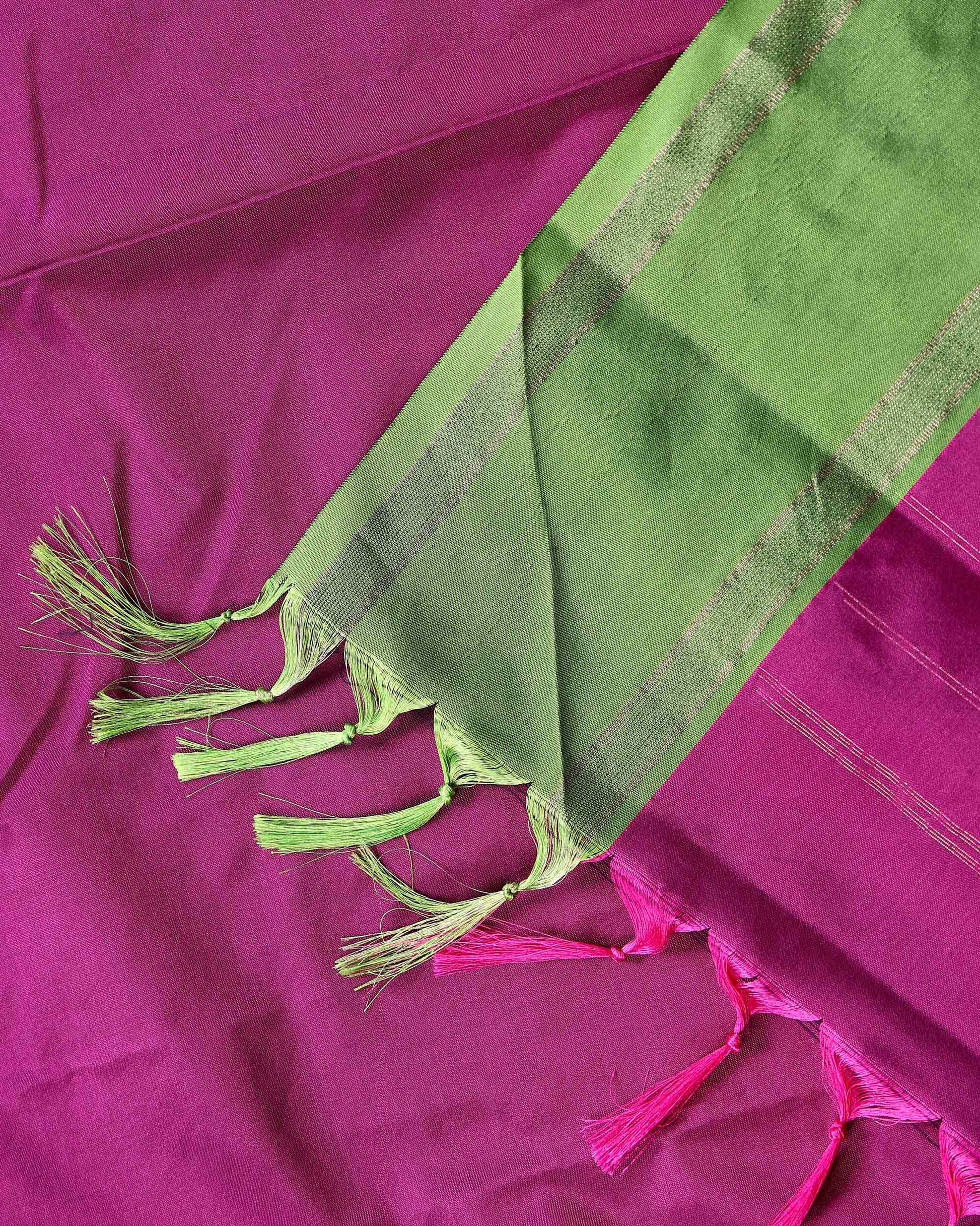 - This stunning soft silk saree a rich purple body and a contrasting pastel green border, a timeless and trending color combination.