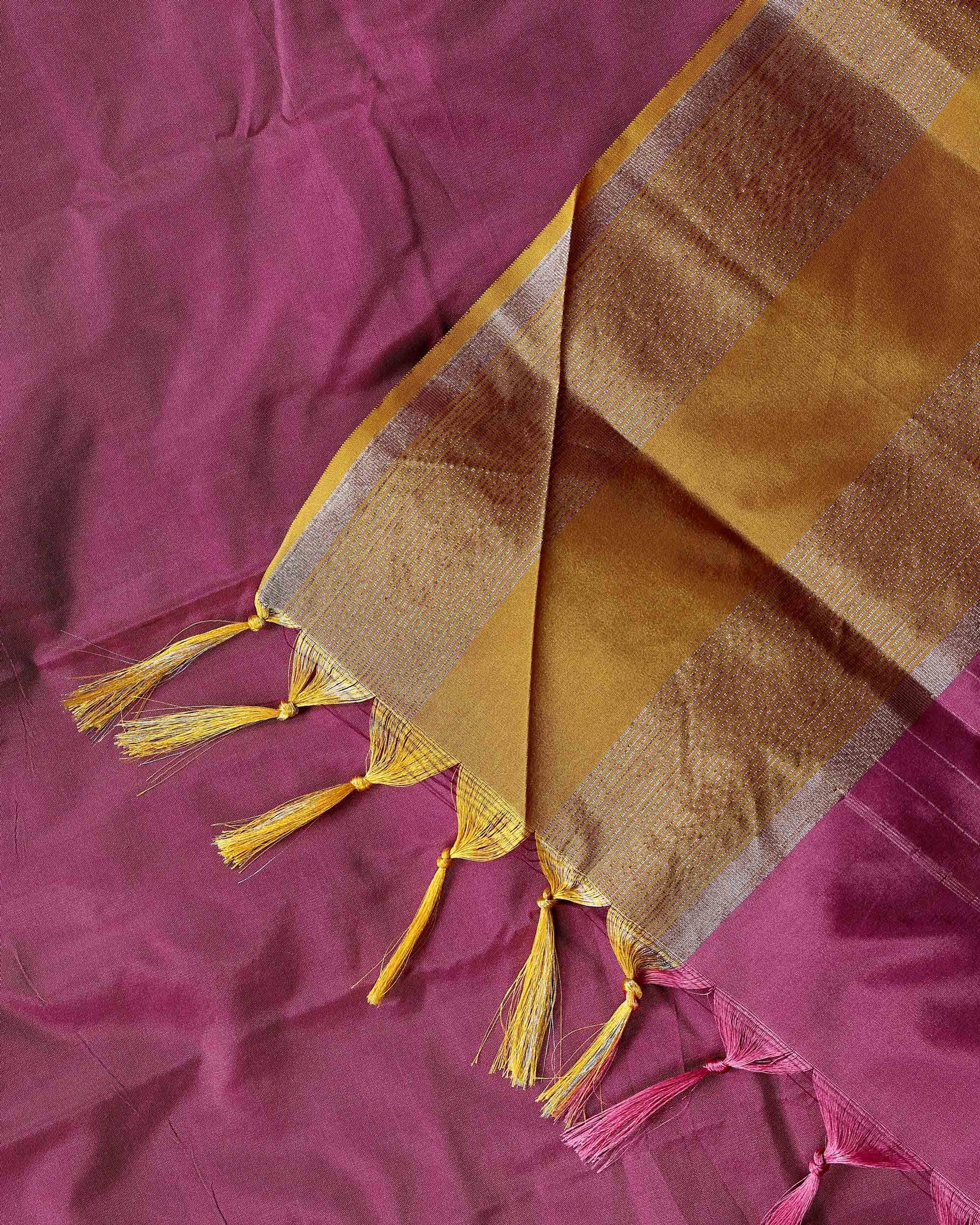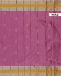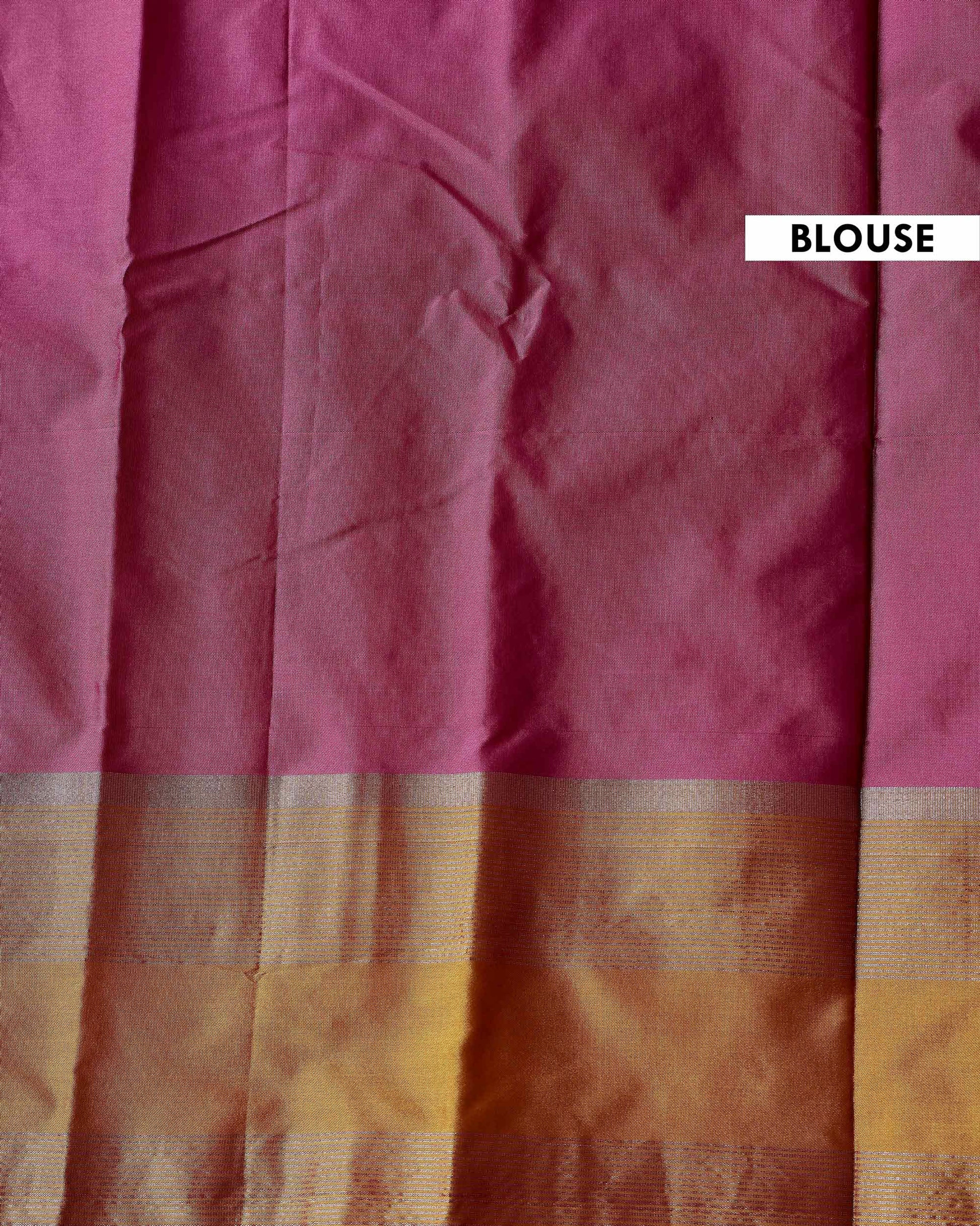- Drape yourself in the timeless elegance of this Deep Onion Pink semi soft silk Saree delicate traditional buttas and a rich, contrasting gold zari border.