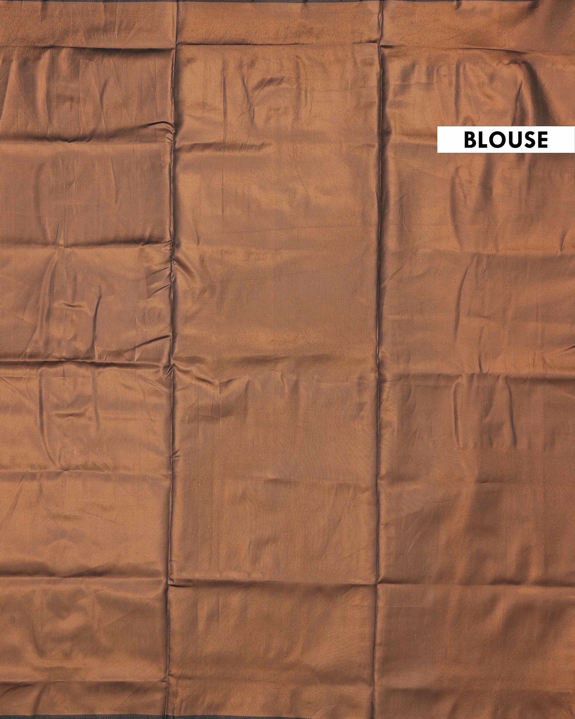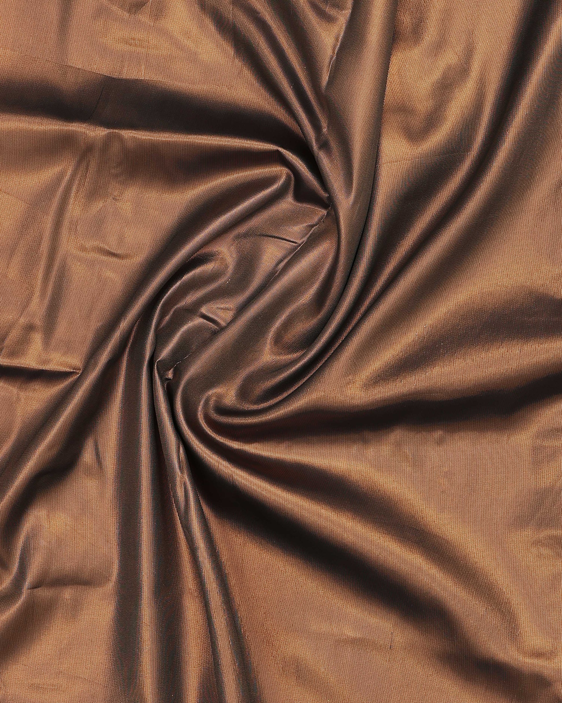 - This classic solid litchi silk saree in a deep copper color features a subtle sheen and a contrasting dark green border with tassels, making it a sophisticated choice for any occasion