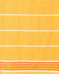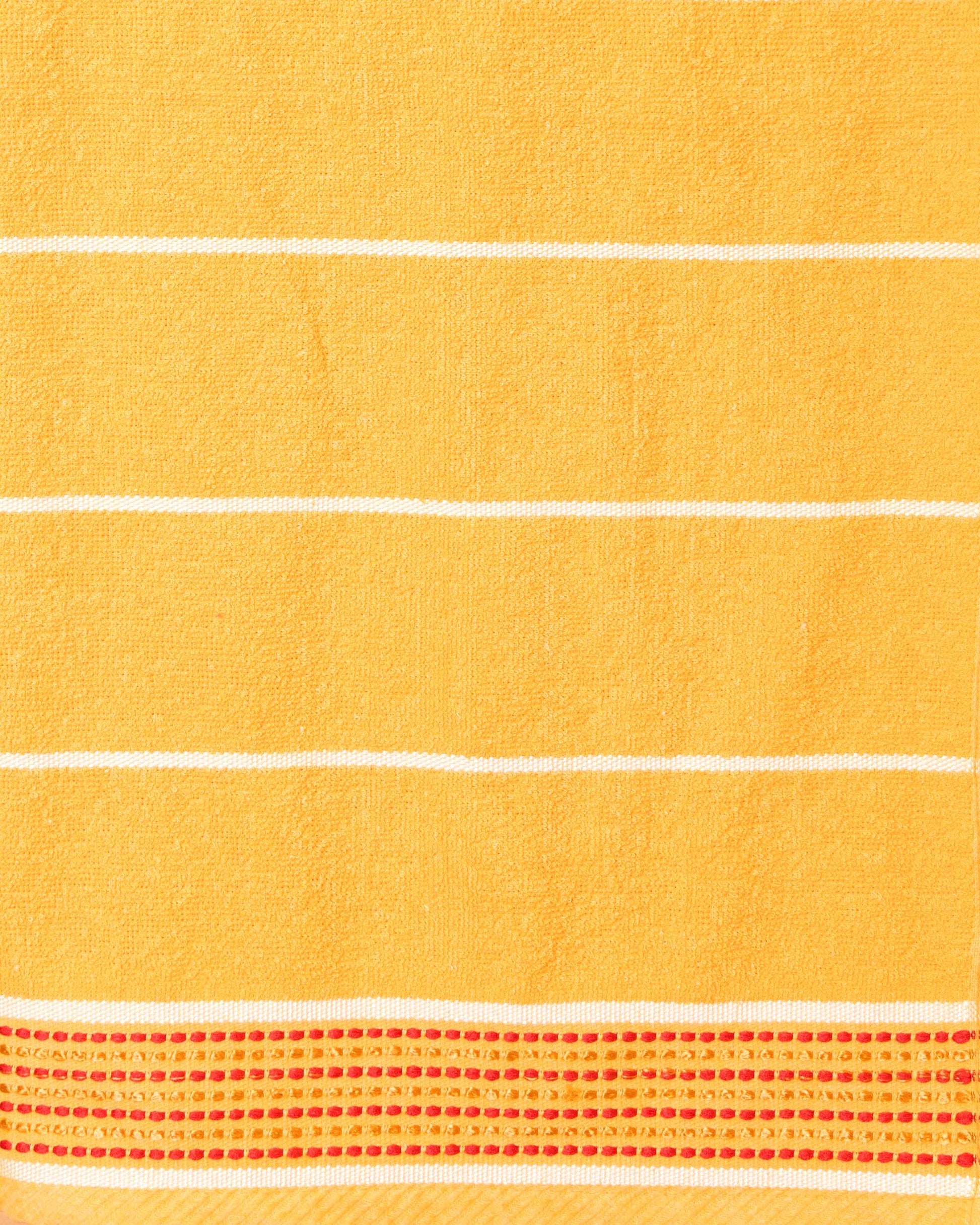 - This vibrant yellow towel classic white stripes and a decorative patterned border at the bottom.
