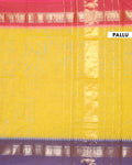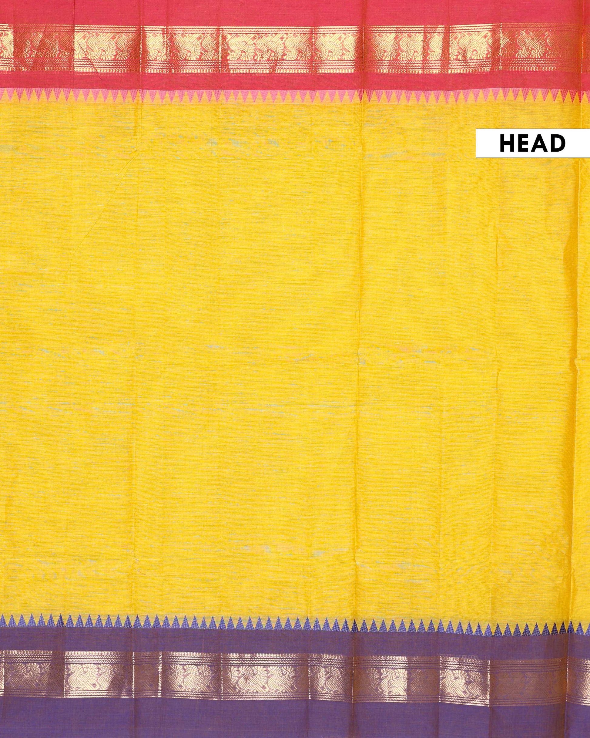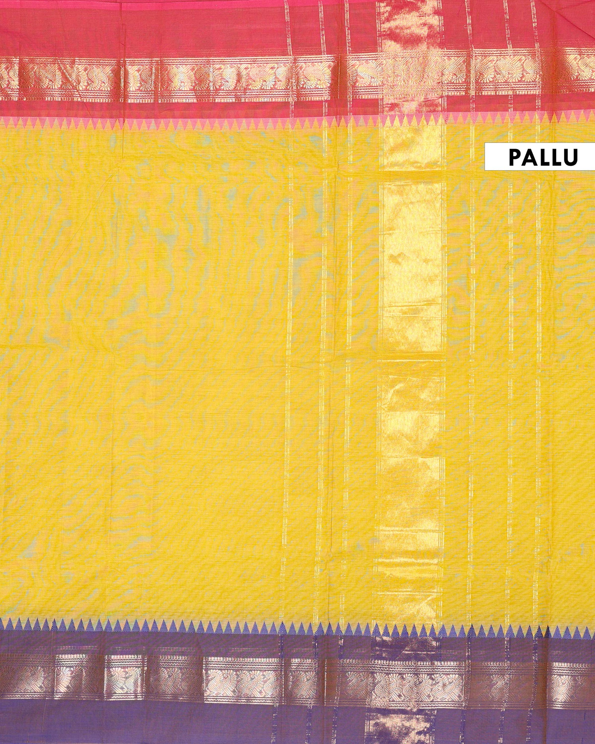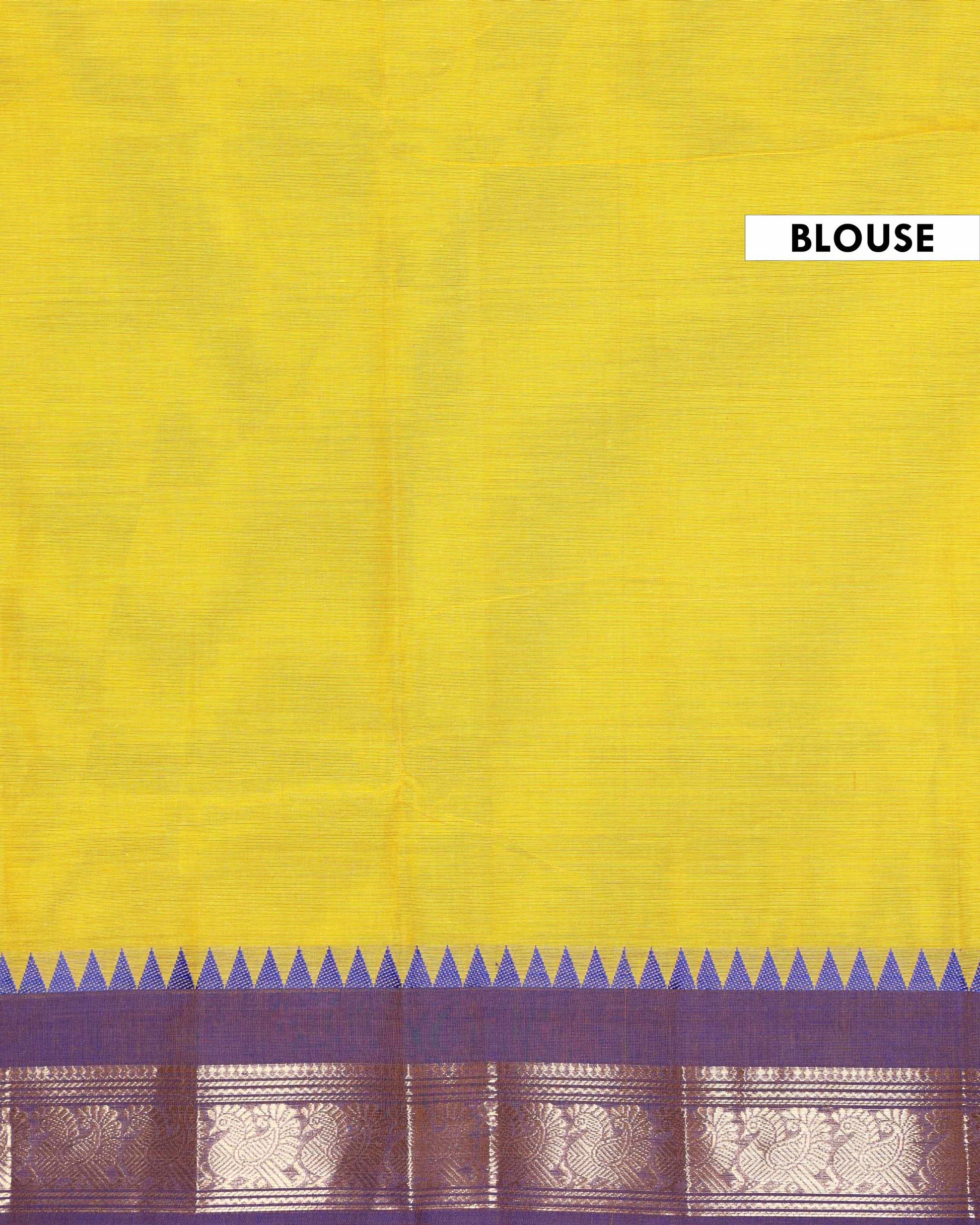 - This stunning Chettinad Cotton Saree a vibrant yellow body and a rich purple border with intricate designs