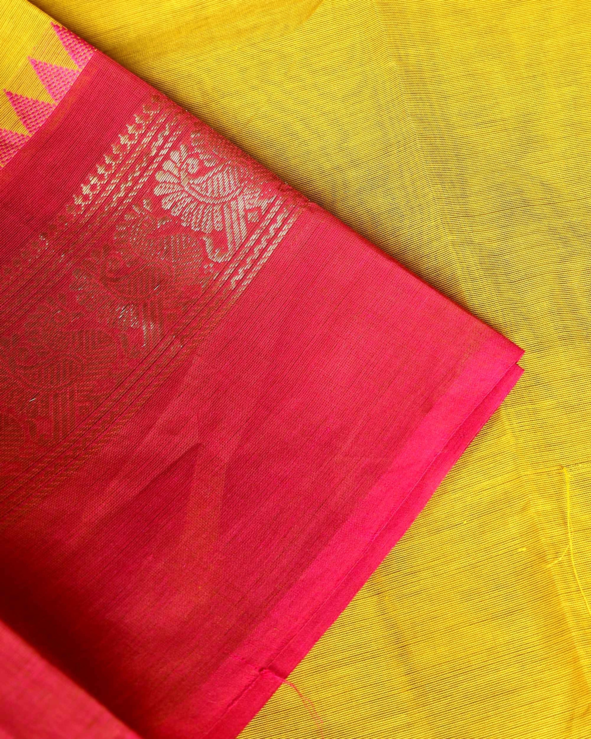 Elegant Traditional Handloom Chettinad Cotton Saree with Woven Temple Border and Intricate Peacock Motif Pallu - Yellow