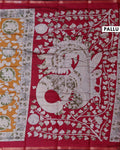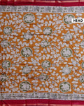 - Elevate your style with this exquisite semi Chanderi Kalamkari saree featuring traditional hand painted motifs and a rich red border.