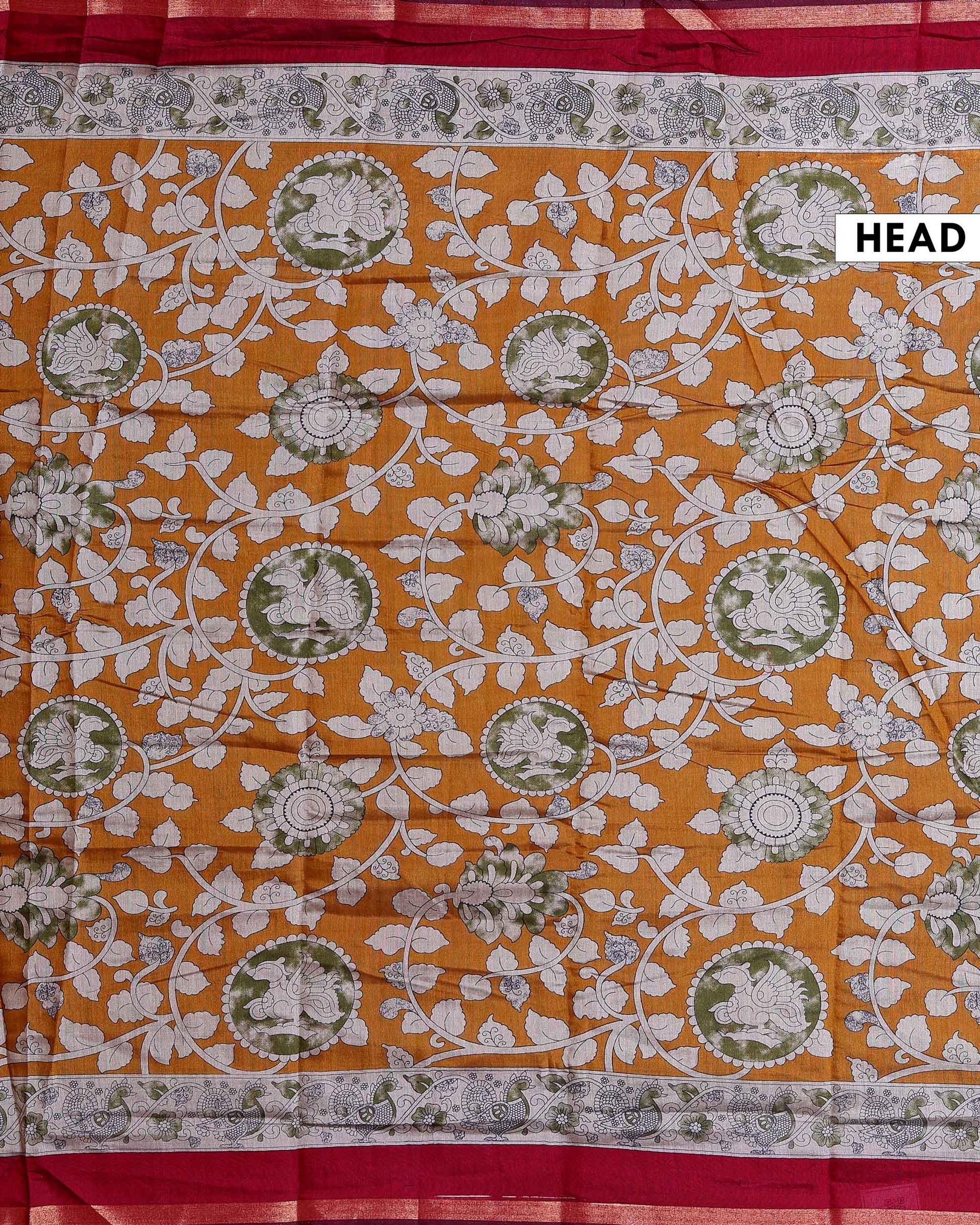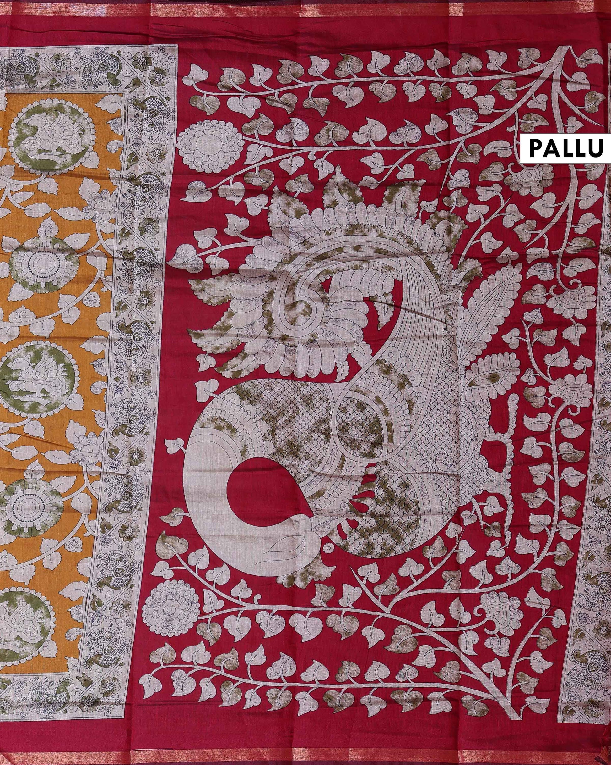 Elegant Traditional Semi Chanderi Kalamkari Saree with Peacock and Floral Motifs with Woven Border - Mustard Yellow