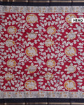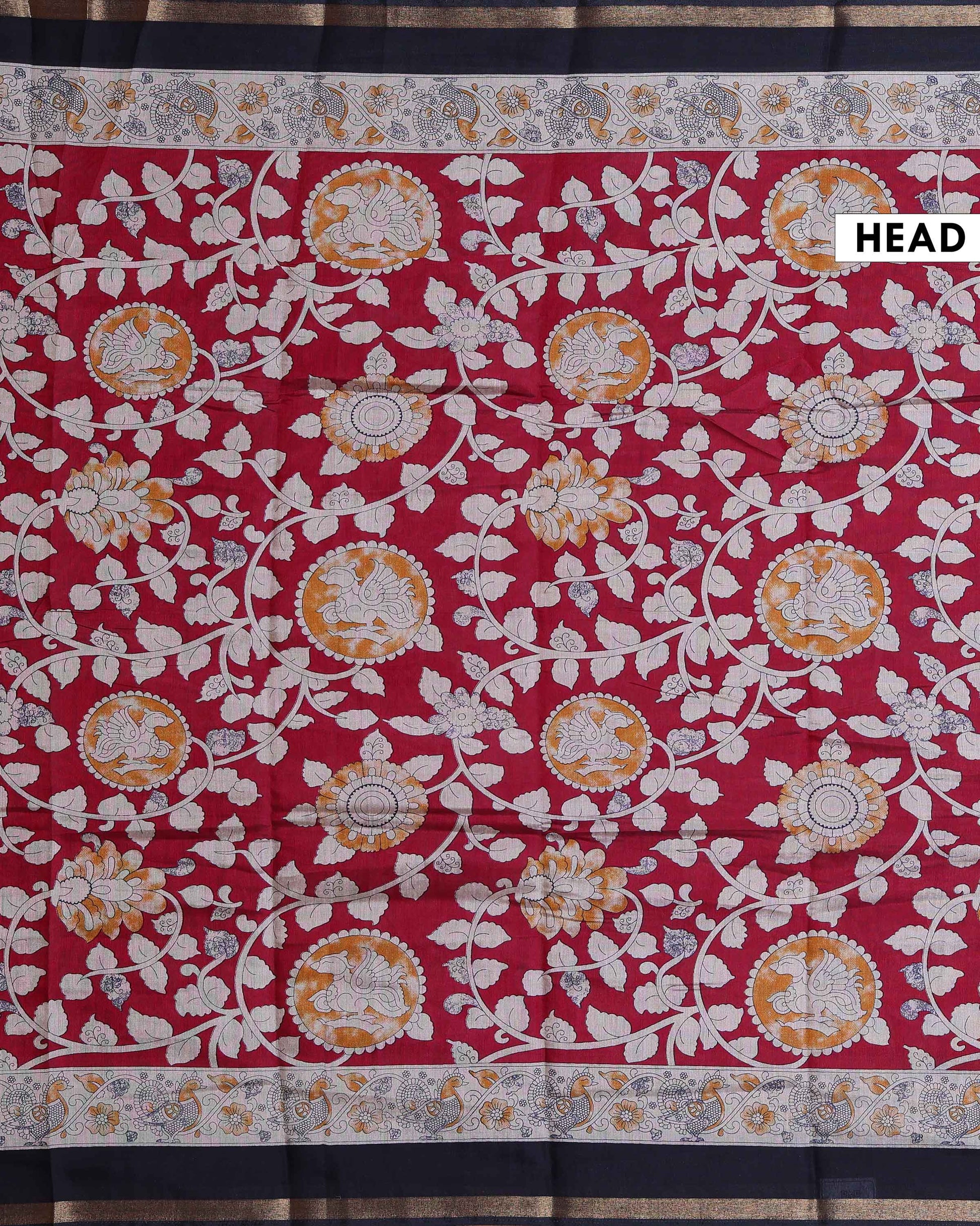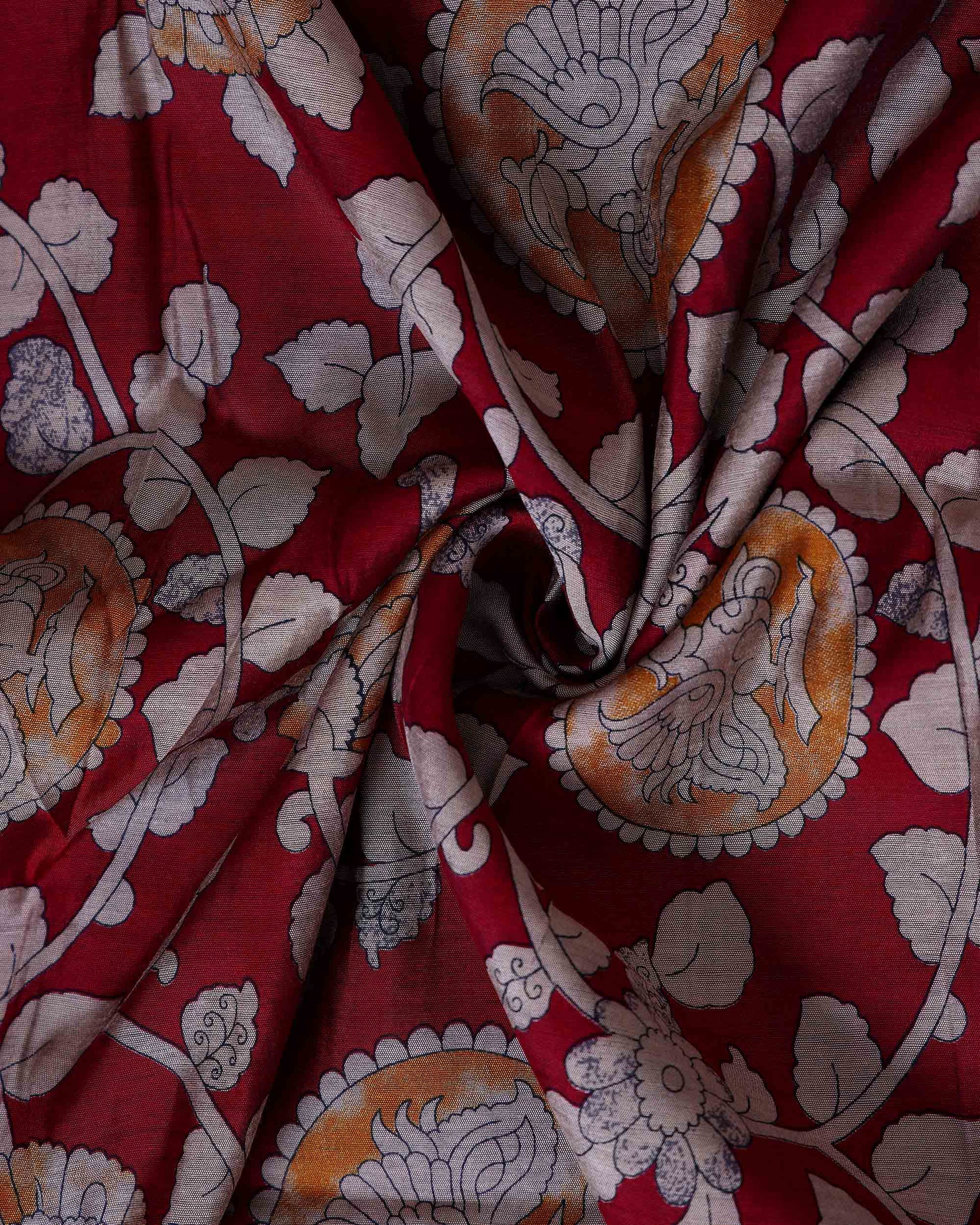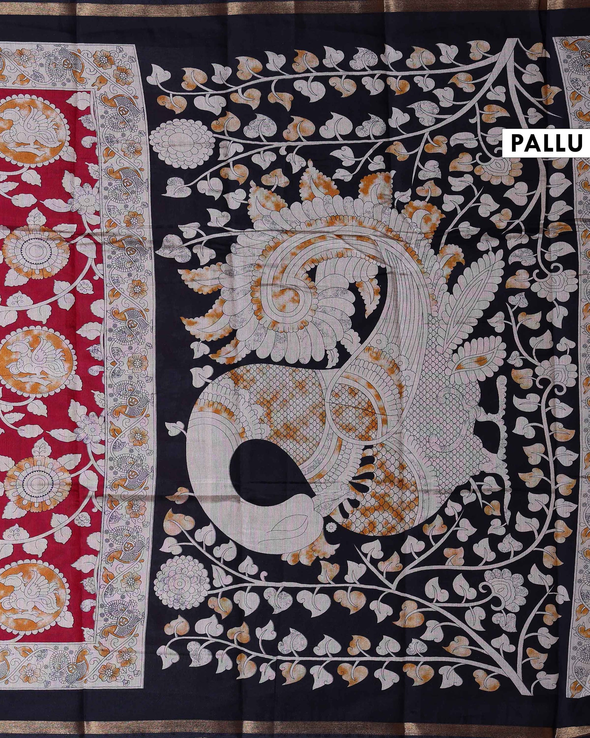 Elegant Traditional Semi Chanderi Kalamkari Saree with Peacock and Floral Motifs with Woven Border - Red