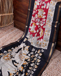 - Elevate your style with this exquisite semi Chanderi Kalamkari saree featuring traditional hand painted motifs and a rich red border.